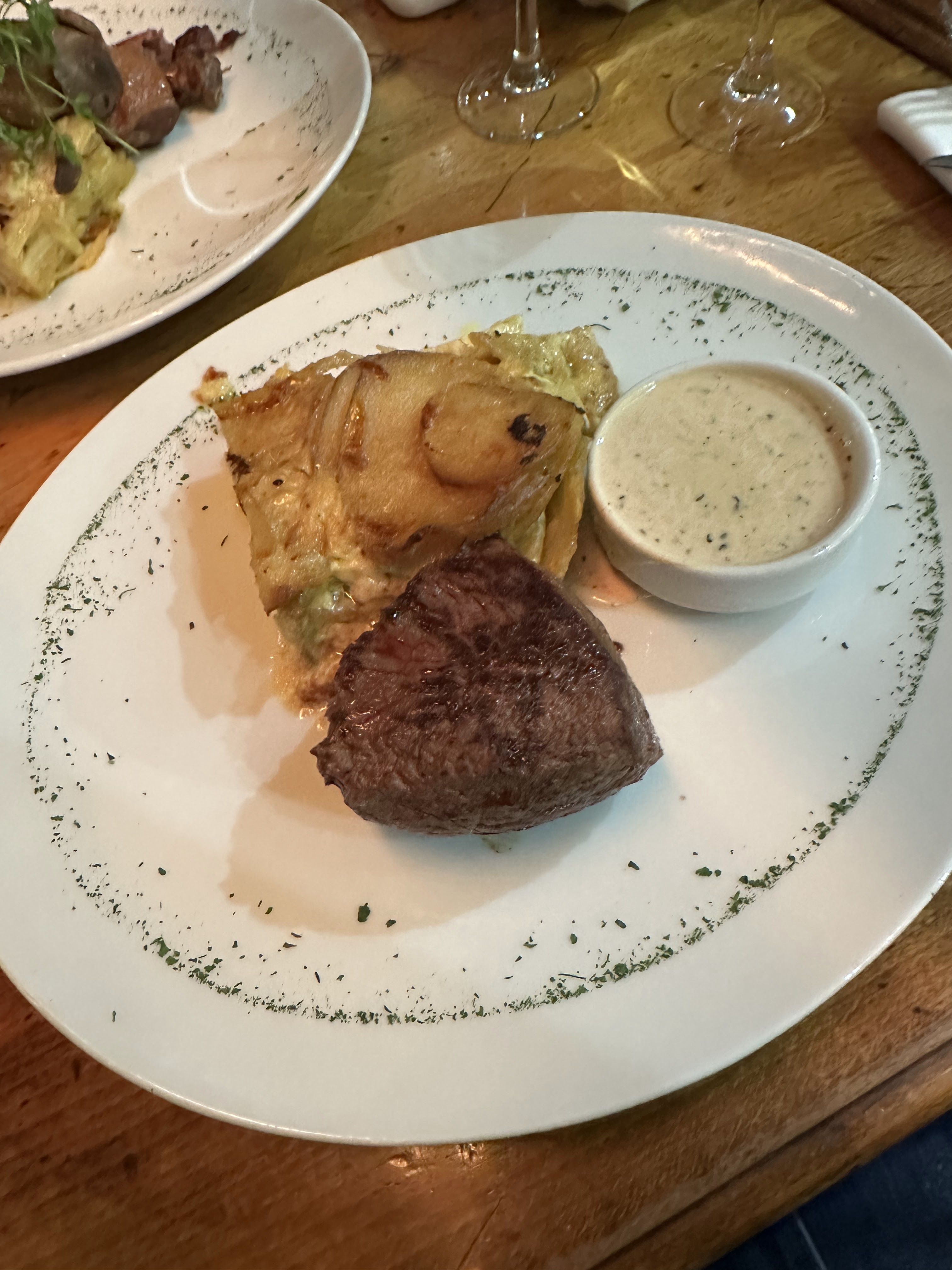 La viande est bonne, les pommes de terre en accompagnement médiocre. La glace bonne, le vin correct. Et surtout on s'est gelés, toutes les portes vitrées étaient grandes ouvertes alors qu'il devait faire 12 à 15 degrés en soirée. Nous avons mangé avec nos manteaux.