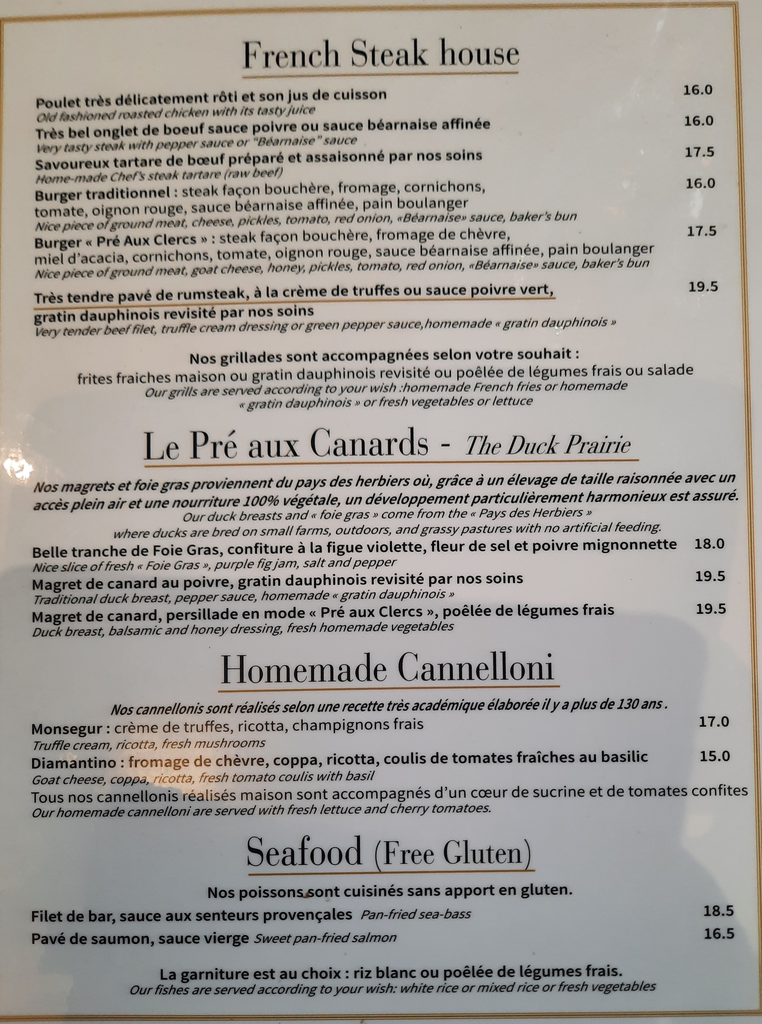 Très bonne soirée passée au pres aux clercs. L’endroit est très agréable et très bien décoré. Les serveurs et serveuses sont professionnels, souriants et de bons conseils. La cuisine est authentique et pleine de goût. Je recommande vivement. Ps: mention particulière pour la mousse au chocolat qui est excellente.