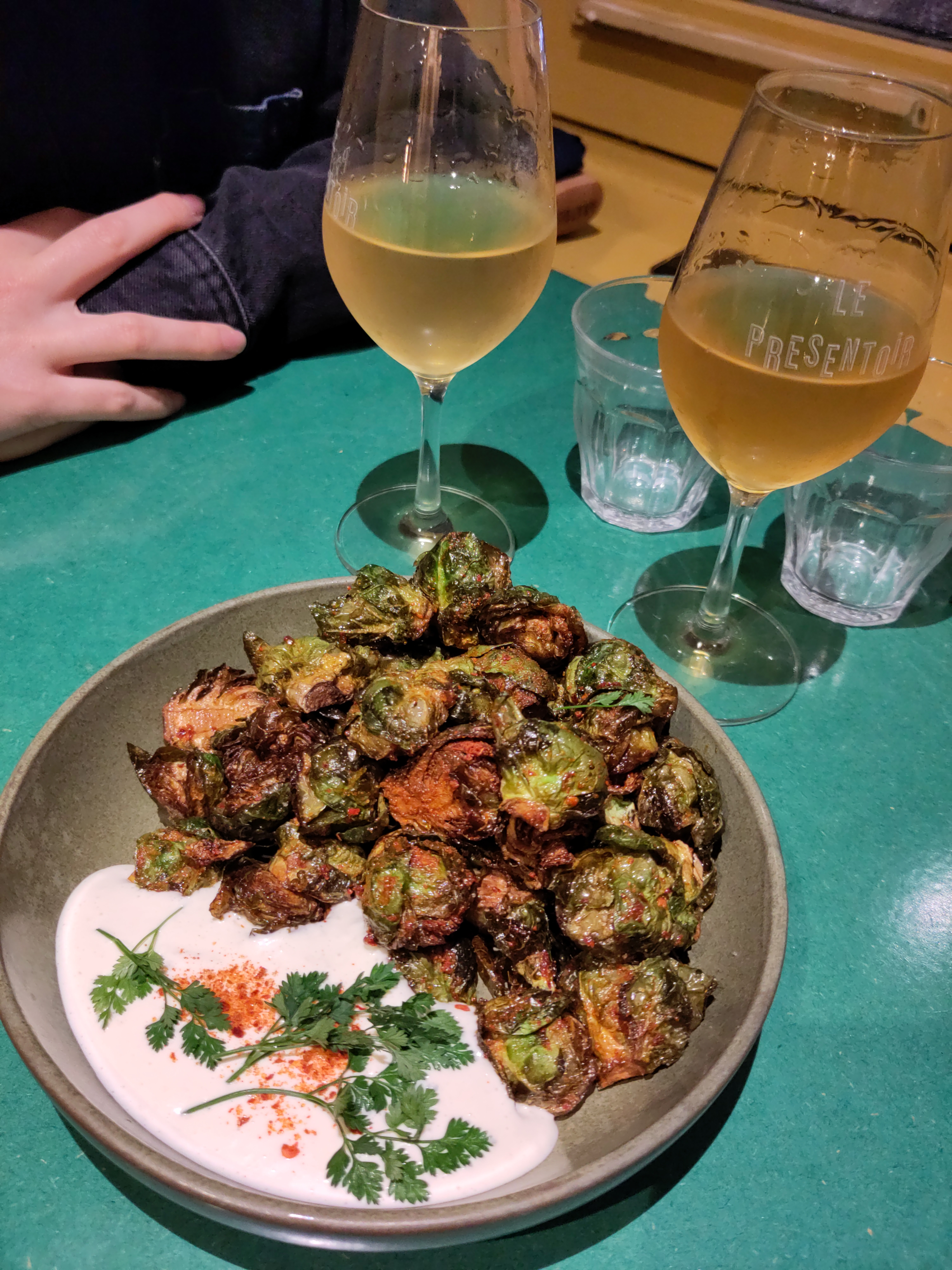 Mazette ces choux de Bruxelles frits avec la mayo citronnée ! Et ces pleurottes avec leur petite sauce au cresson ! C'était bon, très bon ! Et les vins : 👌 La playlist était cool mais un poil forte à l'étage. Ca n'a pas gâché notre expérience. 😁 Merci les amis !