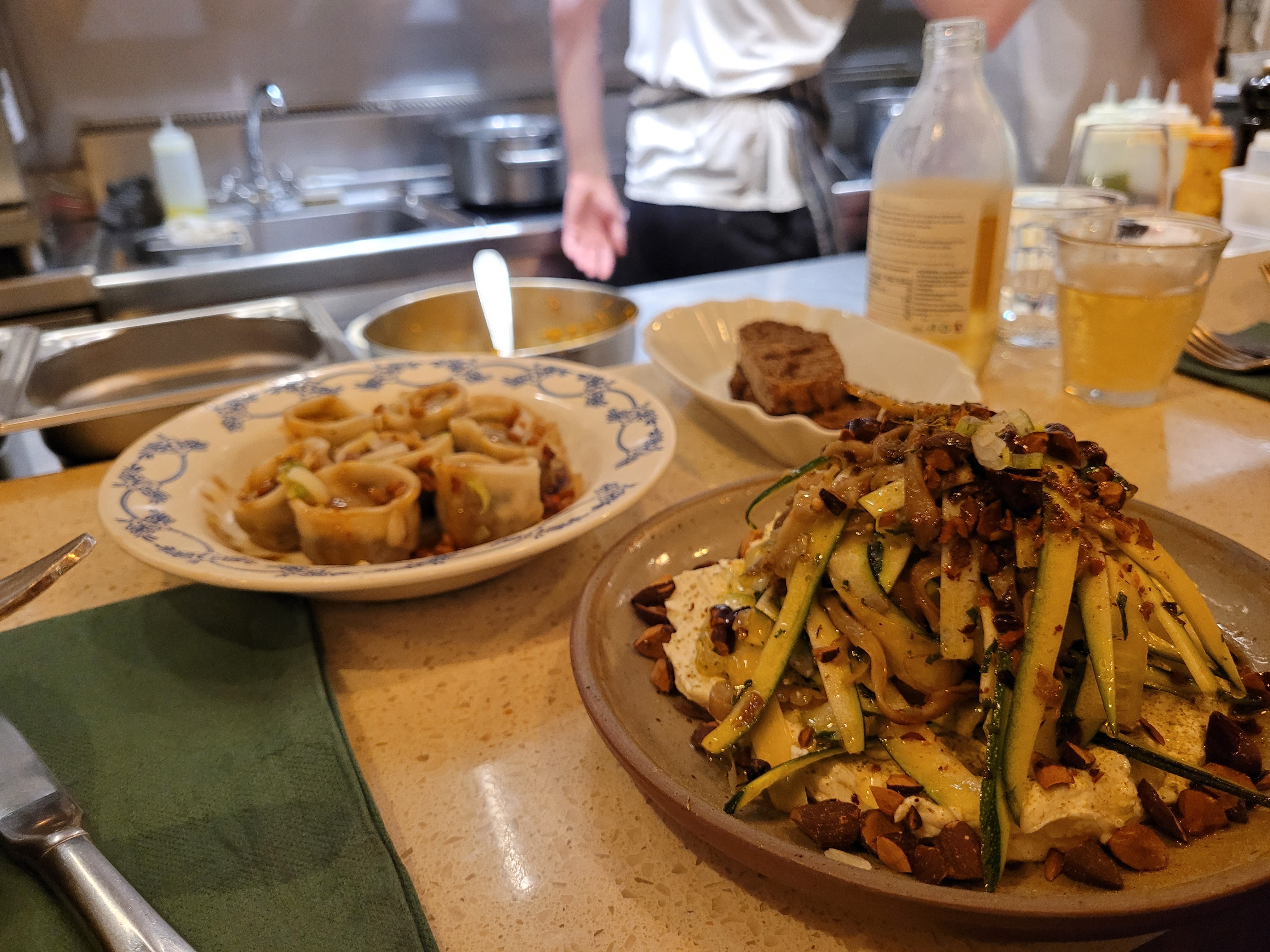 Nous étions 5, avons commandé 10 plats différents à partager, et nous nous sommes tous régalés : association surprenantes de produits er textures, qui laisse exploser les saveurs, mais tout en subtilité. Le tout parfaitement accompagné de vins « nature », sur les très bons conseils du sommelier à notre écoute (et belle liste de vins oranges pour les amateurs).