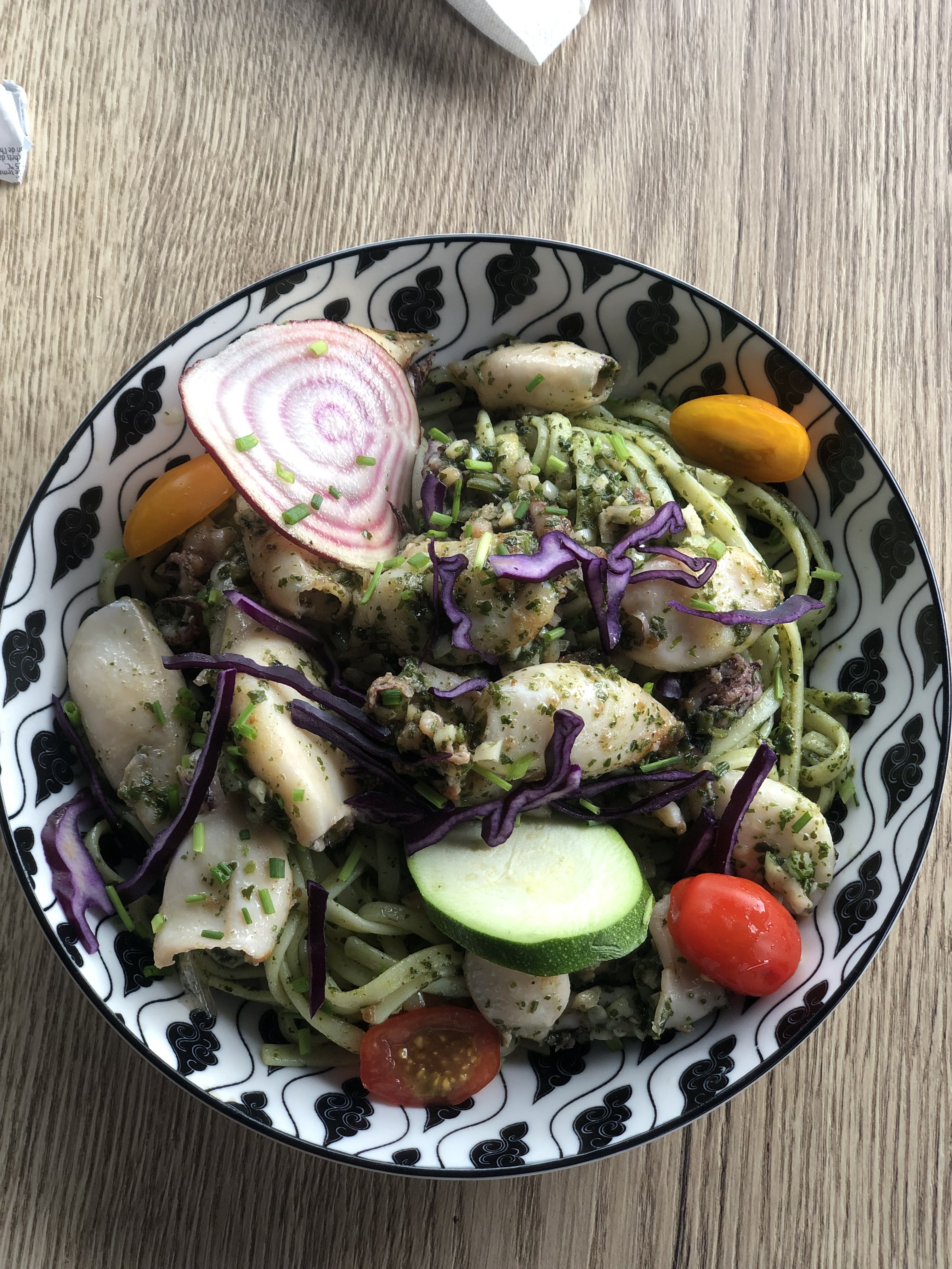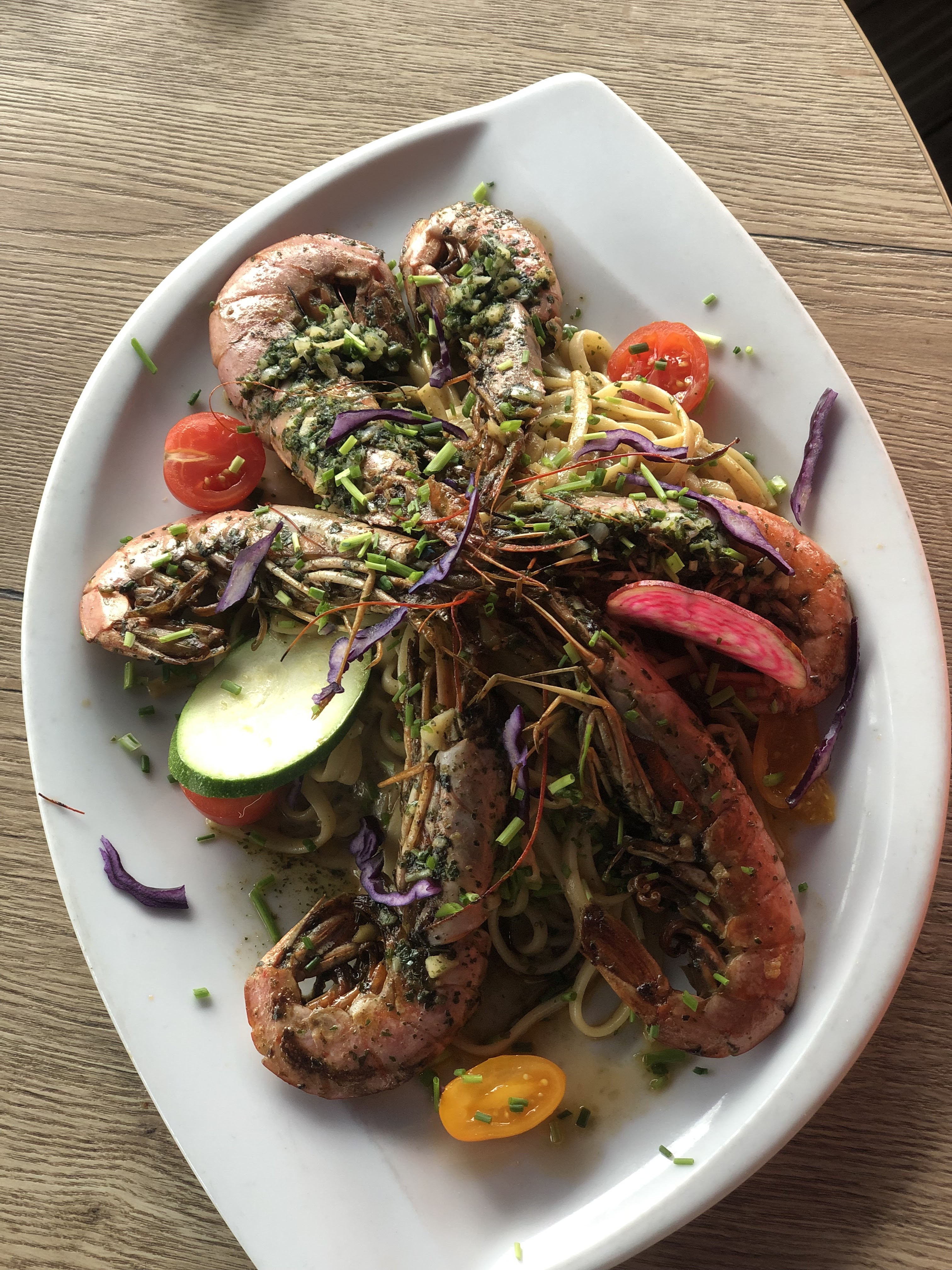 J´avais pris les gambas aux liguines sauté au Porto, je les aies trouvé un peu ferme, j´avais du mal à récupérer la chair. Et la petite serveuse , je venais à peine de poser ma fourchette ds l´assiette qu'elle me retire mon assiette. Même pas eu le temps d'y passer un petit bout de pain.