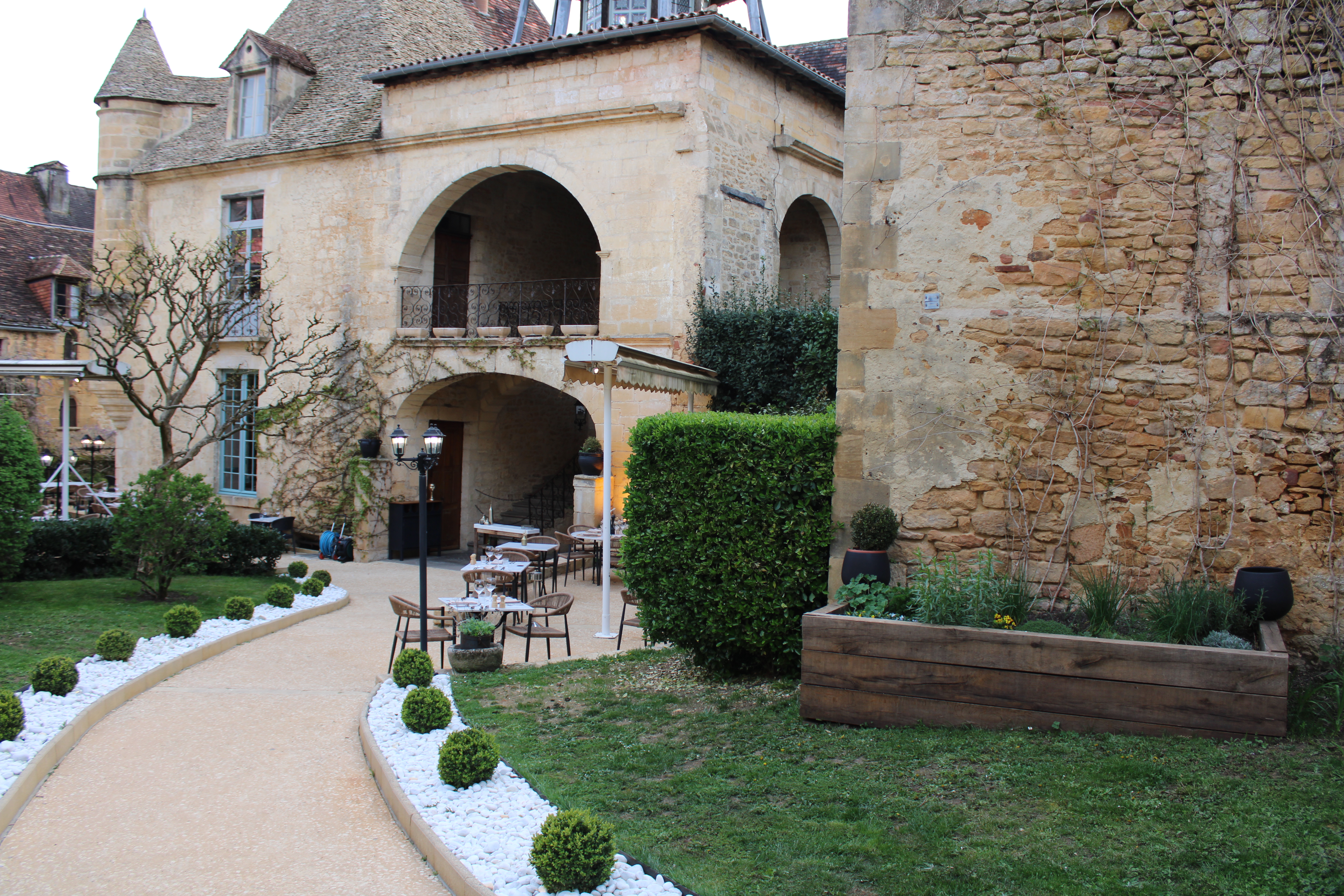 Le cadre est absolument magnifique loin des terrasses bondées du centre de Sarlat. Le menu à 29.50 est correct, sans plus. Disons que le prix est nettement supérieur à la qualité. Le verre de Bergerac blanc ou rouge à 5€ est très décevant. Le service est rapide, c'est appréciable mais globalement manque d'harmonie et n'est pas à la hauteur du lieu. Encore un restaurant qui souffre d'être dans une cité envahie par les touristes. Je retournerai toutefois dans ce restaurant dans une période moins chargée.
