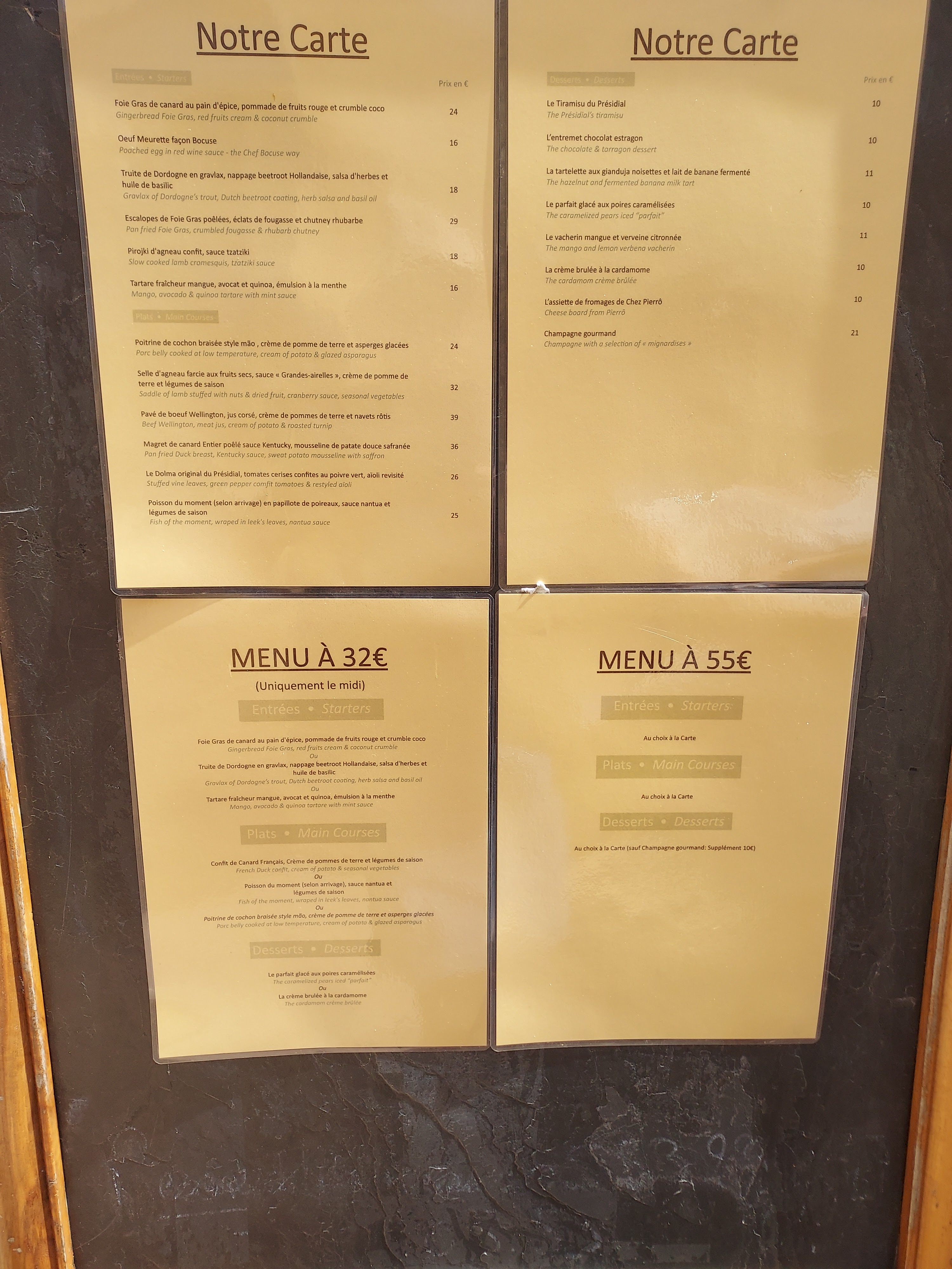 Une table de 4 avec 2 nourrissons en poussette. Quand certains restaurateurs vous voient arriver d'un mauvais œil, au Presidial on reçoit votre famille avec bienveillance et professionnalisme (petit pot chauffé, un coin tranquille pour les poussettes et les bébés, la patience du personnel pour attendre de prendre la commande quand nous nous occupions des petits...) . A ça s'ajoute une cuisine de qualité pour des prix abordables et dans un cadre splendide et calme malgré la localisation du restaurant (hypercentre). Une adresse que nous recommanderons à qui sera de passage sur Sarlat.
