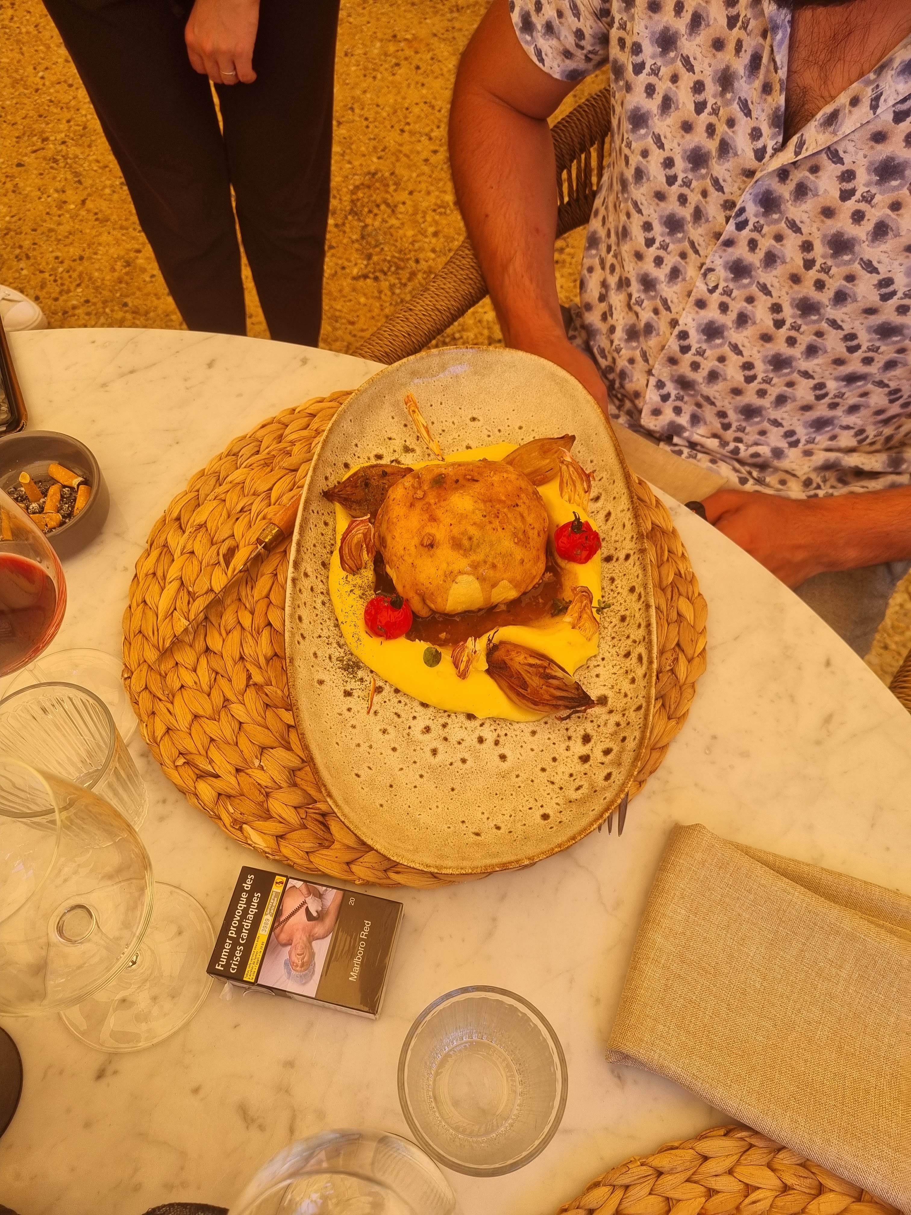 Attente longue (3heures au restaurant) Hors d'oeuvres très correct plat pas formidable dessert très moyen mesurés covid : personnel dans masque juste une visière qui ne couvre que la bouche. Fumeurs et non-fumeurs mélangés mauvais rapport qualité prix. Juste très beau cadre extérieur