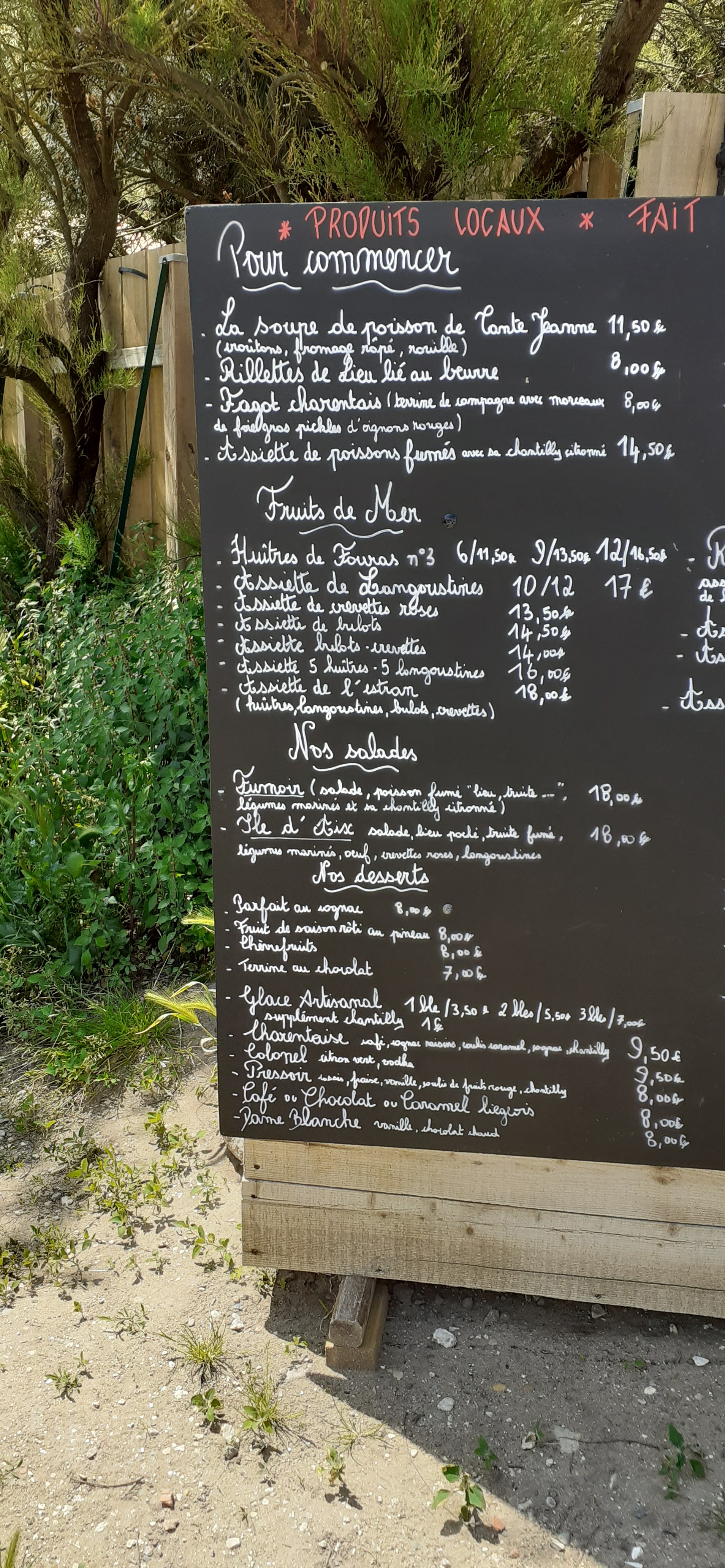 Bonjour, j'ai vraiment apprécié le menu : raie grillée au feu de bois accompagné de petit légumes, un vrai délice. Merci. Si vous allez sur l'île d'Aix, faites le détour cela vaut la peine. Le personnel est top aussi, aux petits soins