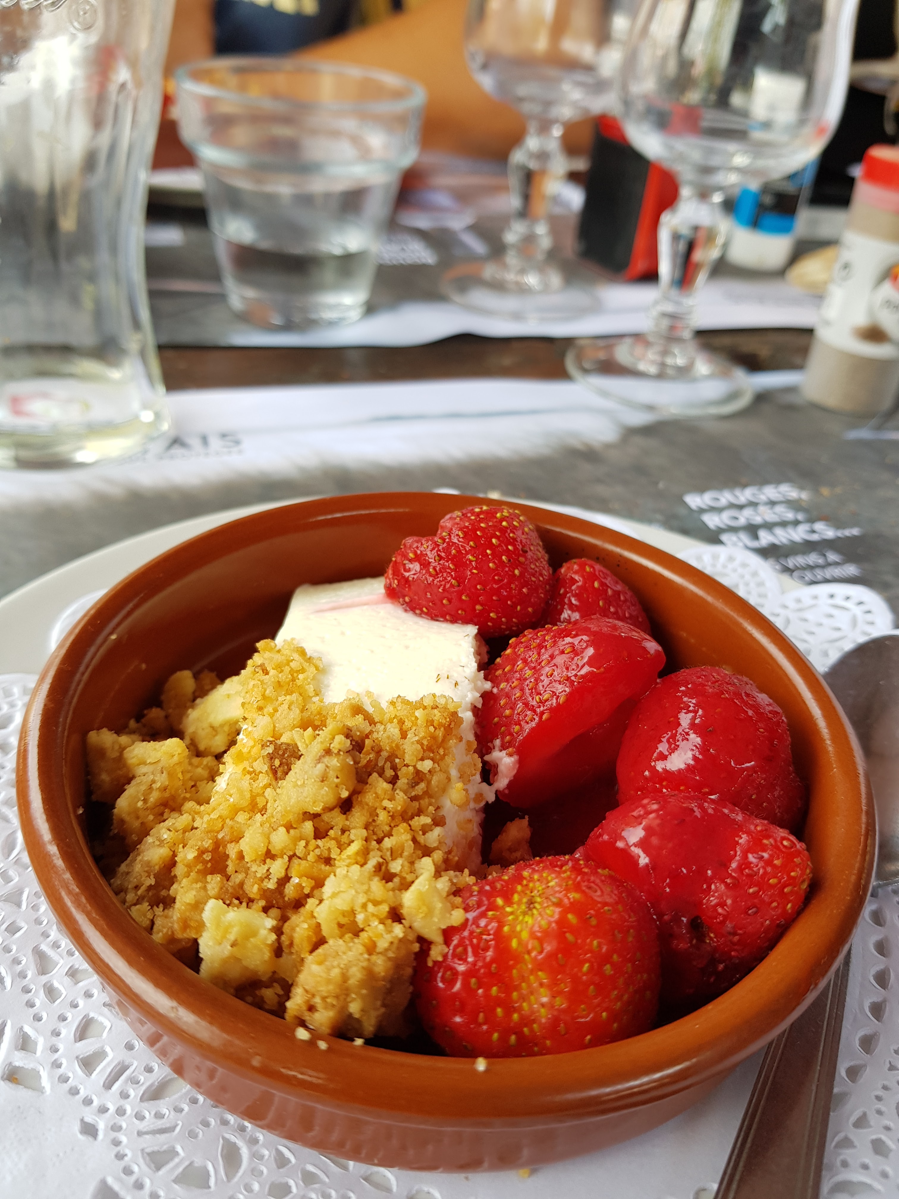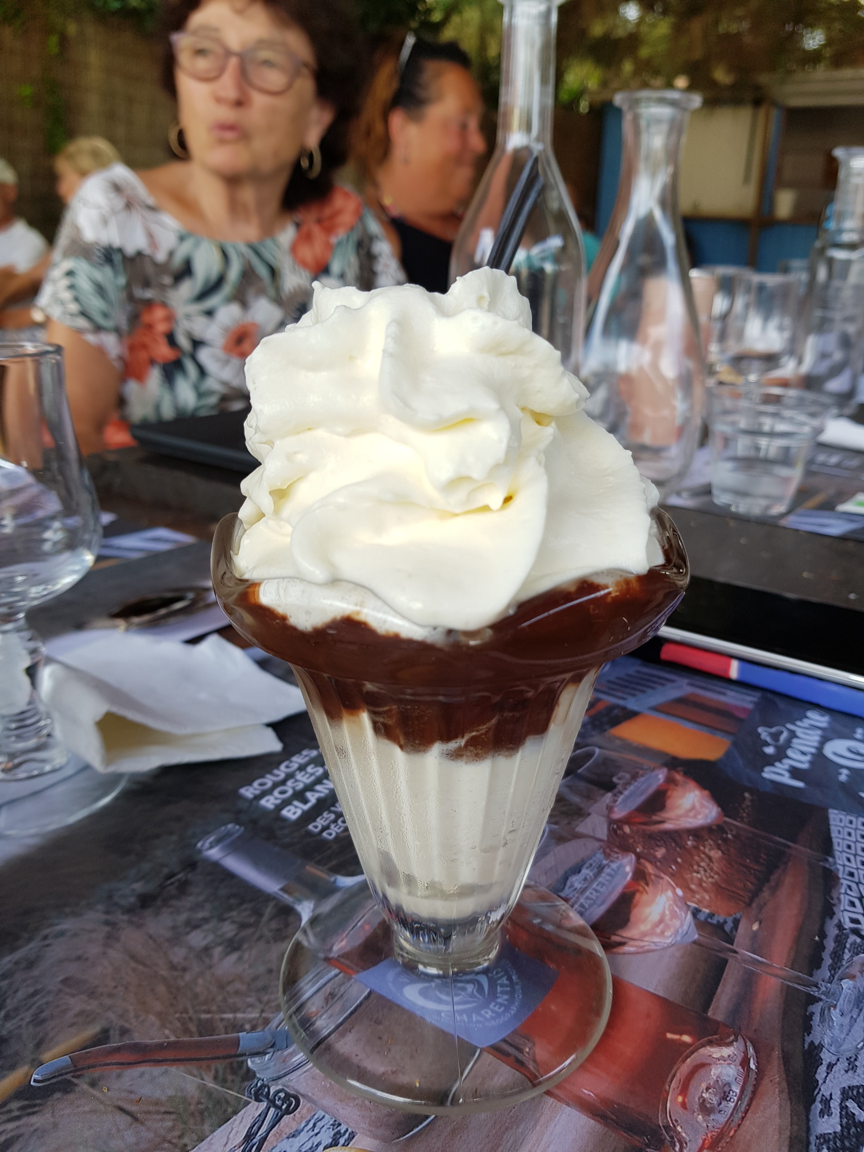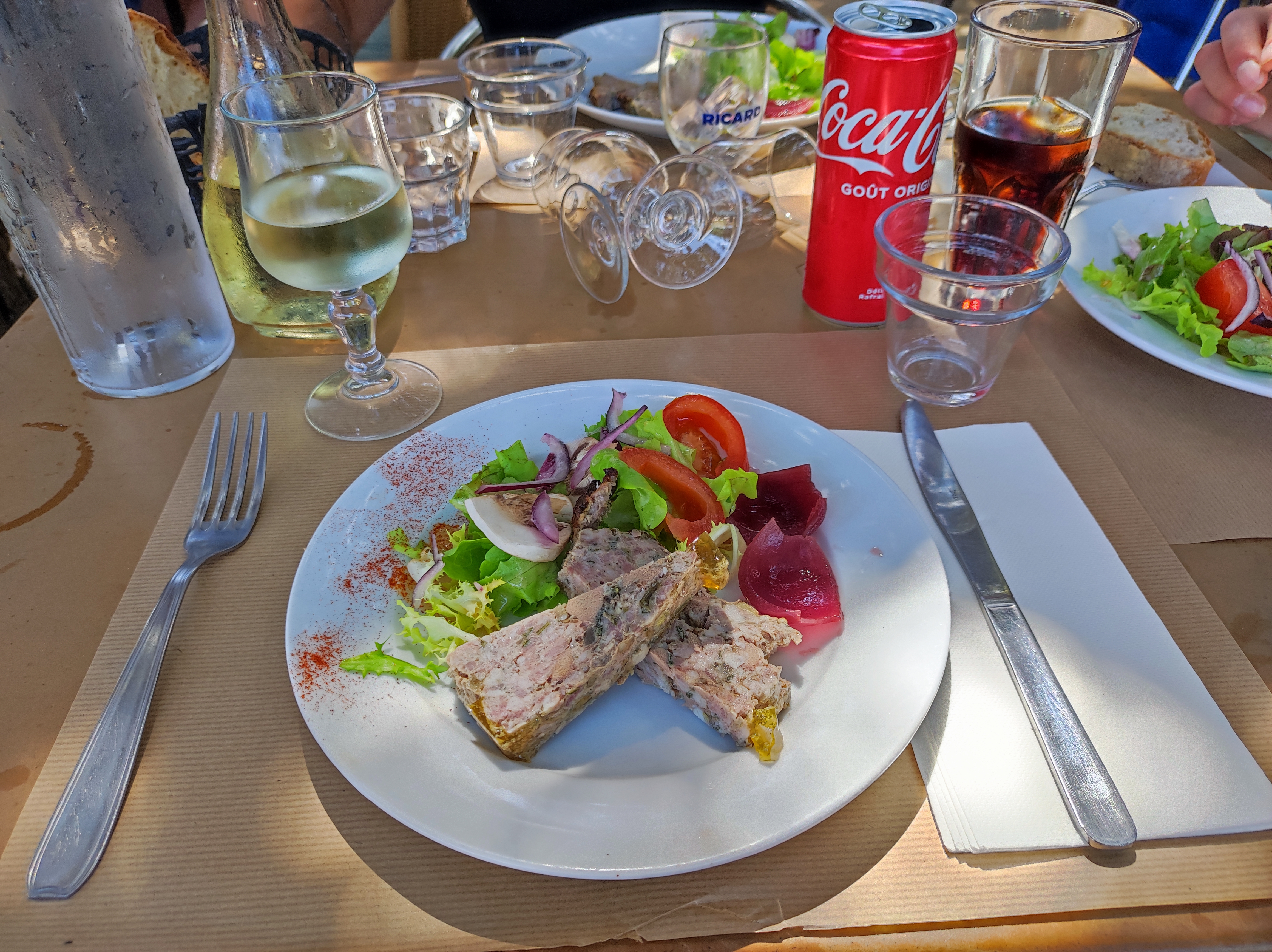 Malgré le casse tête pour essayer de gérer le flux de touristes, l’accueil est quand même présent, le repas est servit assez rapidement ! Andouillette pour ma part, elle était parfaitement grillée ! La grande terrasse sous les pins est plus qu’agréable par forte chaleur !