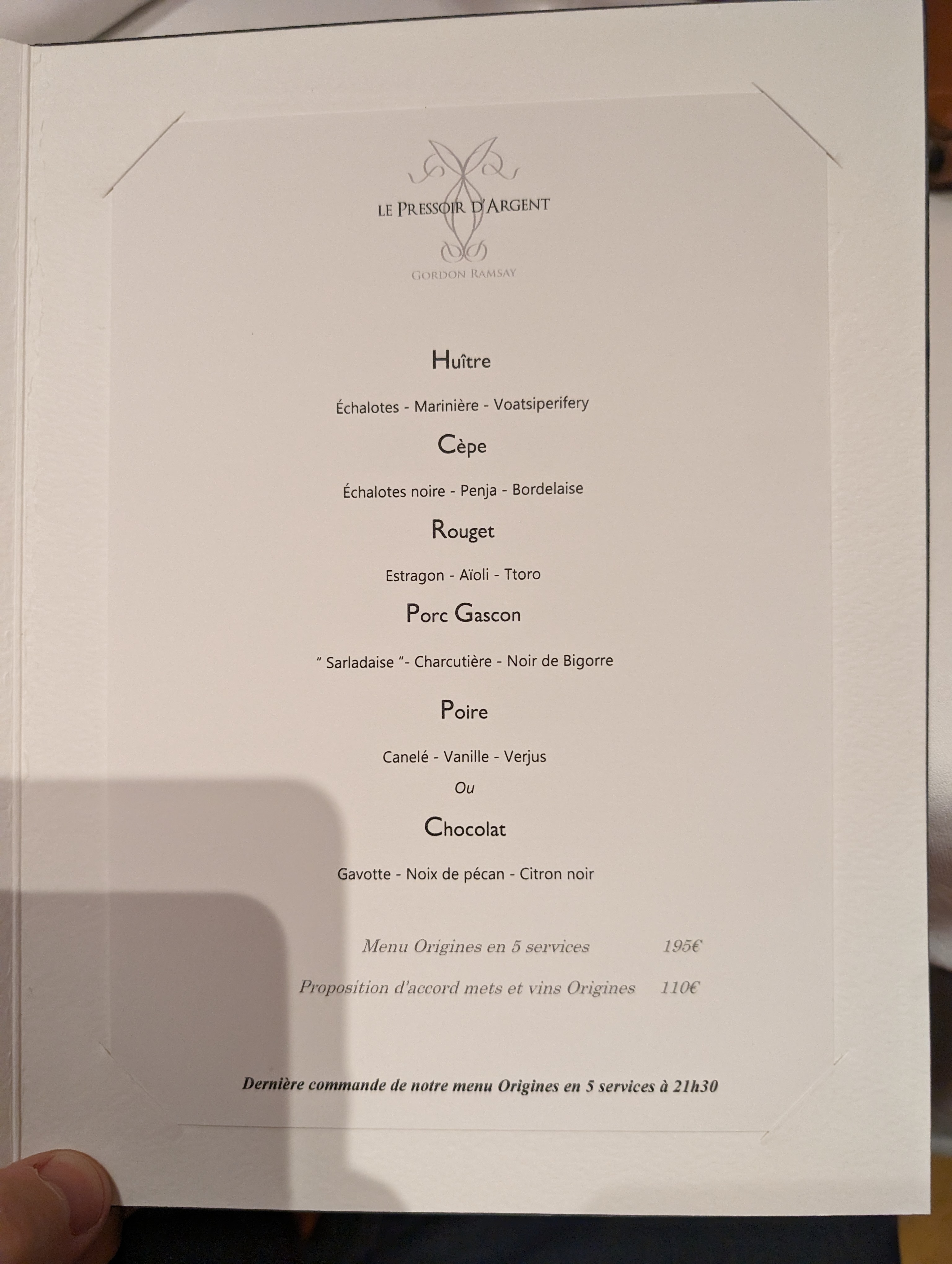 Le mot parfait a été créé pour Gordon Ramsay et toute son équipe de Bordeaux. Aucun bémol du début à la fin. Le service, la connaissance du bout des doigts des produits et des vins par le personnel est juste incroyable, à l’écoute à nos petits soins, gestes d’attention, le cadre et l’ambiance, le confort à table (moi qui suis enceinte de 7,5 mois) le voyage culinaire des mises en bouche jusqu’au dessert et enfin les petits cadeaux en sortant, bref tout était parfait, un conte de fée dont on ne souhaite jamais en sortir ! Mille merciiii