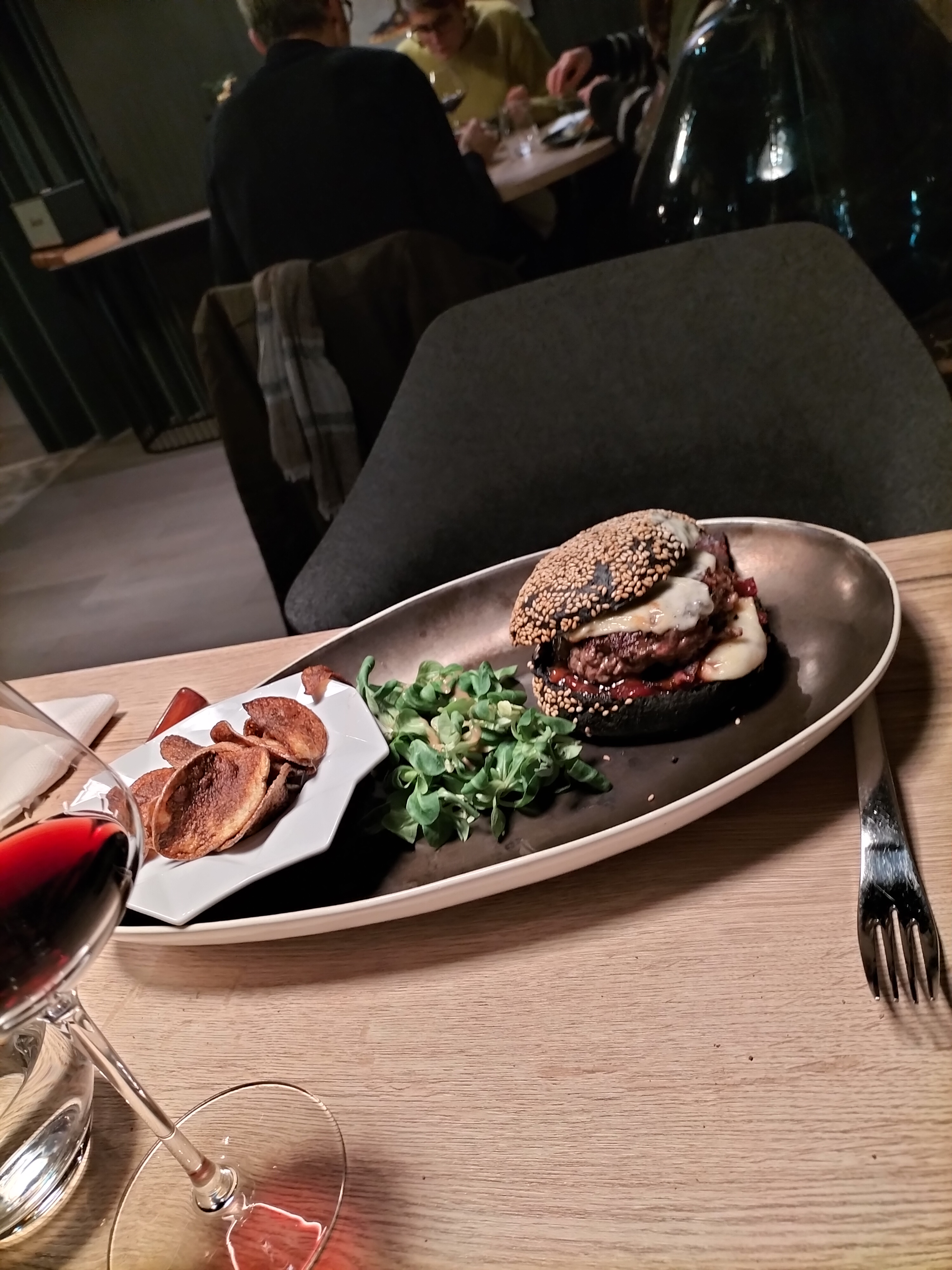 Très bon restaurant et décoration soignée Le hamburger avec son pain à l’encre de seiche servi avec ses chips de légumes anciens, un régal !