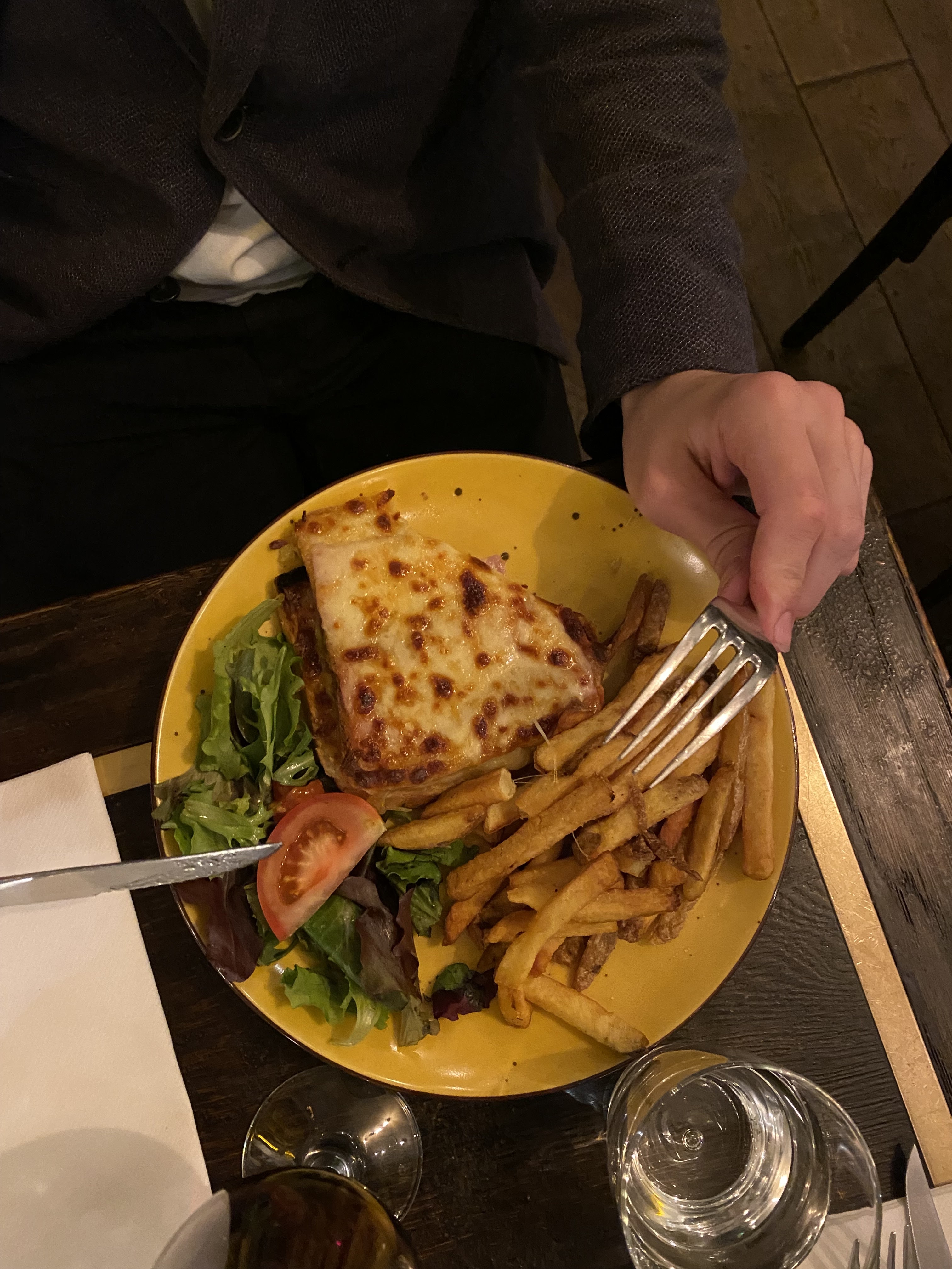 Attiré par la devanture, ainsi que des clients dégustant un croque monsieur accompagné de frites et de salade, j’en suis venu à en commander également. Place très agréable et convivial avec musique d’ambiance adaptée. La nourriture fut satisfaisante et le service rapide ~15min