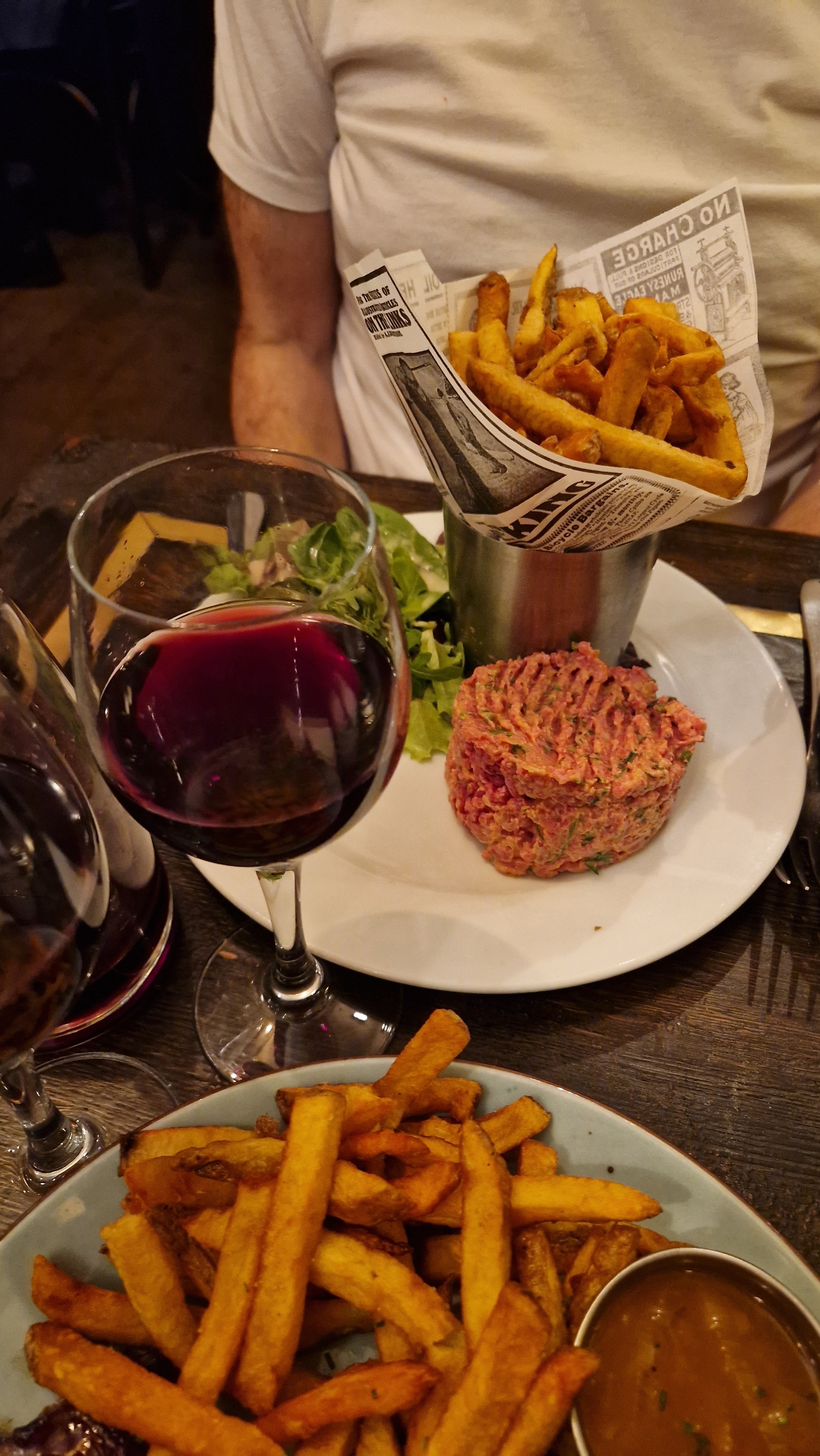 J'adore ce restaurant! :) cela ne déçoit pas à chaque fois que vous y allez, et cela ne ressemble pas à un piège à touristes. Les prix des aliments sont toujours raisonnables, l'ambiance et la qualité de la nourriture sont toujours excellentes. Les serveurs pourraient avoir plus de caractère, mais au moins ils sont attentifs à vos besoins. Je veillerai à amener mes visiteurs ici. Merci le prince racine ! Vous êtes un joyau dans le quartier latin trop touristique ! Voici une délicieuse photo de mes bavette échalotes (14€) avec des frites et un verre de Côte de Rhône bio (5,6€) les garcons(?) c'est le nom..je crois ? En tout cas... miam ! Et à bientôt les gars !