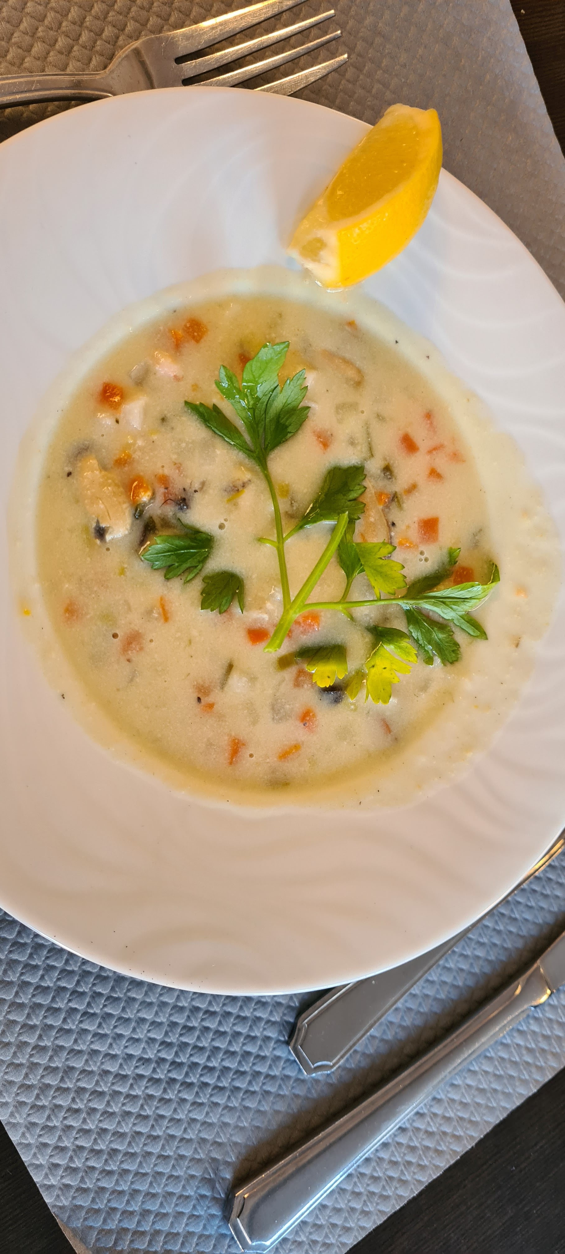 Rapport qualité prix honnête (seule raison pour que ça ne finisse pas à 0) Repas réservé en même temps que la chambre confirmé à notre arrivé à l’accueil… à l’arrivé au restaurant on nous dit d’abord non que le chef ne veut pas car notre nom n’est pas sur la feuille de réservation alors même qu’il est 20h30 et qu’ils peuvent accueillir encore au minimum une cinquantaine de couvert… Après avoir été installé on attend 40 minutes pour une soupe et une entrée de fruits de mers à peine décongelés On apostrophe 4 fois un serveur pour une carafe avant de me lever pour la réclamer. Ma compagne renverse son verre on ne lui apporte même pas une serviette … Service nul !