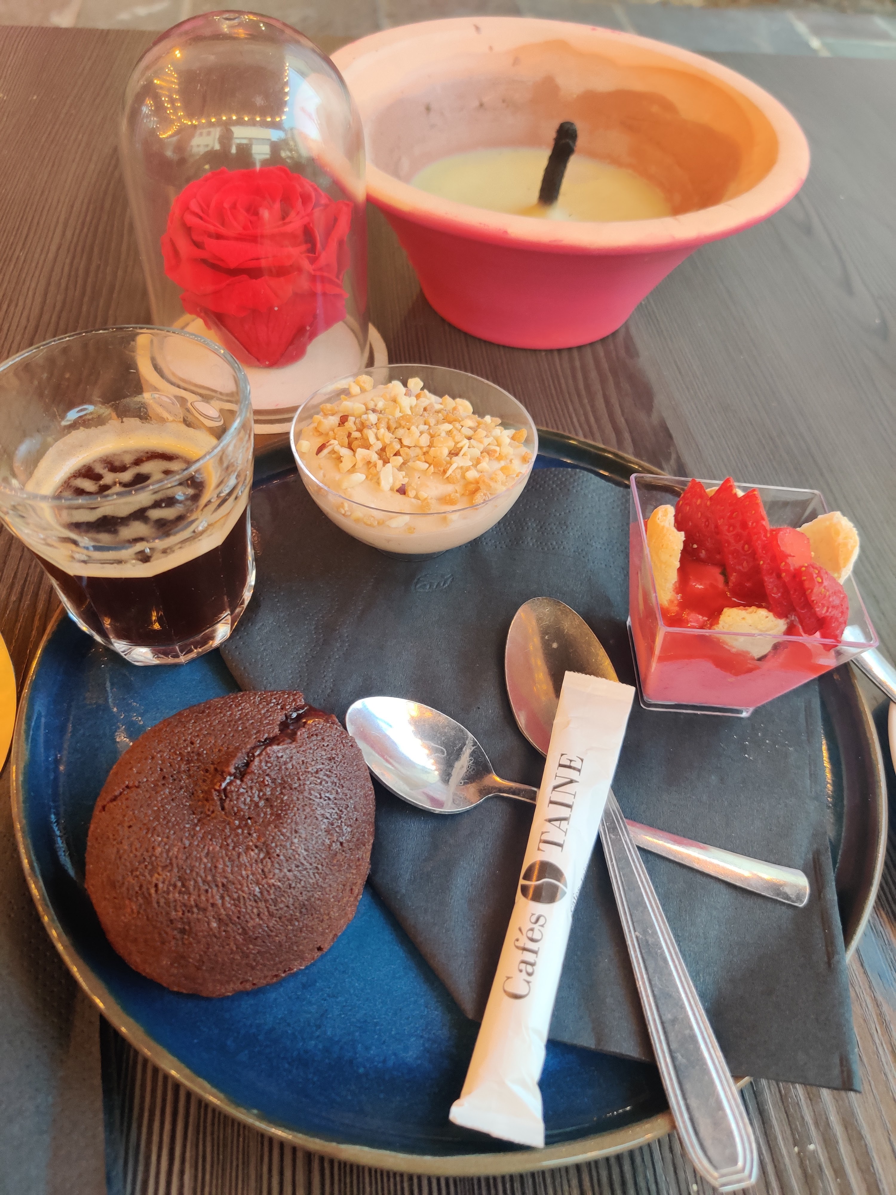 Repas de la saint Valentin (59€) Tout commençais bien dans un cadre sympa et endroit cosy au premier étage. L’entrée (tartare de saumon) était très bonne et bien assaisonné. Je recommande. Le plat (carré de veau ) était servi en (très) bonne quantité, mais la qualité laissait largement à désirer (noir a l’extérieur , sec a l’intérieur) les 3 purées qui l’accompagnaient était bonne en revanche, mais tout de même déçu de ce plat qui met très mal en valeur la viande. Enfin le dessert de la saint Valentin (pomme d’amour) était tout simplement immangeable. La « généreuse » couche caramélisé rendait la pomme solide comme un caillou, si bien qu’il était impossible de l’ouvrir ou de croquer dedans. Servi sans couvert, nous avons fini par l’ouvrir en faisant un levier entre une fourchette et un couteau subtilisé dans la table voisine , pour uniquement prélever le fruit a l’intérieur. Très déçu Habitant juste en face, j’aurai aimé faire une belle découverte. La prochaine fois j’irai voir ailleurs