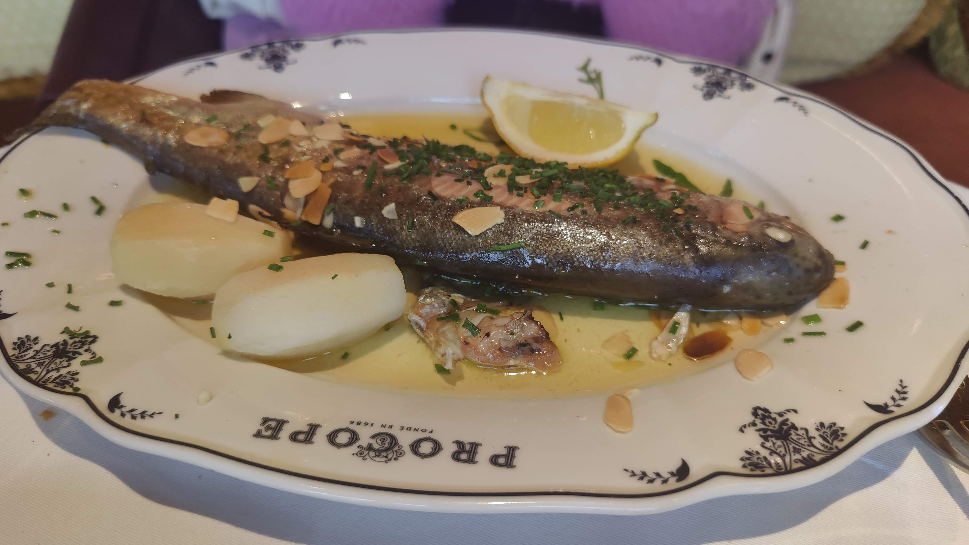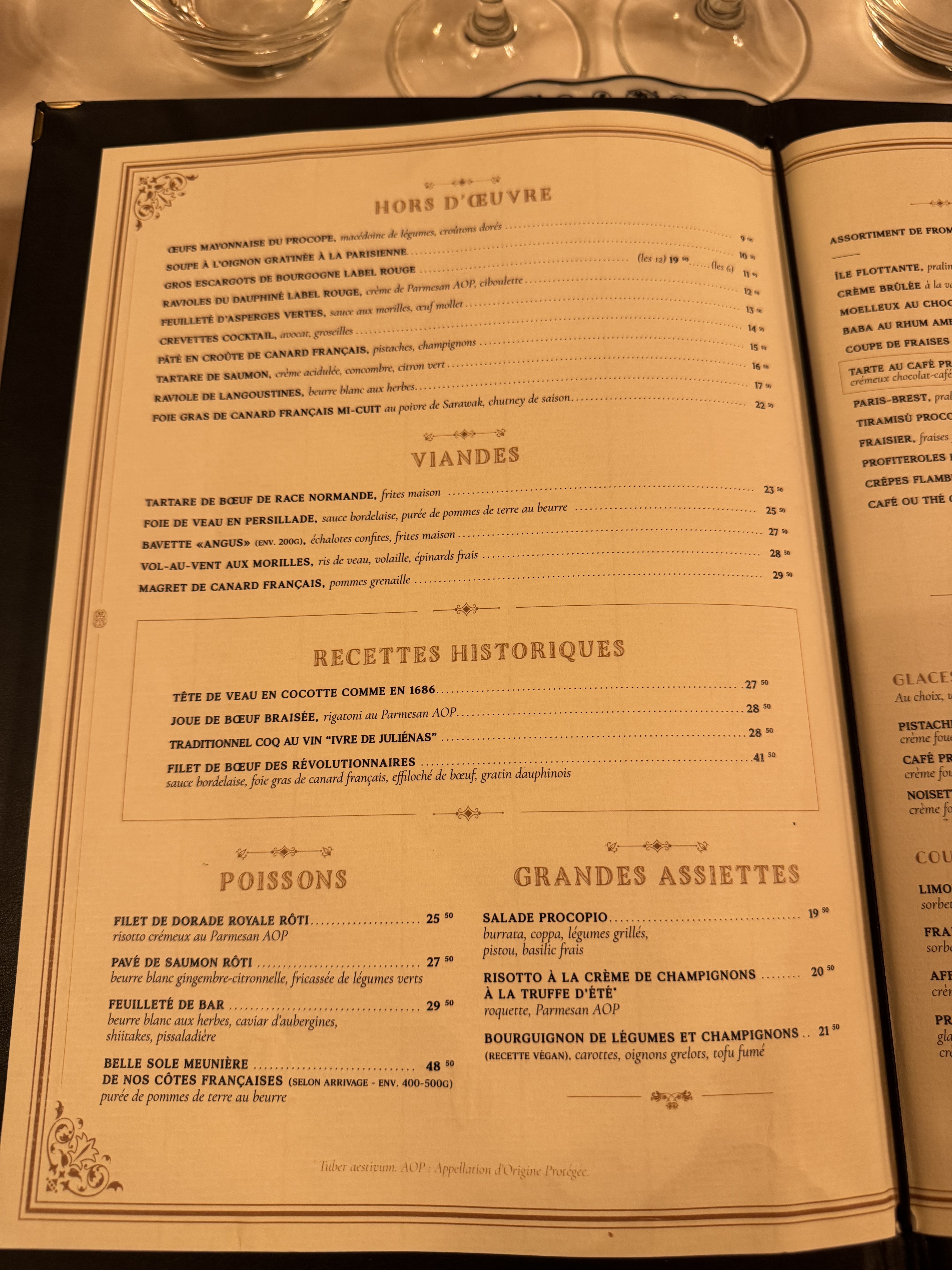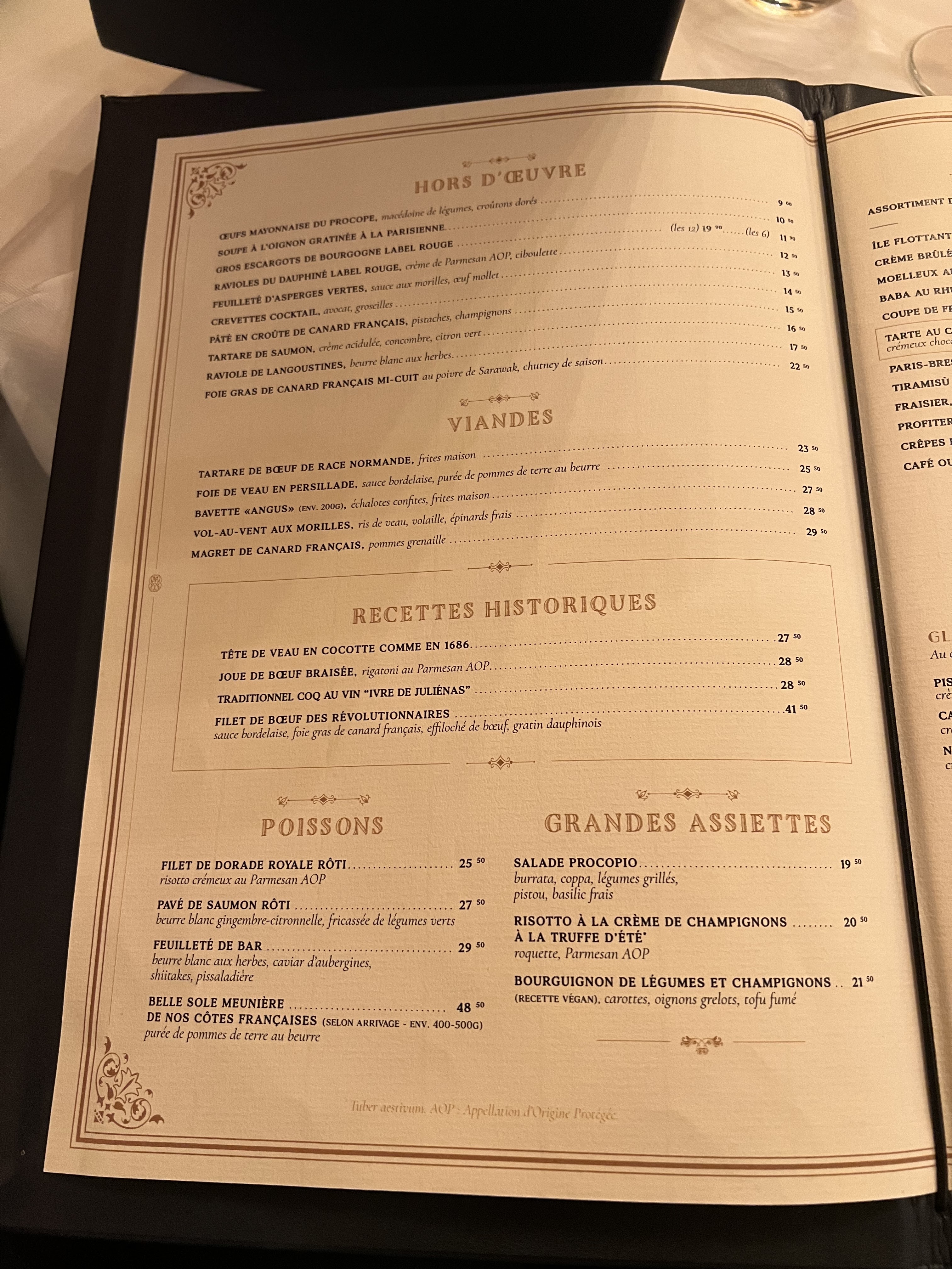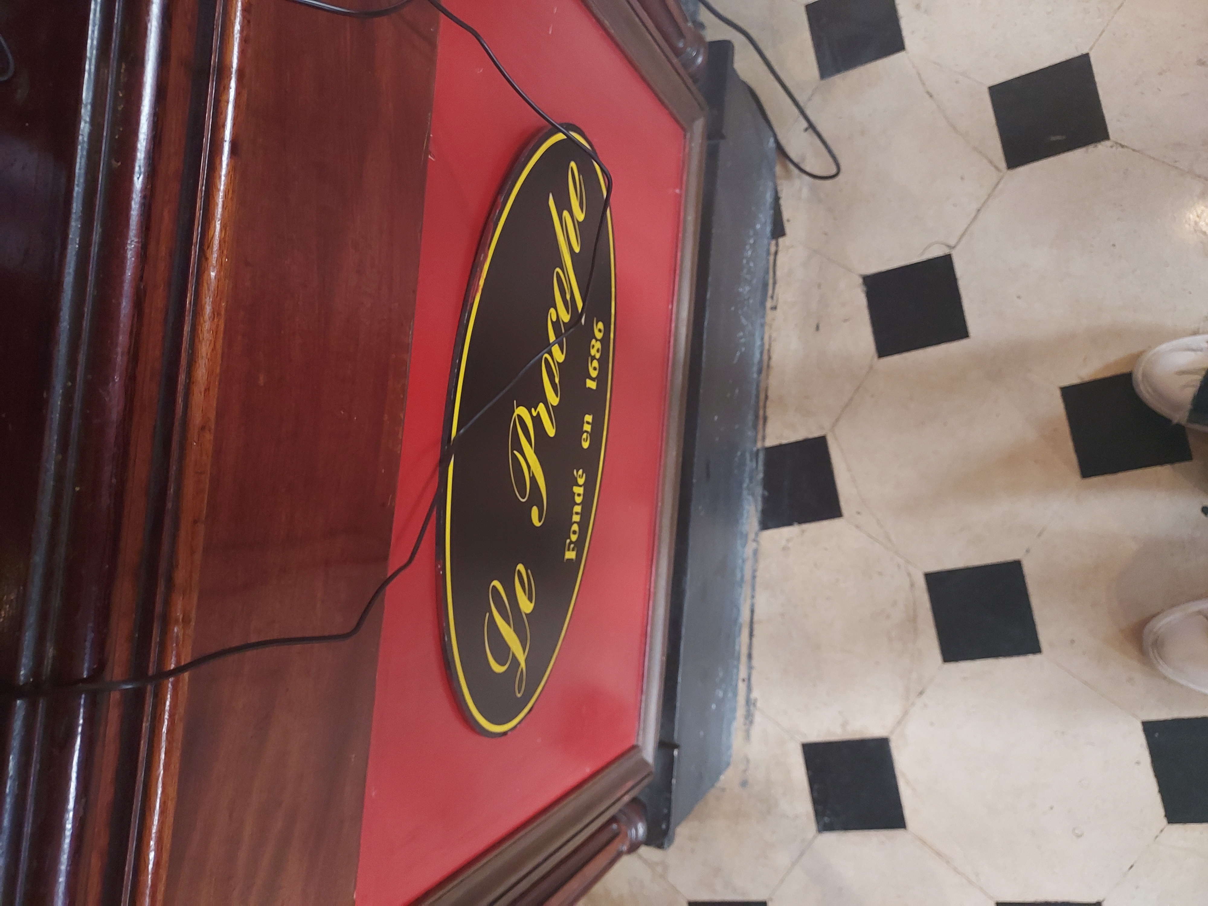 C’est un magnifique restaurant au décor unique. Le personnel est sympathique, j’ai beaucoup apprécié la serveuse. L’apéritif Procope est délicieux ainsi que le fois gras et la sole. En dessert profiteroles avec un excellent chocolat chaud. J’ai très bien mangé et j’ai passé un moment très agréable.
