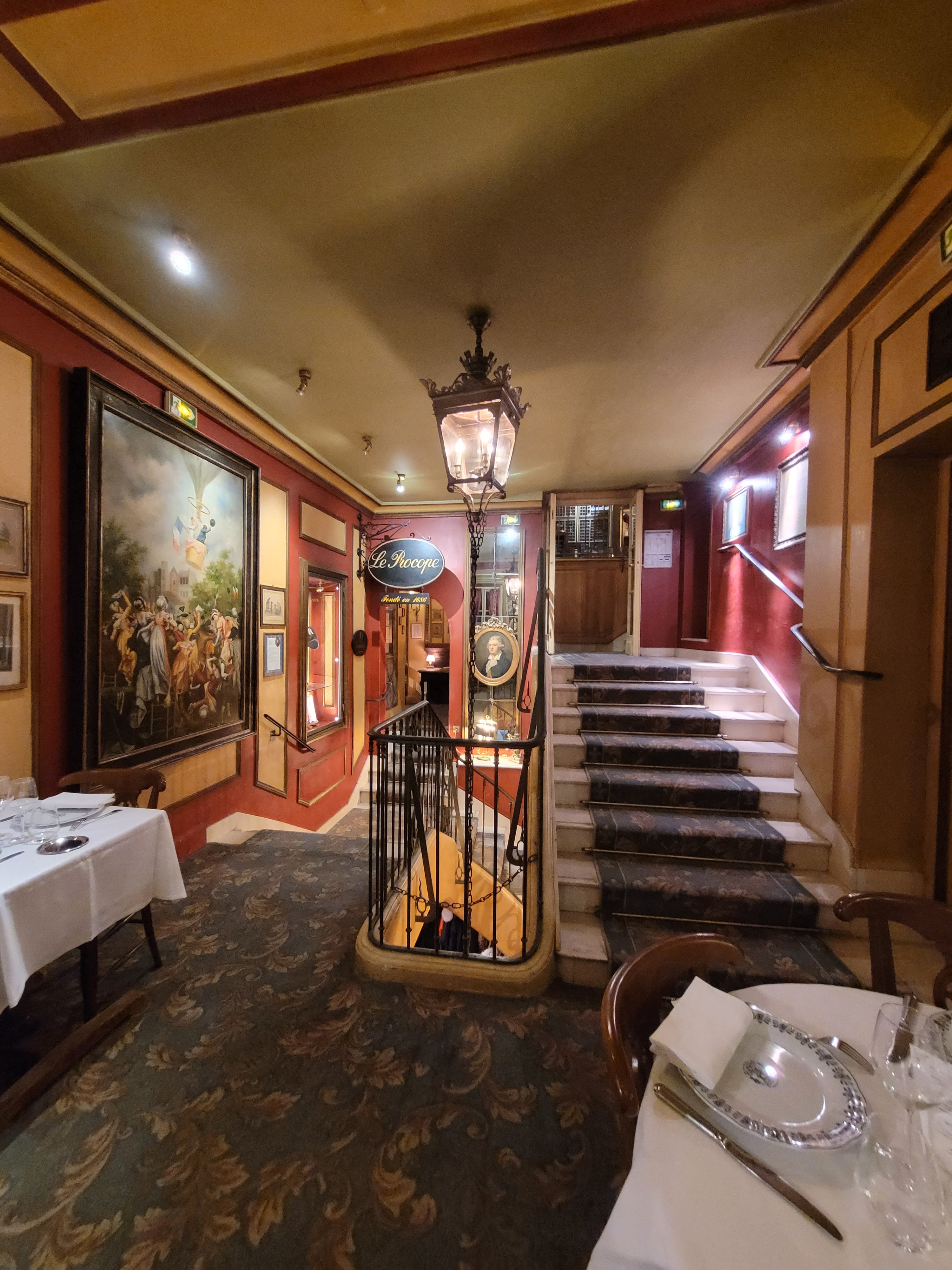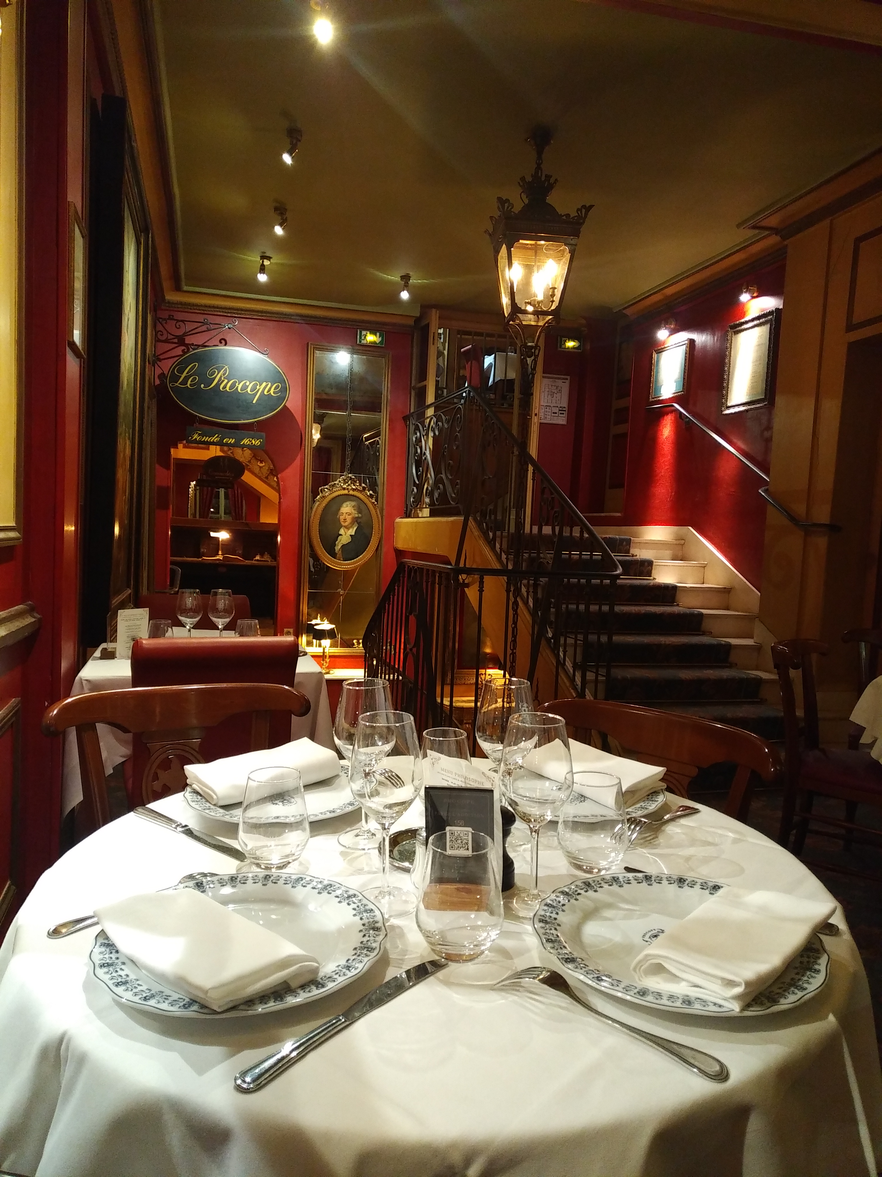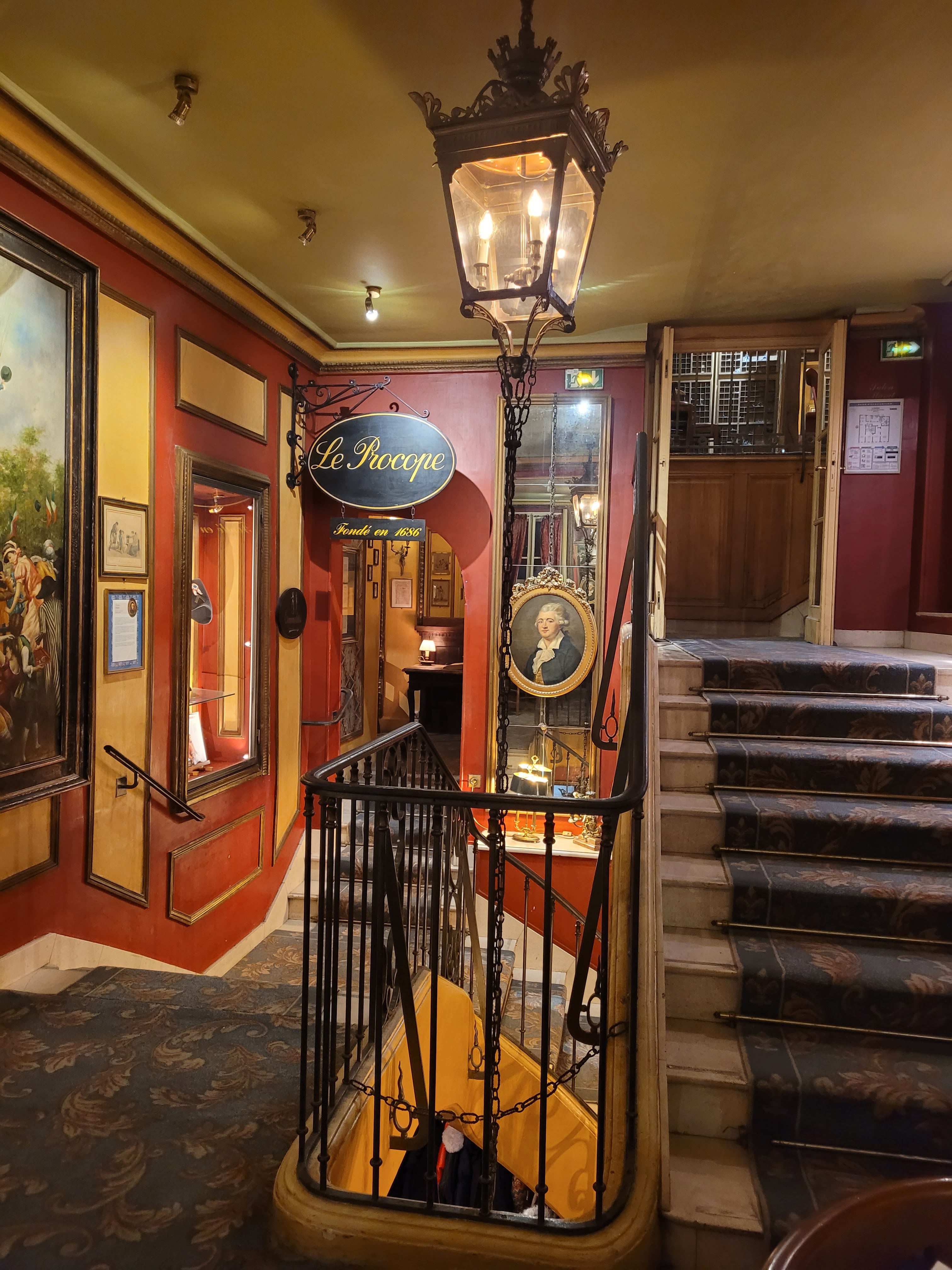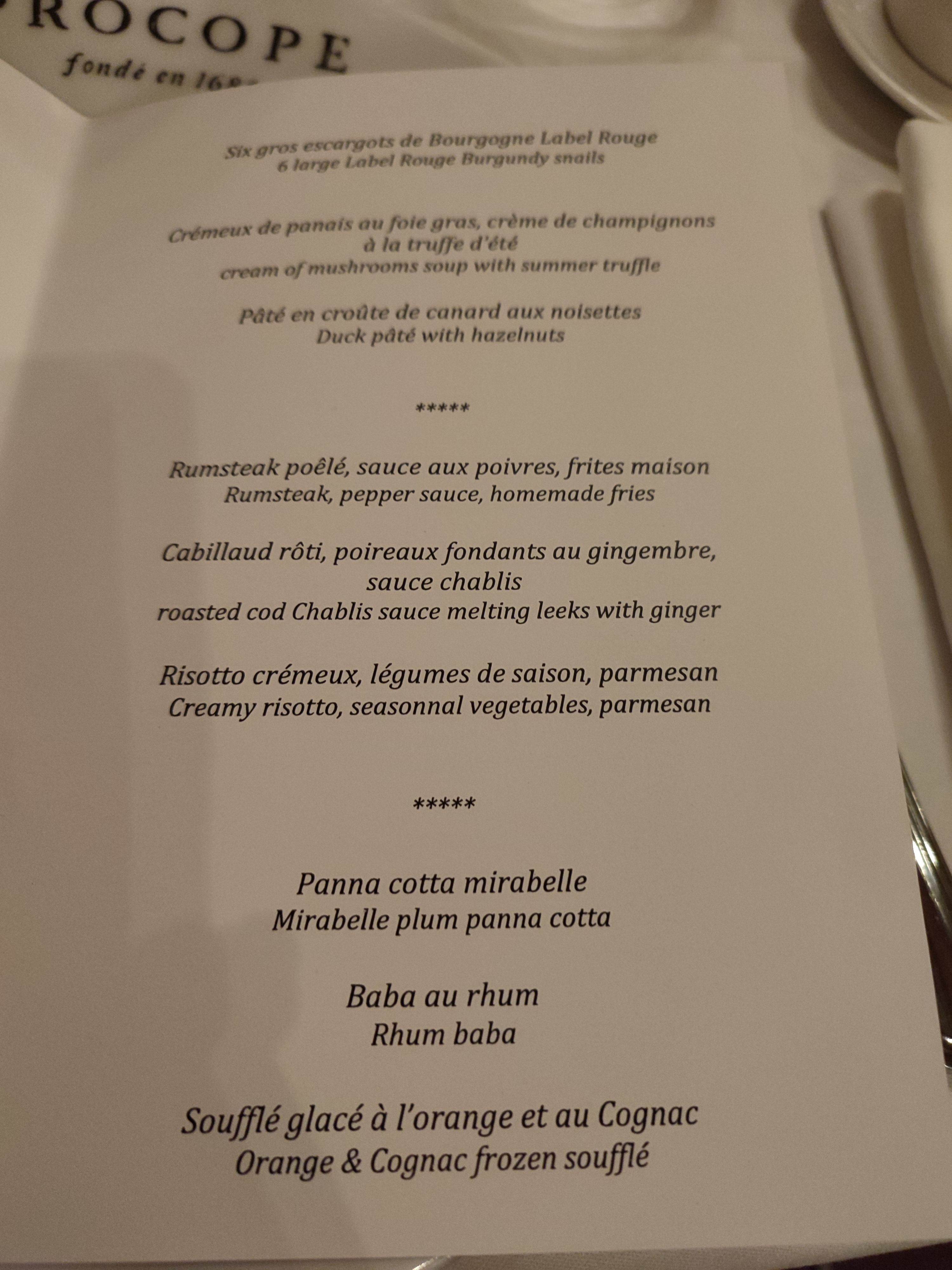 Un lieu historique exceptionnel en plein cœur de Paris pour passer un moment gourmet privilégié dans un cadre raffiné, entouré d'histoire et d'art sous toutes ses formes, avec un service impeccable et des assiettes généreuses et gourmandes, avec un bon rapport qualité prix notamment pour le menu Procope du midi à 24,50 € pour entrée/plat ou plat/dessert ou 31,50 € pour le menu 3 plats. On en sort ravi et pressé d'y revenir pour goûter d'autres plats appétissants de la carte très variée ! Un lieu historique incontournable pour tout amoureux de Paris, de son histoire au temps des Lumières et de sa délicieuse gastronomie.