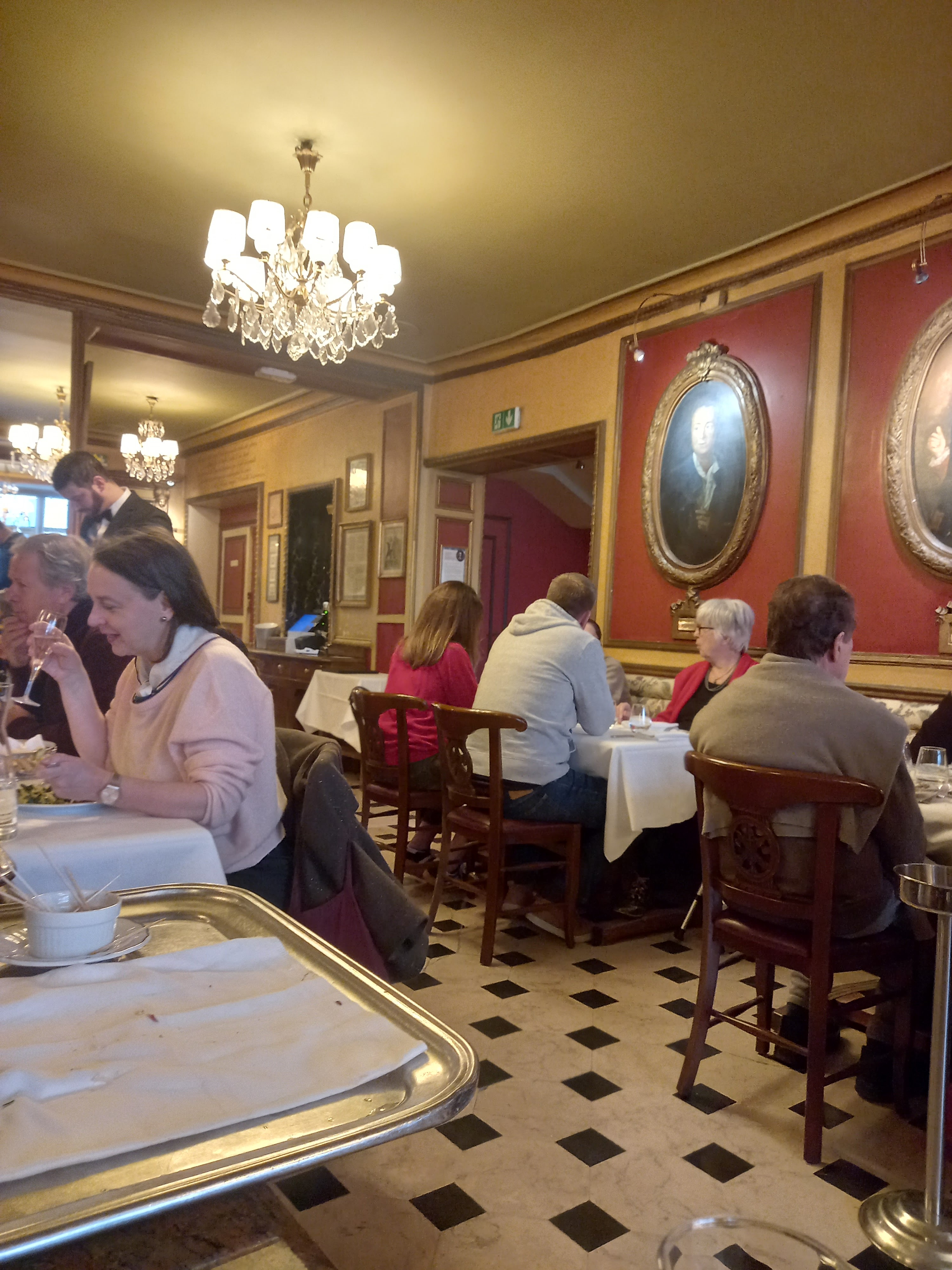 Ce qui est agréable : Cadre qui ressemble à un musée Personnel au top ! Souriant aimable serviable drôle et tout cela malgré le rush (bravo !) Service soigné mais sans prise de tête Un endroit qui pratique des prix doux compte tenu du cadre et du lieu Ce qui est moins sympa : Les plats ne sont pas super Assez bruyant En résumé c’est à faire au minimum une fois pour profiter de ce voyage dans le temps. Mais ne pas trop attendre de la cuisine.