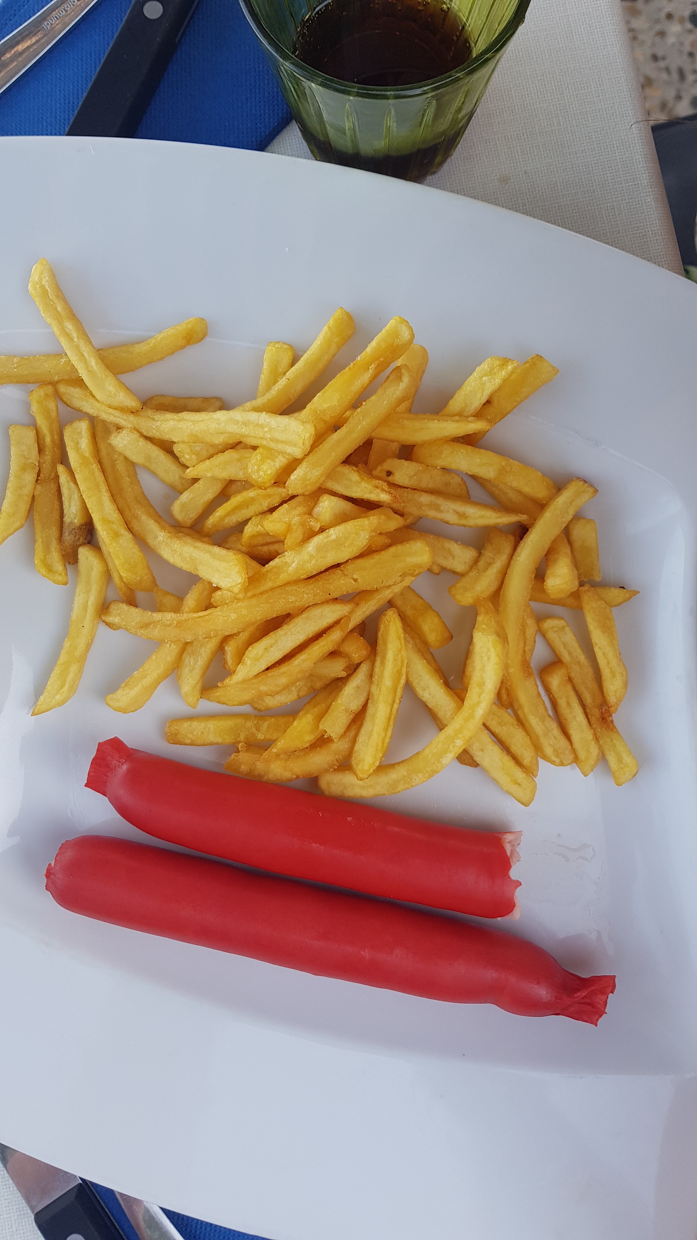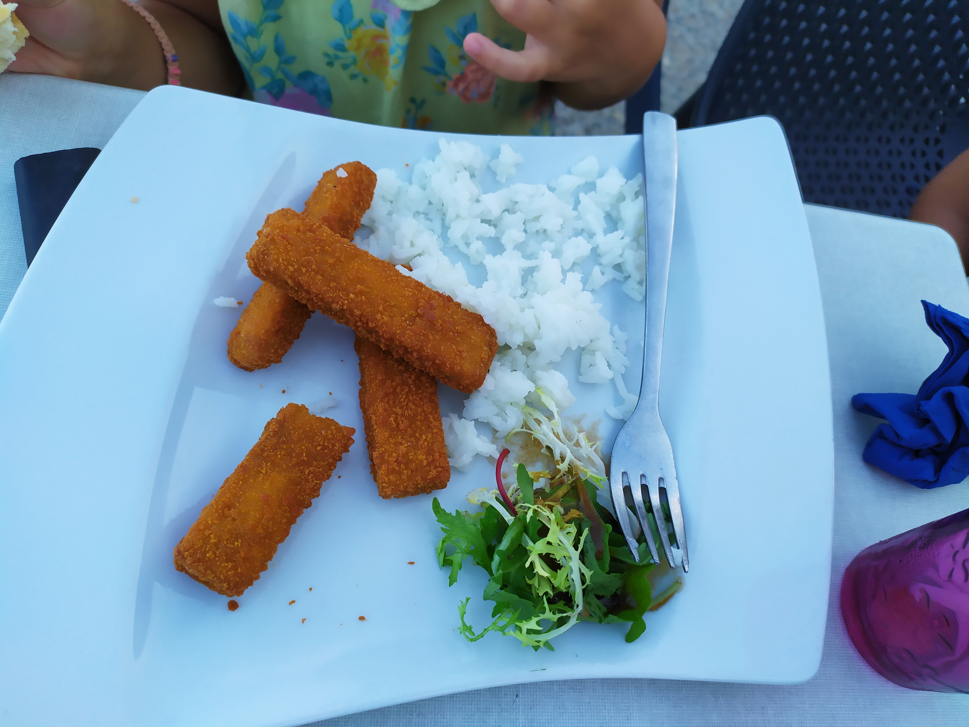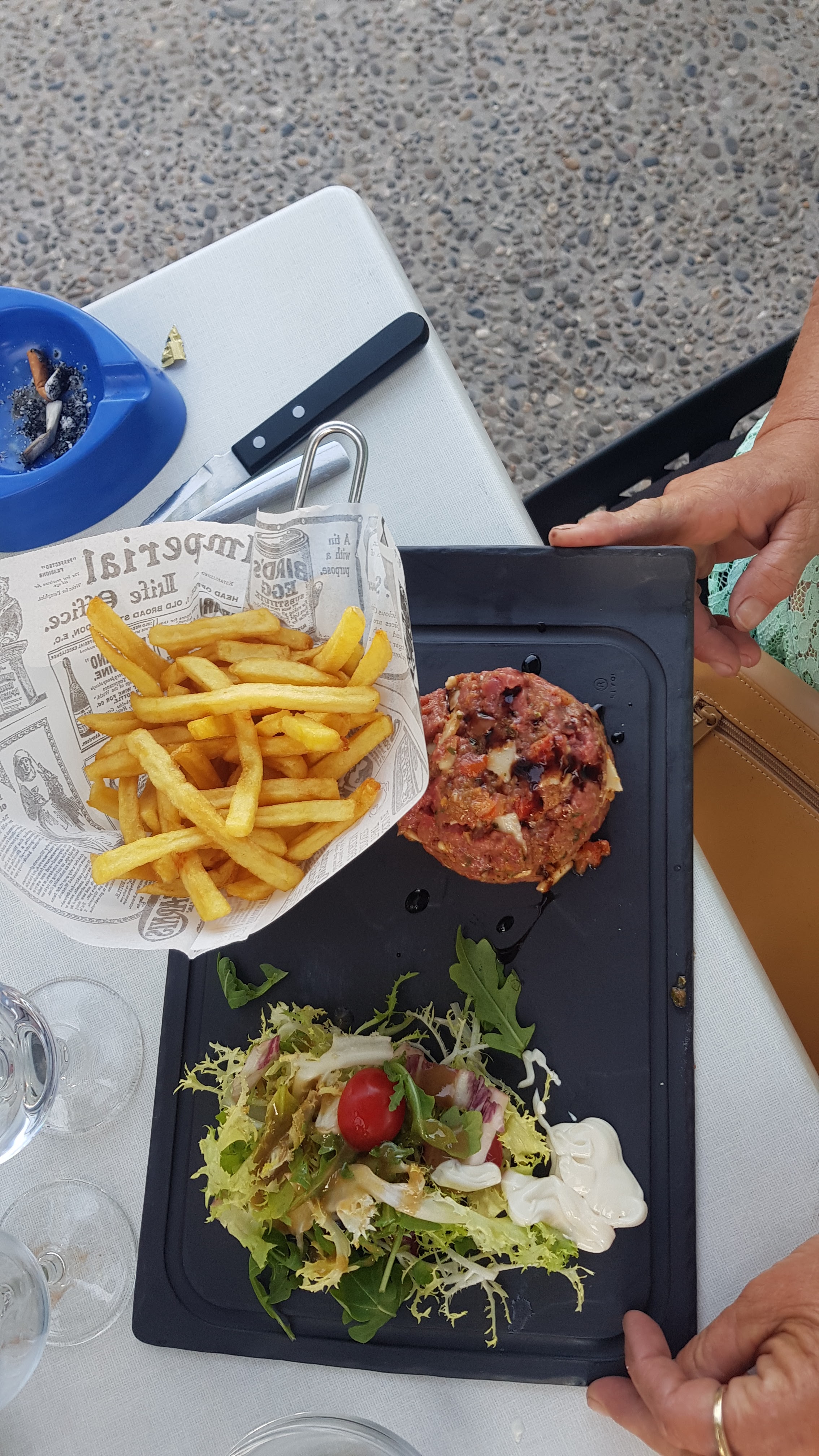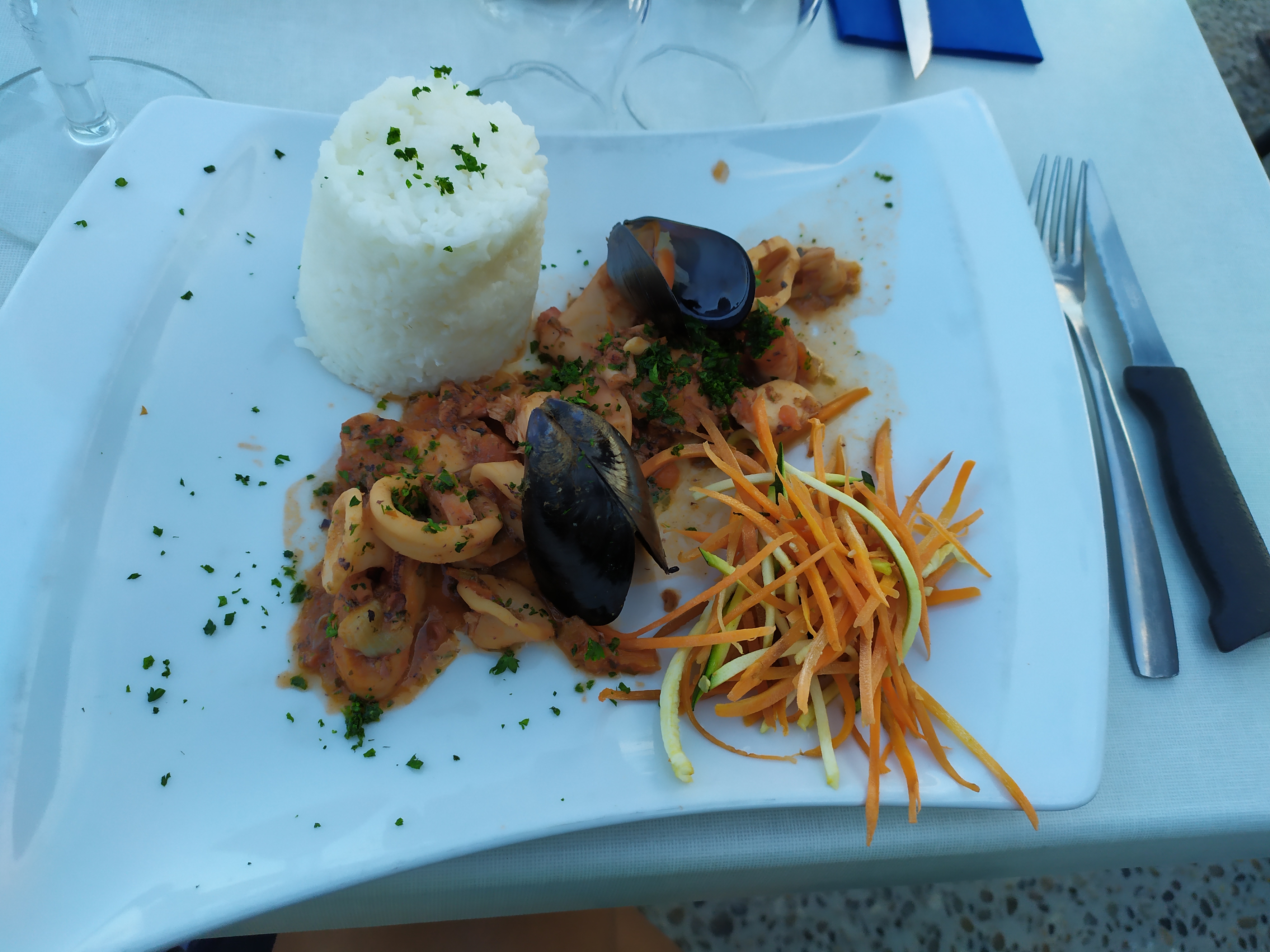 Déjeuner juste catastrophique ce midi. J’ai commandé des calamars, AUCUN goût, ça baigne dans l’huile d’olive, c’est sec, c’est une catastrophe. La terrasse est envahie d’abeilles. Et pour finir, pas un seul mot pour savoir si le déjeuner s’est bien passé, car je vous aurais très honnêtement dit que pour 18€, servir des calamars à l’huile, c’est une honte.