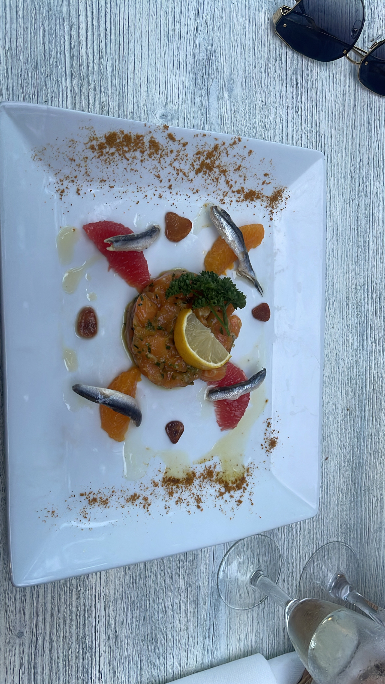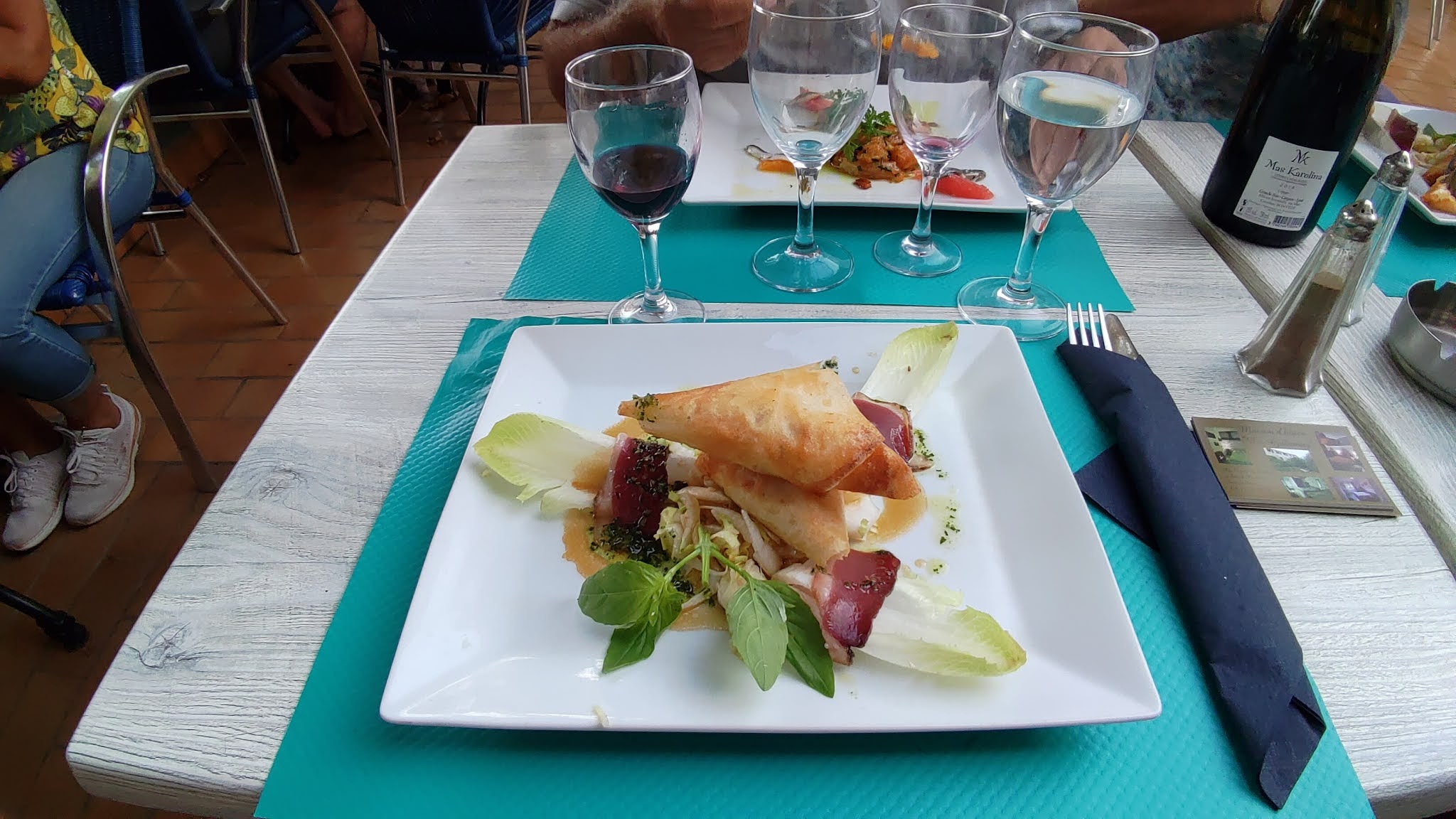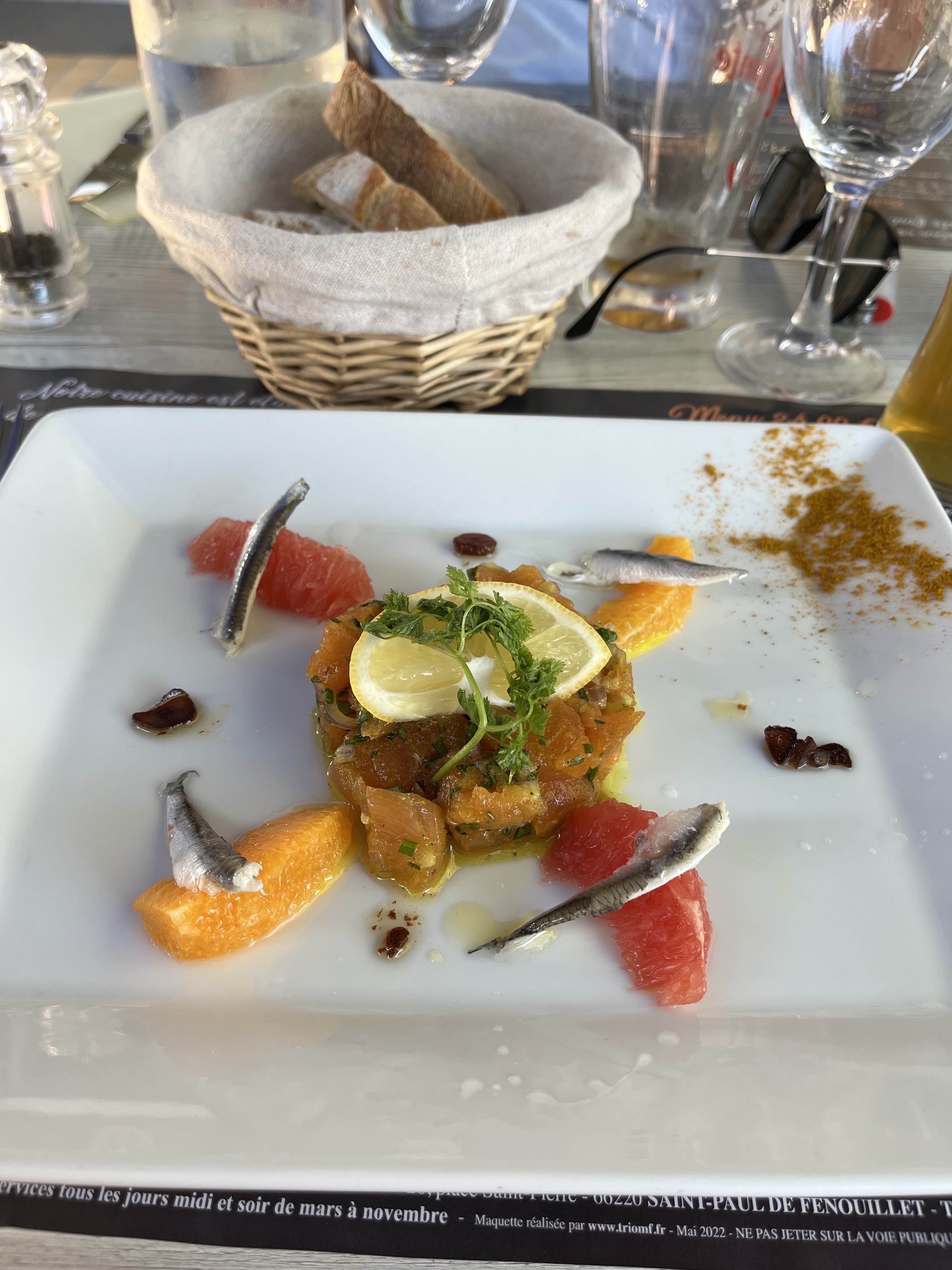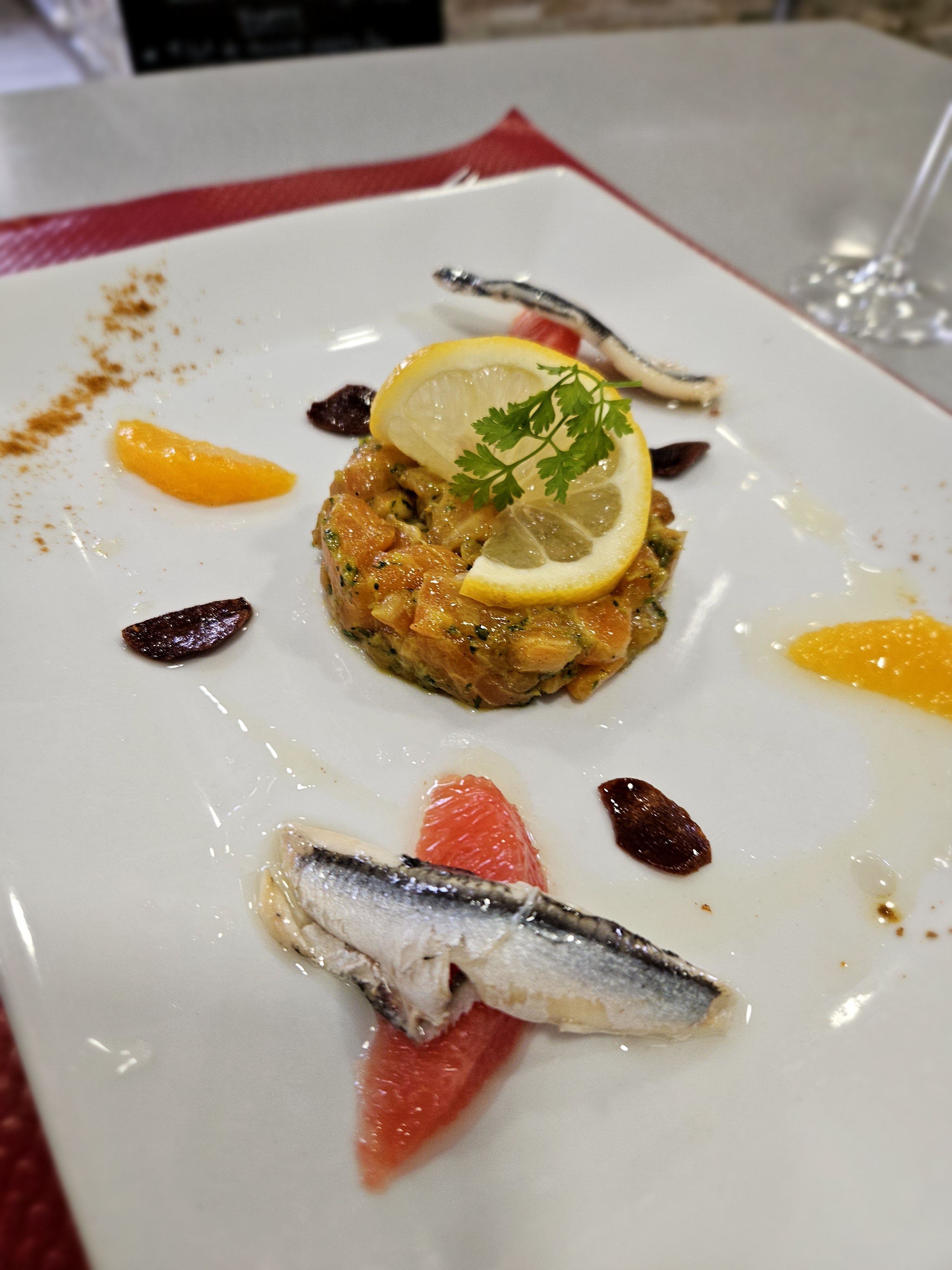 Restaurant endormi mais bien situé au milieu de la ville sur la place principale. Pas beaucoup d'ambiance avec des options limitées. Un menu avec deux options pour l'entrée et deux options pour le plat principal (canard ou dorade). Mais nous sommes arrivés le jour même sans réservation et ce fut un premier dîner correct. Un peu une touche marocaine avec des épices sur le tartare de saumon et j'ai beaucoup aimé ça !
