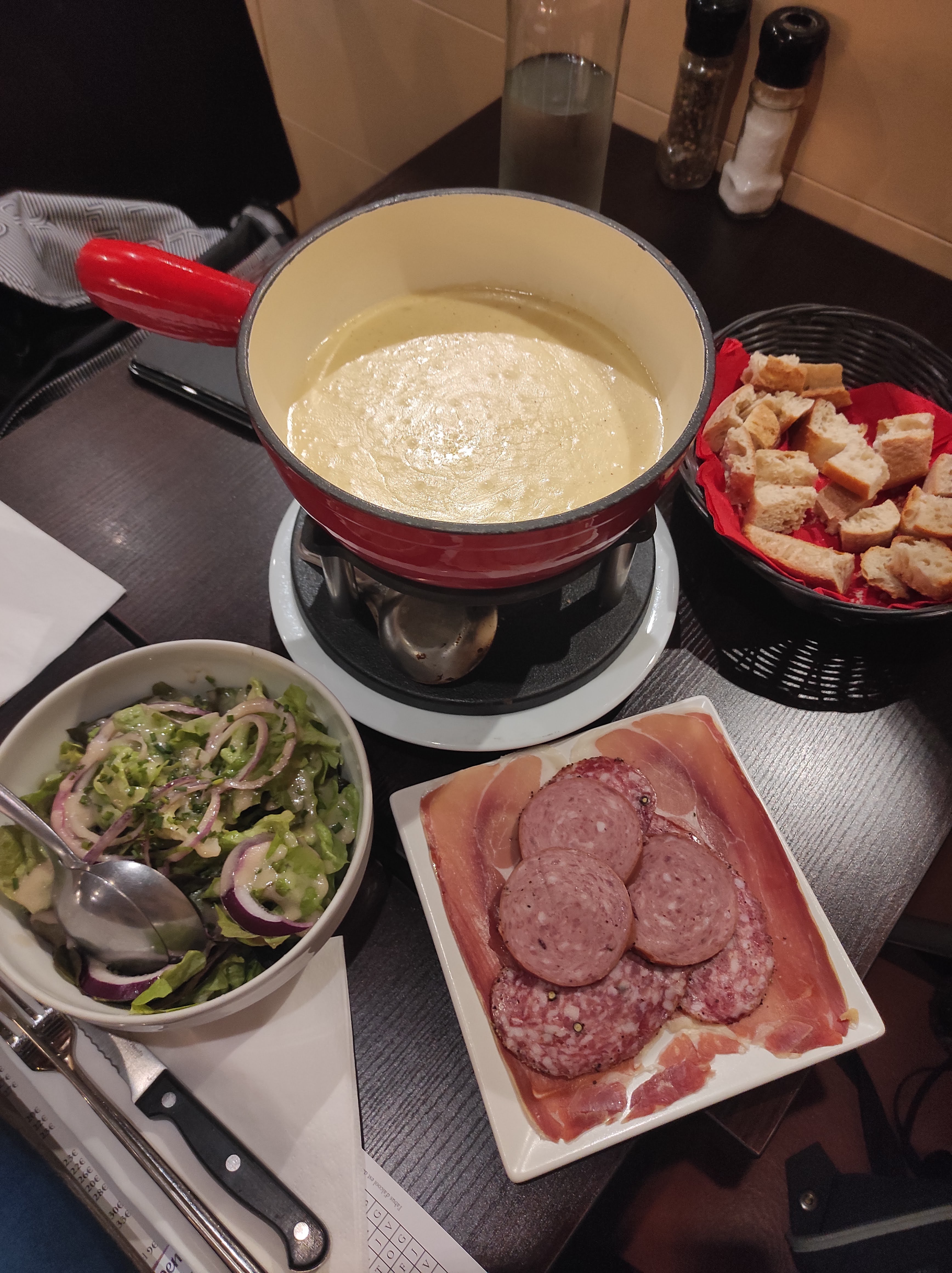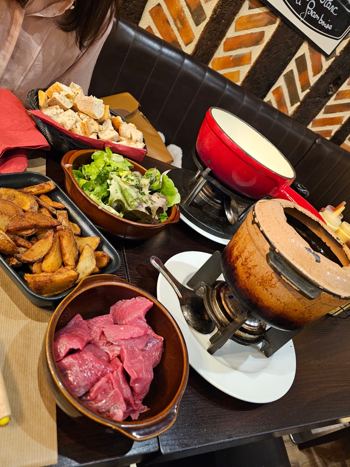 Accueil et service agréable. Fondue bourguignonne avec une bonne viande et des sauces variées. Fondue savoyarde, un peu liquide et qui, à mon goût, le vin était trop présent. Le tout servi avec une salade verte bien assaisonnée et des potatoes, à volonté. Lieu chaleureux mais très petit. Les tables sont à 15 cm les unes des autres. Addition pour 2 : 60€