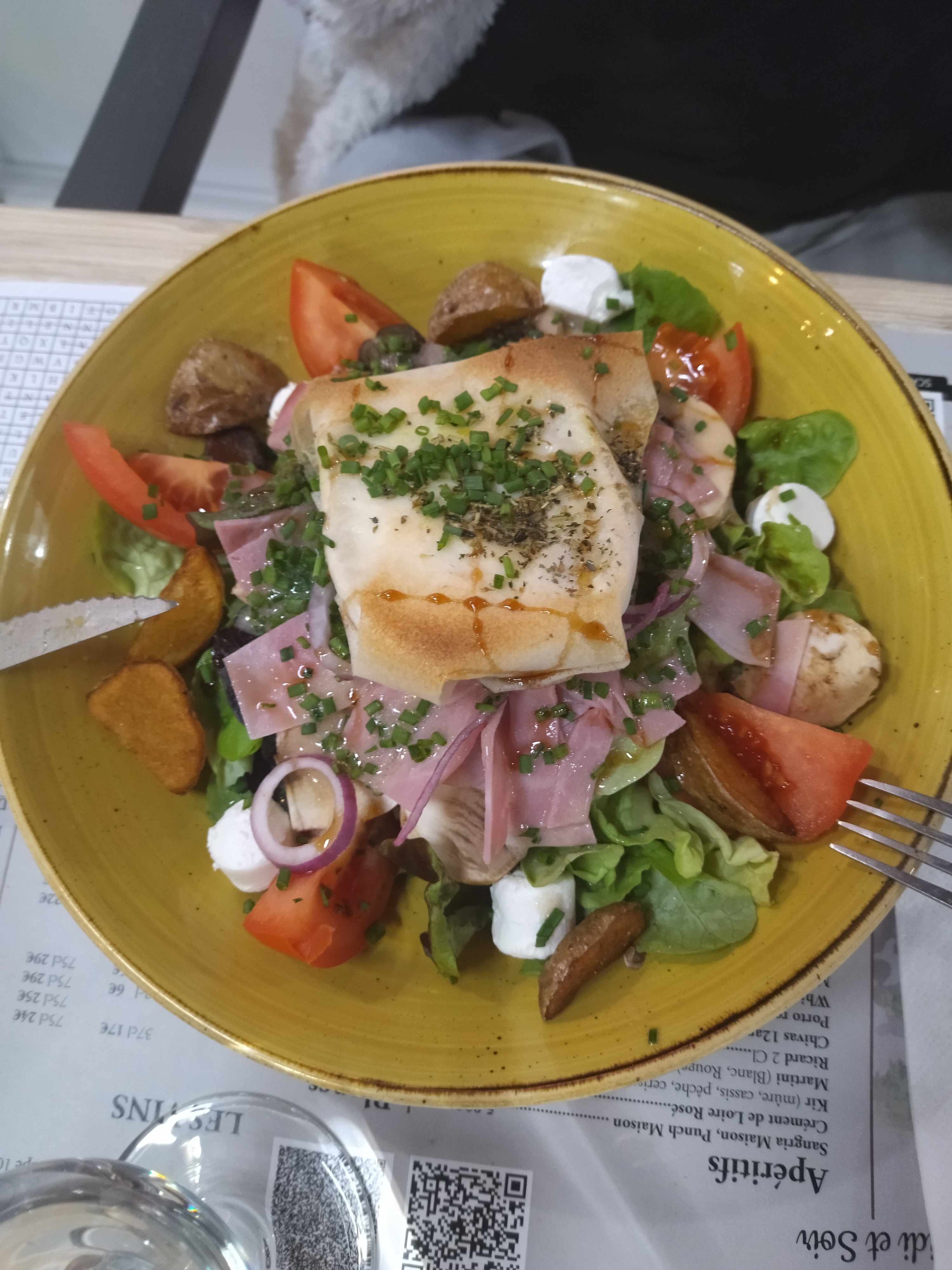 belle decouverte en periode covid, ai commandé via le site dc à en emporté, tres soigné avec tout ce qu'il faut (couverts, serviette, pain) service convivial qui donne envie d'y retourner quand on le pourra pr tester le service en salle j'ai testé la salade campagnarde, excellente, copieuse suffisamment chaude (le croquant chevre un pur delice) la vinaigrette à part bien parfaitement équilibrée. etant avec des amis qui n'avaient pas commandé ils ont la possibilité de commander directement sur place (devant le resto, ya une sonnette et des menus ainsi que du gel), service rapide et tt aussi complet. paiement sans contact et TR ! j'y retournerai avec grand plaisir