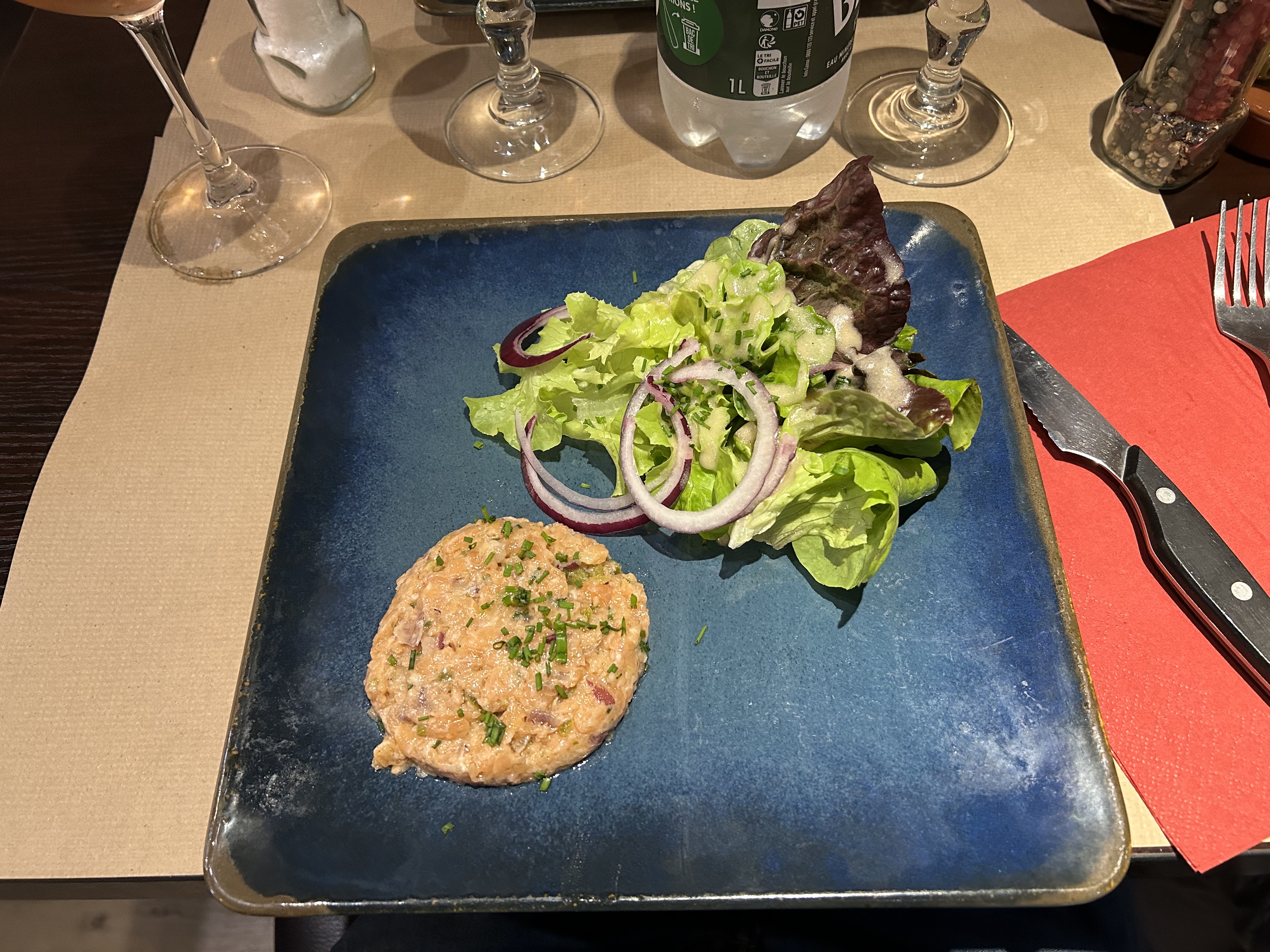 J'ai mangé à ce petit restaurant avec la petite cour cachée très agréable ça ne résonnait pas et on s'entendait très bien. On a pris en entrée un tartare de saumon et des croustillants de chèvre chaud excellent. En plat on a pris l'entrecôte/potatoes avec une très bonne cuisson et du poisson/potatoes avec une sauce très bien cuisiné. La serveuse était super agréable.