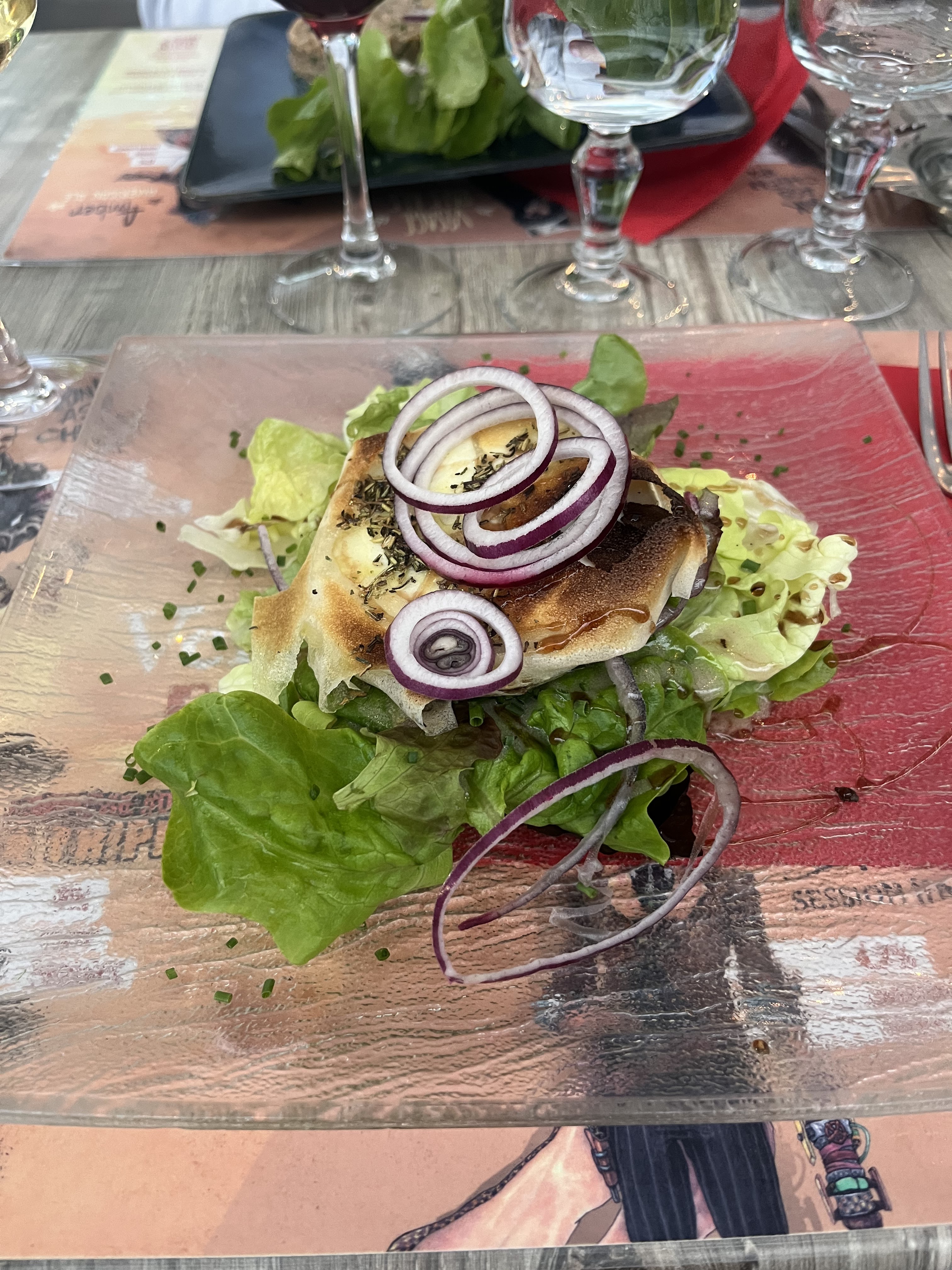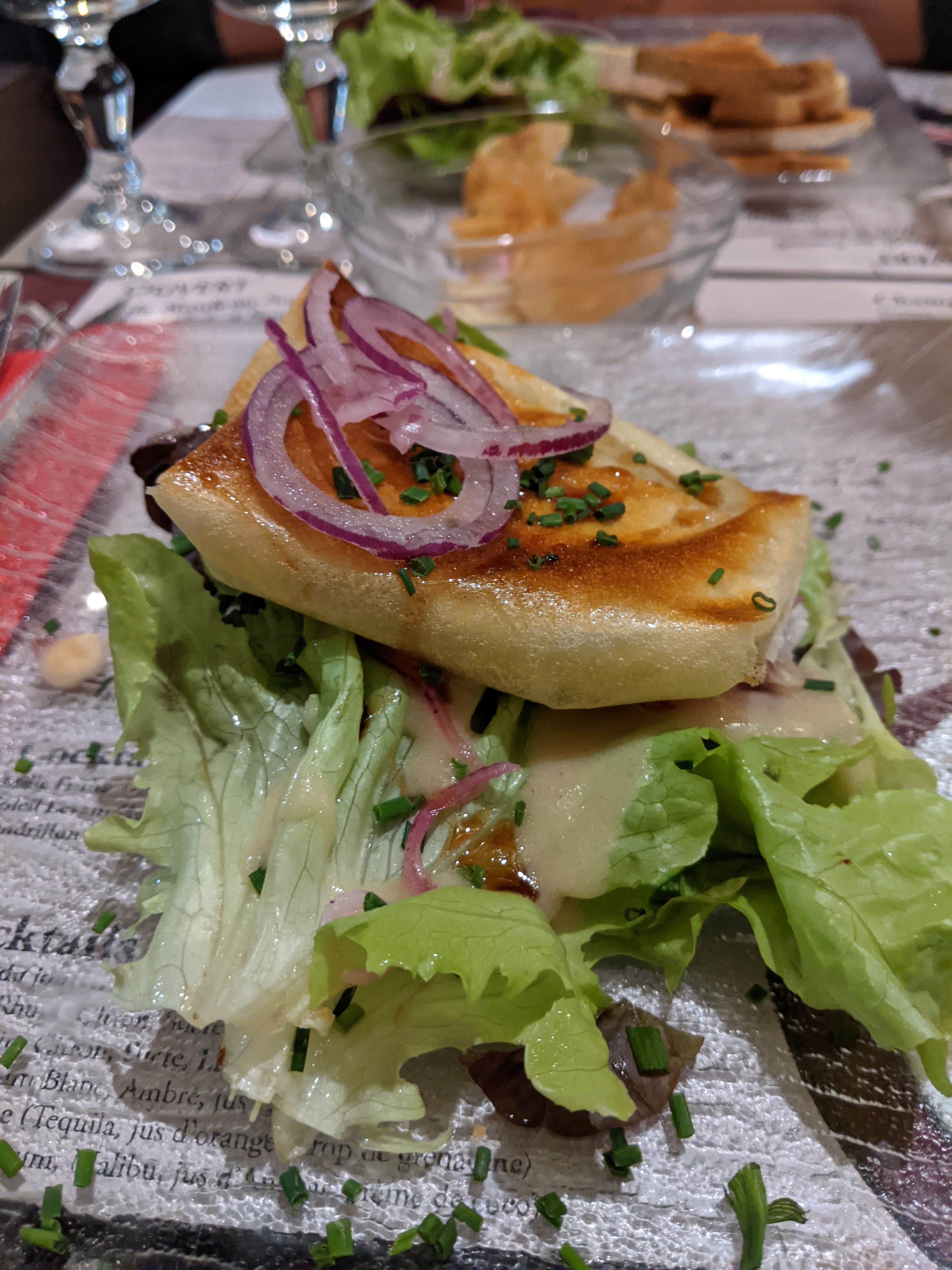 Quelle merveilleuse découverte des gens adorables qui dirigent ce restaurant très fréquenté. Nous avons commandé notre vin, puis un gratin de soupe à l'oignon. C'était super, j'ai ensuite mangé une tartilfilette, la cuisse de canard de mon mari. Ce qui était tout simplement le meilleur, puis nous avons eu chacun une crème brûlée. Le fait que ce restaurant soit complet à l'heure du déjeuner, le serveur et le chef étaient très polis et parlaient anglais. C'était vraiment un bon repas.