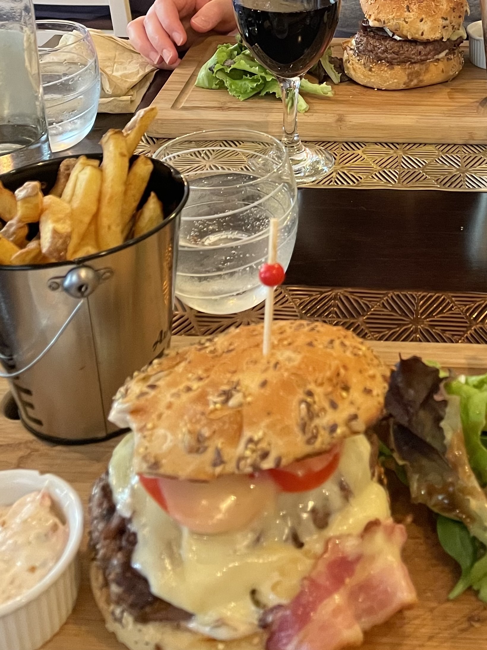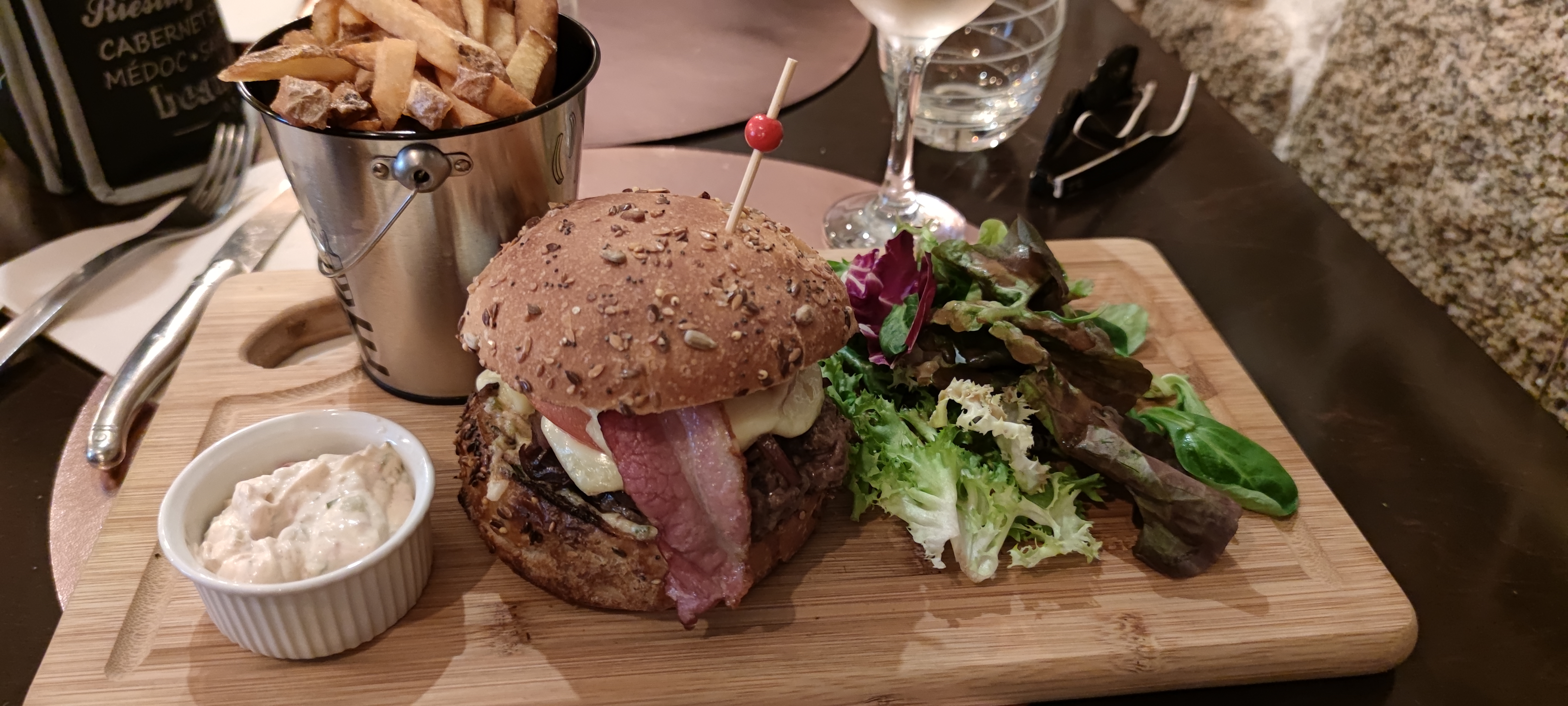 Un vrai régal, burger fait maison avec frites maison , une petite sauce à la ciboulette pour accompagner ! Parfait ! Accueil super et personnel très souriant et sympathique !
