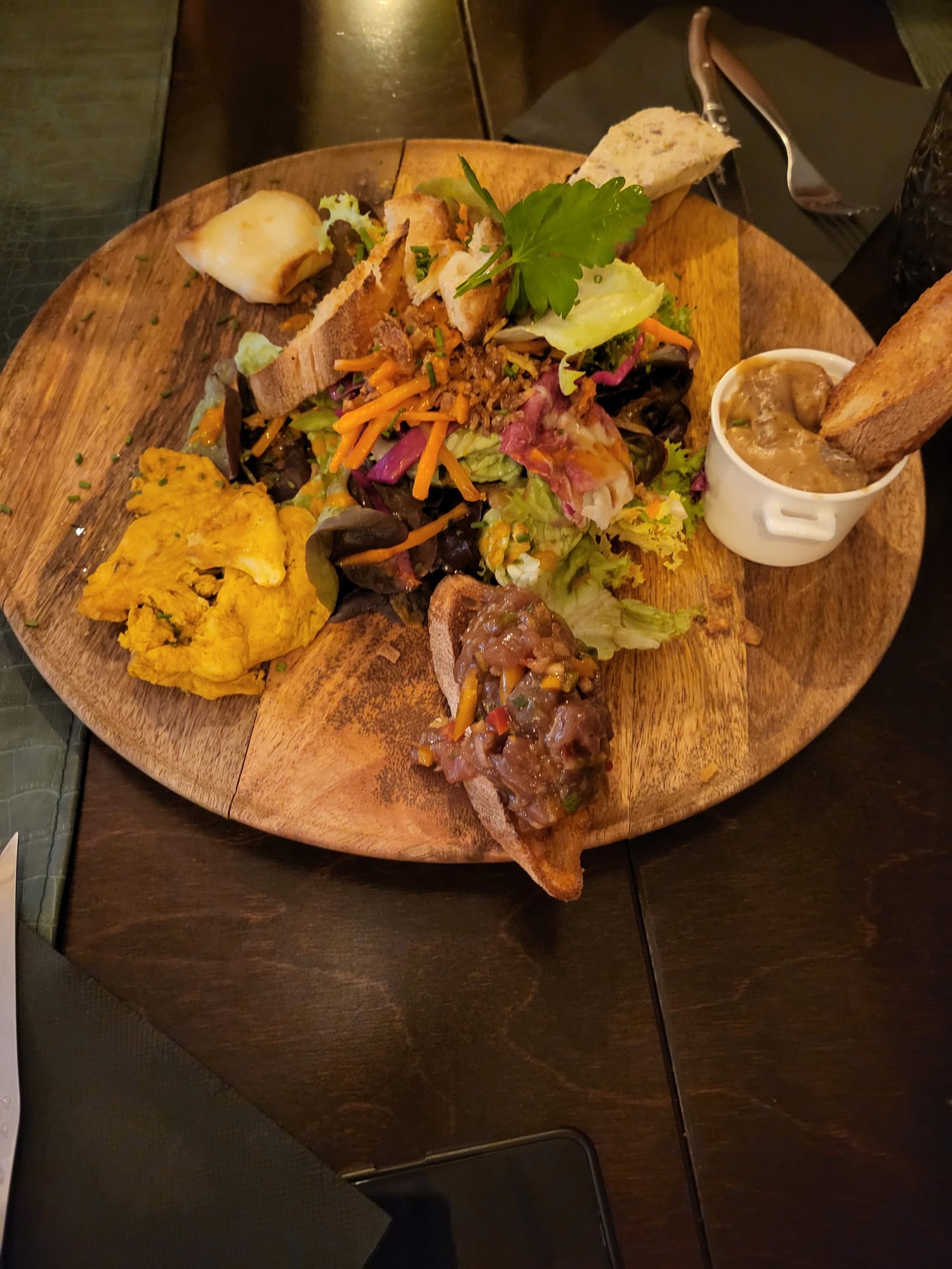 Depuis le temps qu'on disait allez-y vous verrez c'est top , on avait hâte d'y aller . Je suis très tolerant et fais 6 restos/ semaine dans toute la Bretagne , toute l'année , donc je vais être juste dans le + et - . On est arrivé tôt exprès pour profiter, on a attendu 45 min nos assiettes. Tataki de thon bon mais beaucoup trop d'huile ça baignait dedans, dommage , je l'ai digéré 2 jours , et assiette rapport qualité/prix un peu trop élevée. Profiteroles bonnes , bon rapport qualité/prix. Endroit sympa , tables un peu trop serrées, difficile de trouver de l'intimité. Je n'ai rien contre les animaux , j'en ai d'ailleurs, mais 2 gros chiens mouillés qui sentent qui arrivent à nos pieds , je trouve moyen. D'autant plus que cette odeur prenait le dessus de nos senteurs de plats . Le service n'était pas à la hauteur durant la moitié de notre moment au restaurant, la seconde partie s'est mieux passée. En synthèse, déçu. C'était peut-être la mauvaise journée...j'y retournerai peut-être, mais pas tout de suite .
