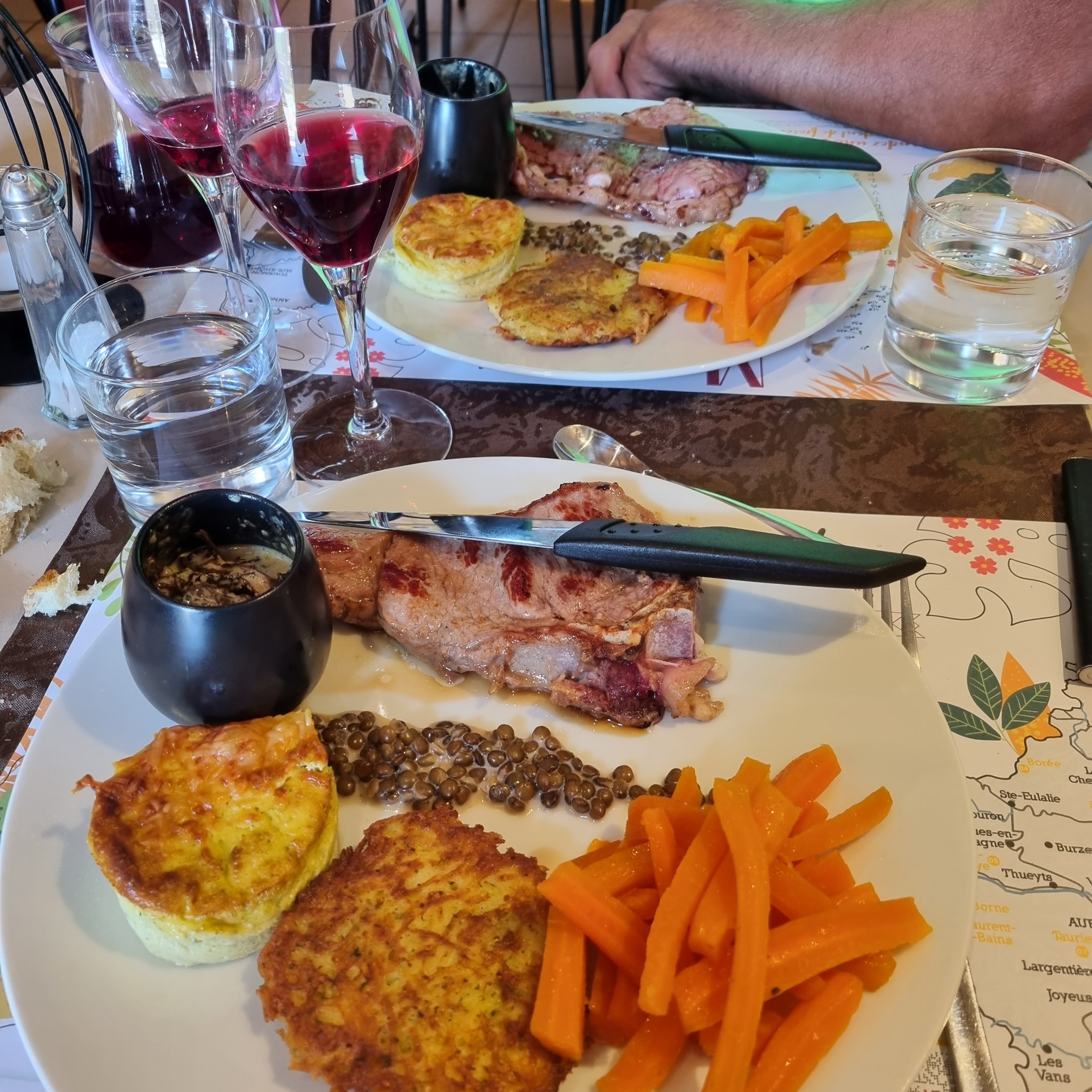 Bonjour, nous avons très bien mangé, c'est un très bon restaurant, ardoises de charcuterie et gigot d'agneau aux cèpes, sans oublier la truite aux amandes. Et le dessert, glace à la verveine avec un peu de liqueur de verveine aussi. Merci,tout était parfait et surtout pas trop cher. Encore merci et à bientôt. Bonne soirée à vous tous.
