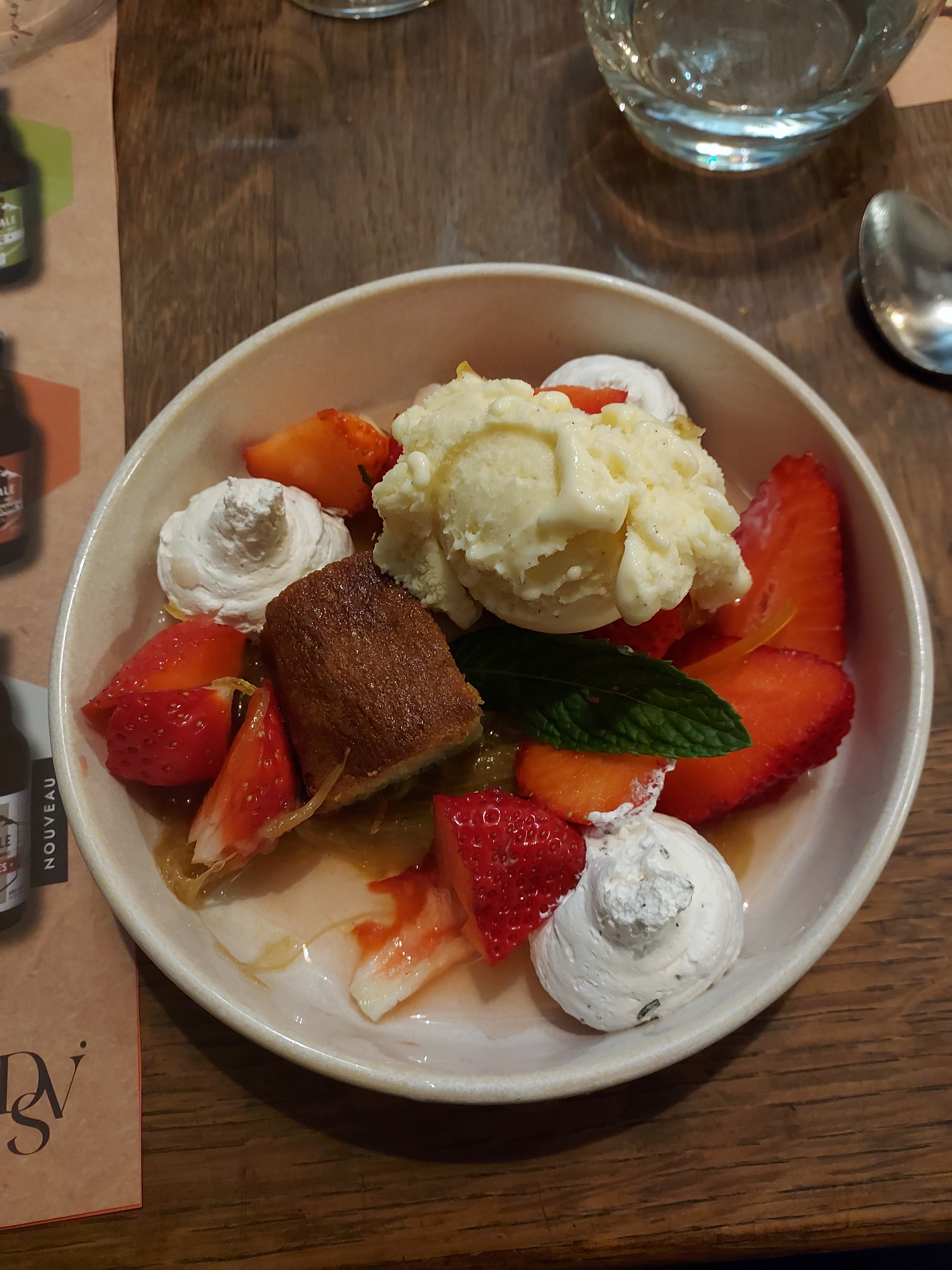 Très bon service et bon repas, les produits sont frais et de la région. La viande était parfaitement cuite et de très bonne qualité. Le camembert rôti très copieux et parfumé sans être bourratif. Le tartare de boeuf avec les ingrédients d'assaisonnement mit autour était idéal pour l'agrémenter selon ses goûts. Les desserts était très originaux, frais et légers. La pyramide de framboises avec sa tartelette sablé, le crémeux citron et sa boule de sorbet citron était vraiment parfaite. Le bol de fraises avec sa compotée d'abricots, émulsion d'estragon et gâteau pistache était tout aussi bonne et avec des saveurs qui se mélangeaient bien toutes en légèreté et fraîcheur. Le serveur nous a conseillé lors de nos interrogations avec justesse et le patron en a fait de même concernant les desserts.