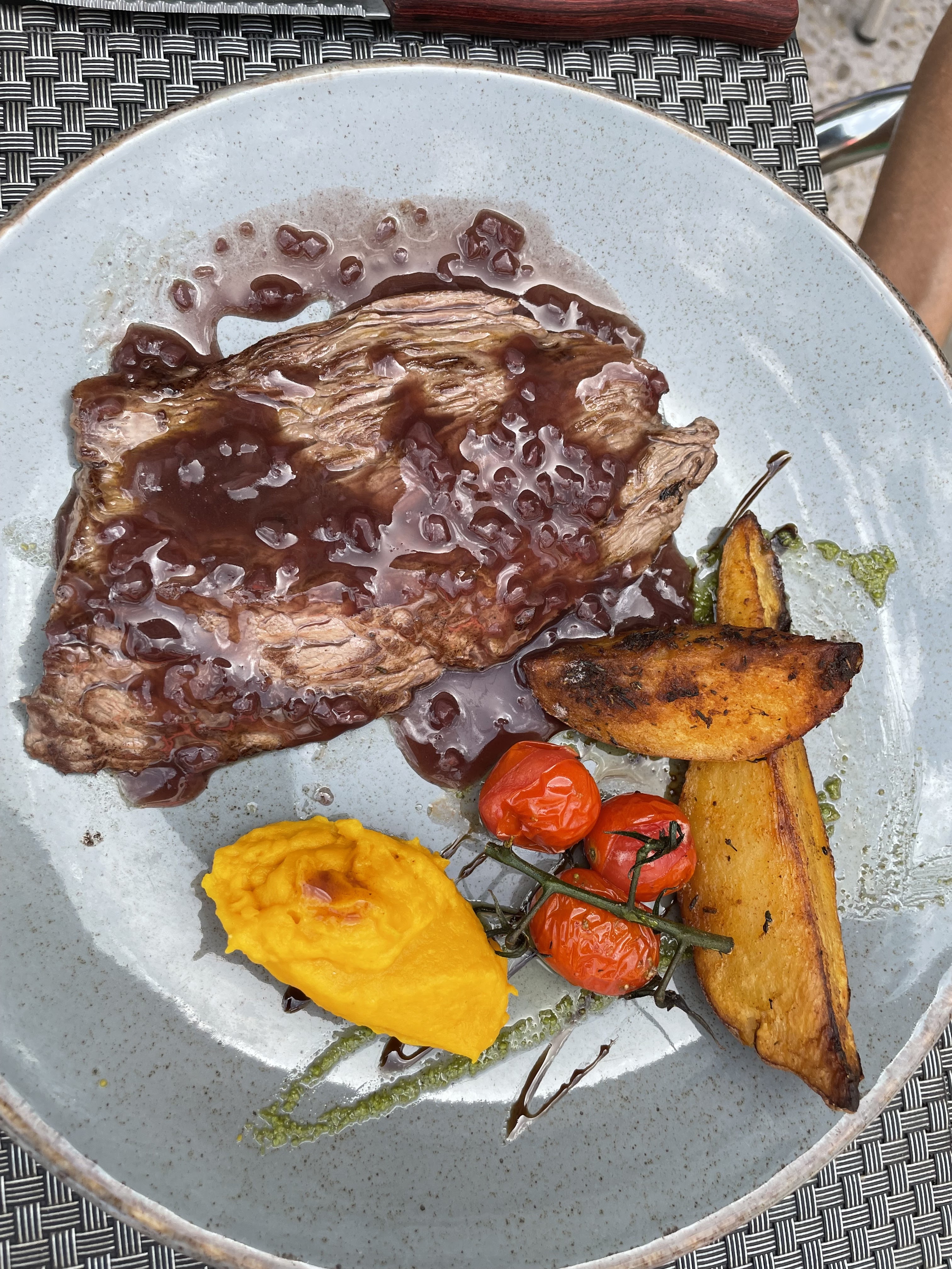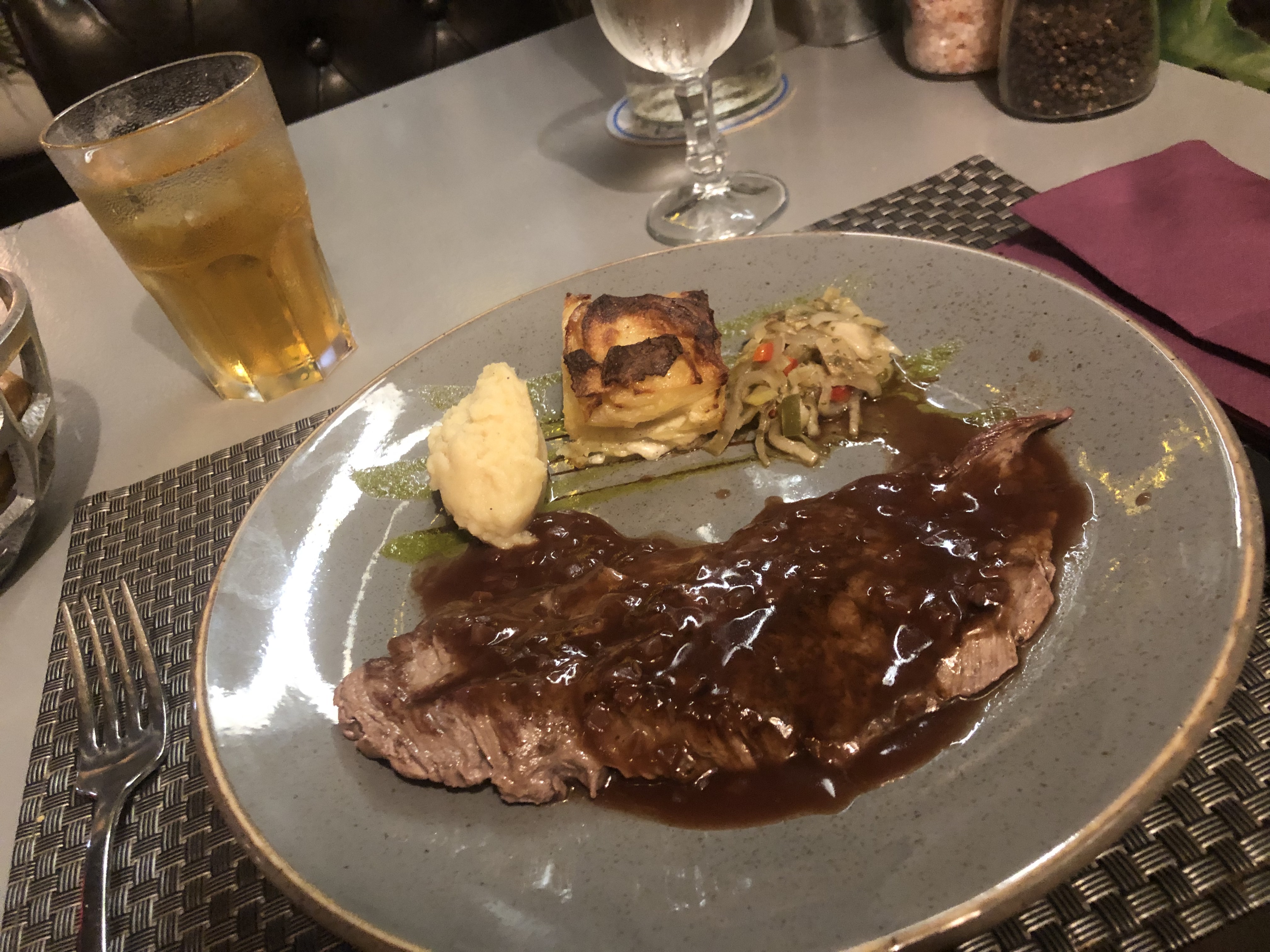 Côte de bœuf 🐂 froide !!! Vin blanc moyen, mais un jolie cadre. Prise de commande trop rapide dommage pour le nom QG.