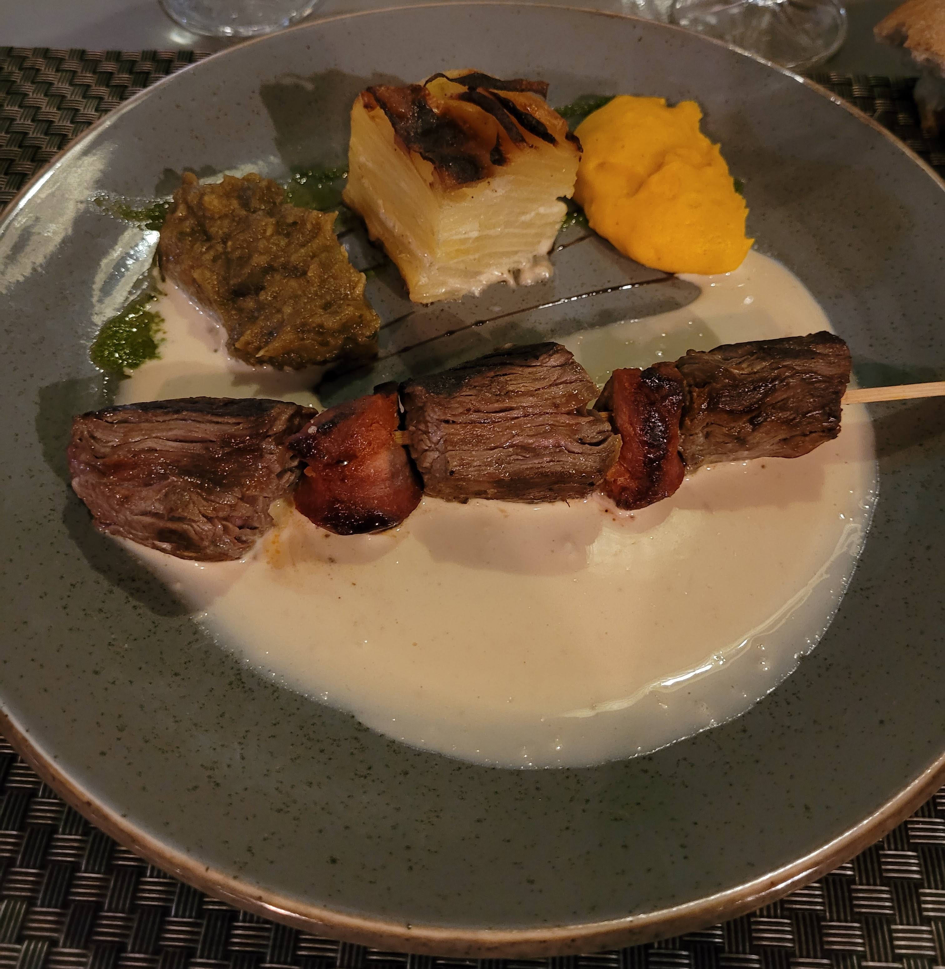 Très bel endroit à la décoration hétéroclite mais très chaleureuse J'accueil est très convivial Nous avons opté pour la formule à 26 euros Pour commencer une bruschetta à la brandade de morue délicieuse accompagnée d'une salade pleine de Pignons, graines et autres pousses de salade Entrée vraiment exquise Puis une superbe brochette de bœuf, sauce foie gras accompagnée de gratin dauphinois et julienne de legumes Plat tres gourmand Enfin, un baba au rhum revisite sauce QG Tres bon aussi En résumé un établissement qui vaut vraiment le détour