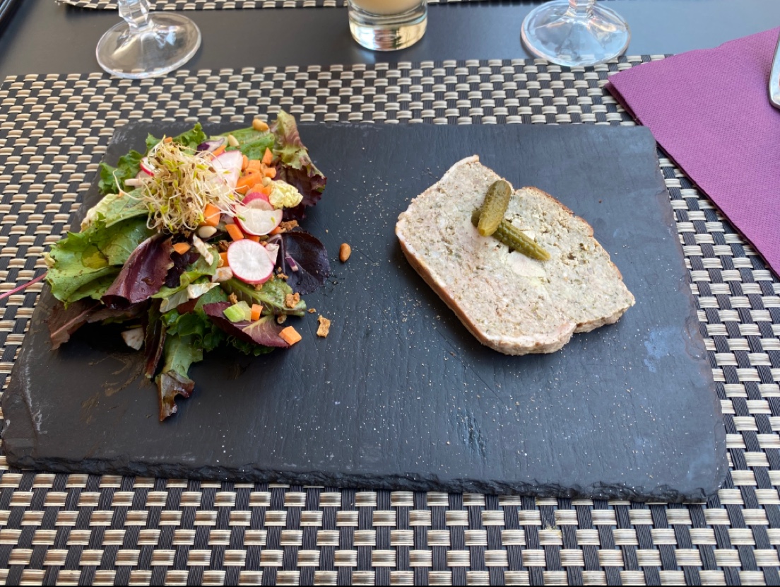 Repas copieux et fin, joliment présenté, salade de magret et foie gras, brochettes de saint Jacques, filet de saint Pierre, belle carte des vins, dîné en terrasse au calme, patrons sympathiques!