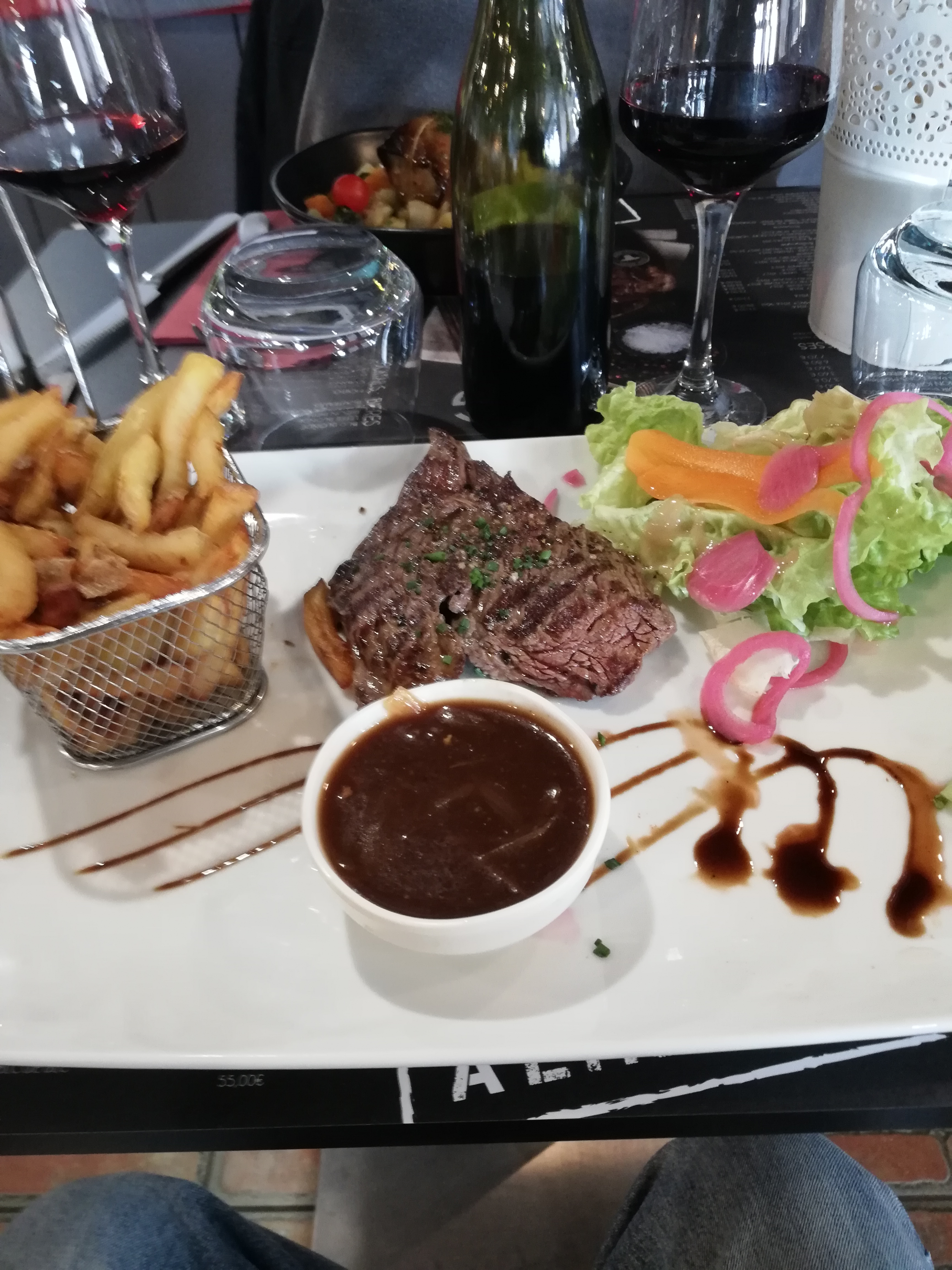 Très bon accueil. Viande savoureuse, par contre l'accompagnement laisse à désirer frites tièdes très petites et trop cuites ,sauce au poivre très fluide et tiède, et surprise supplément pour une 2ème sauce . Salade sans assaisonnement. Bref aucun geste commercial....