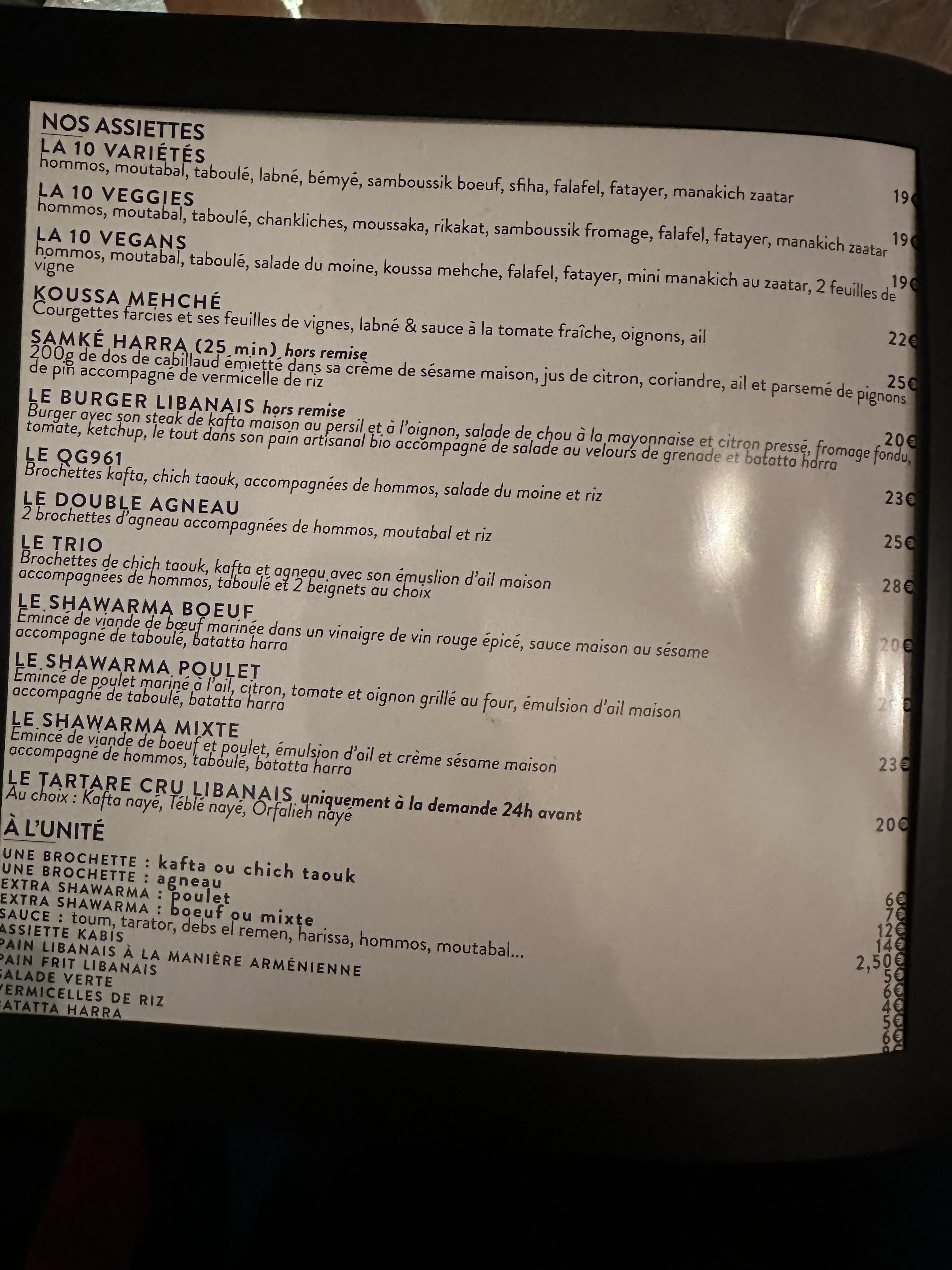 Lieu très agréable et chaleureux, cuisine excellente et traditionnelle, produit 100% libannais et transformé sur place 26€ menu découverte et copieux, service très sympathique, je recommande vivement.