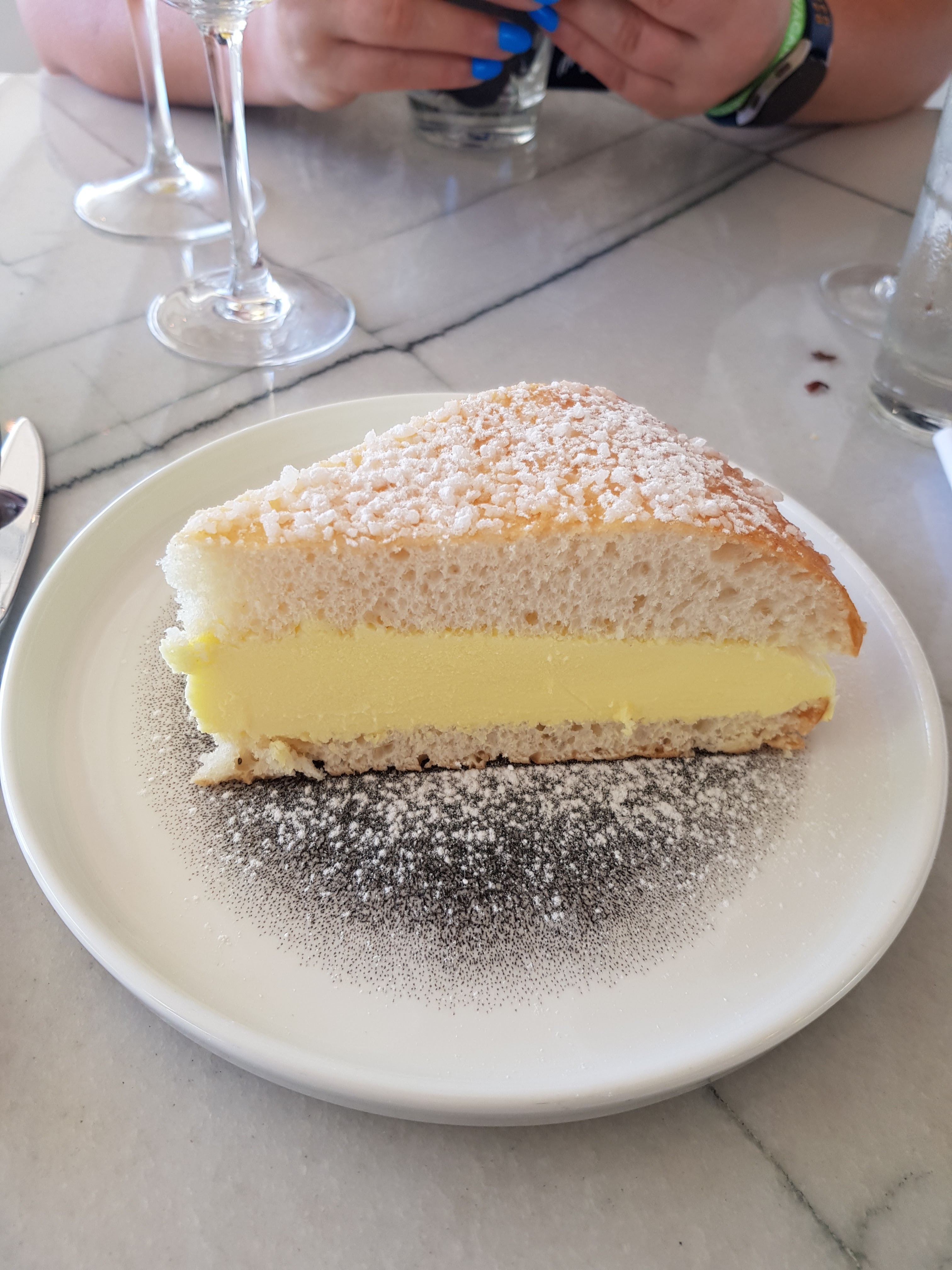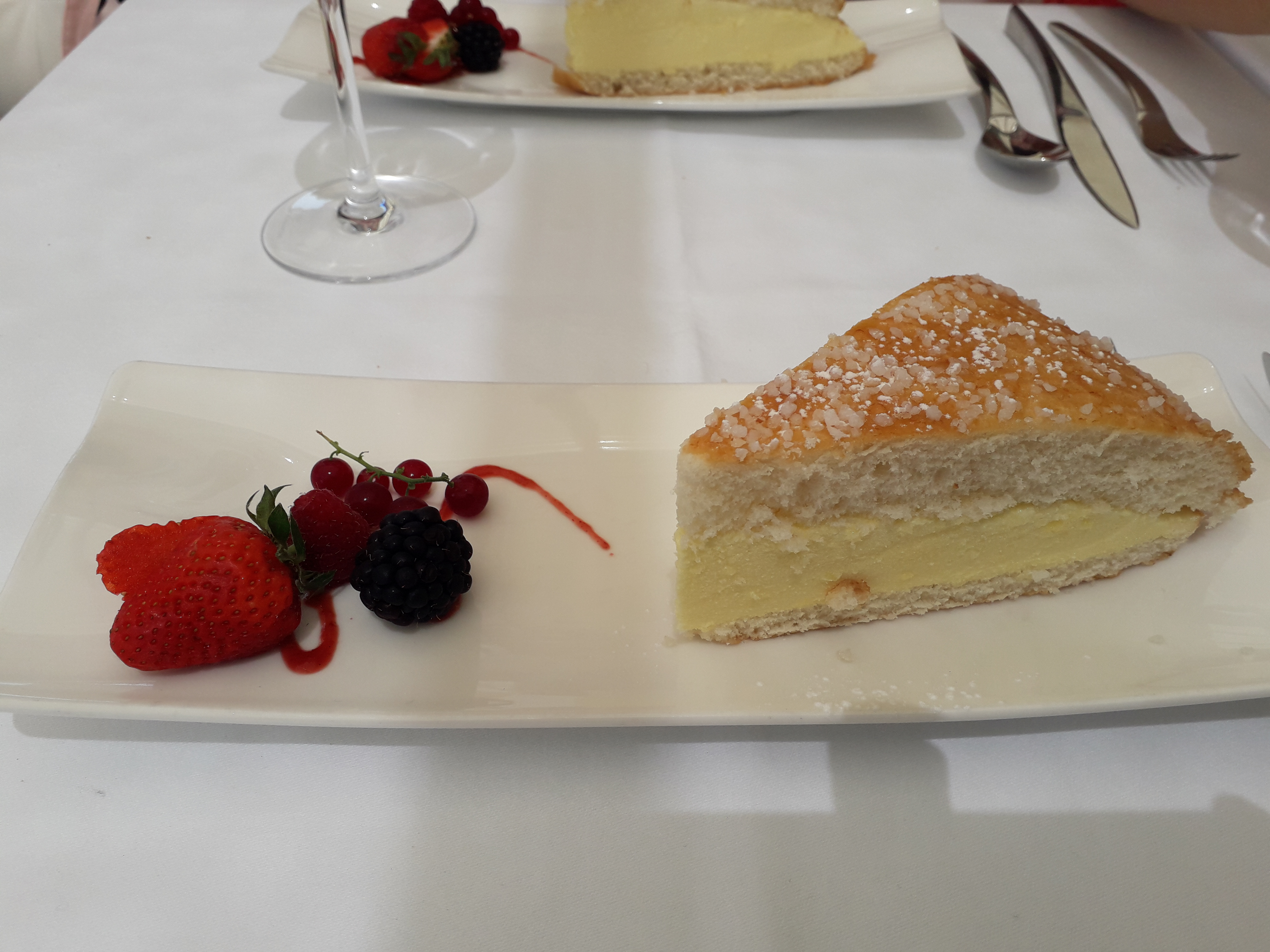 Beau et bon resto, nous avons pris le plat du jour ( loup et écrasé de purée ) joliment présenté avec quelques légumes, cuisson parfaite, et la tarte tropeziene délicieuse.