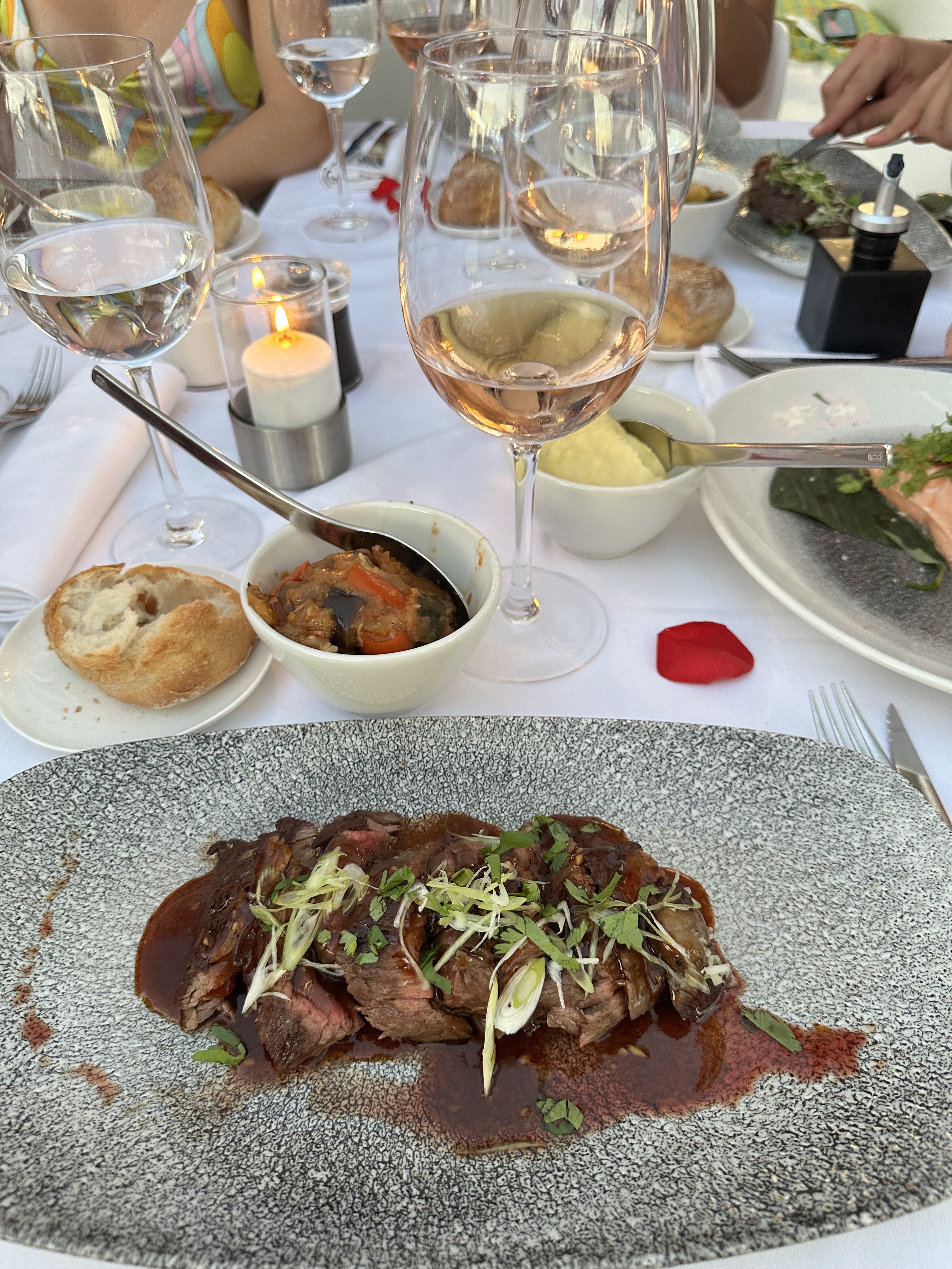 Le rosé excellent (domaine la Rouillere) , très bonne cuisine, service impeccable, chanteuse et danseuses juste wouaw! Merci Le Quai une fois de plus pour nous avoir fait passer une soirée au top 👌