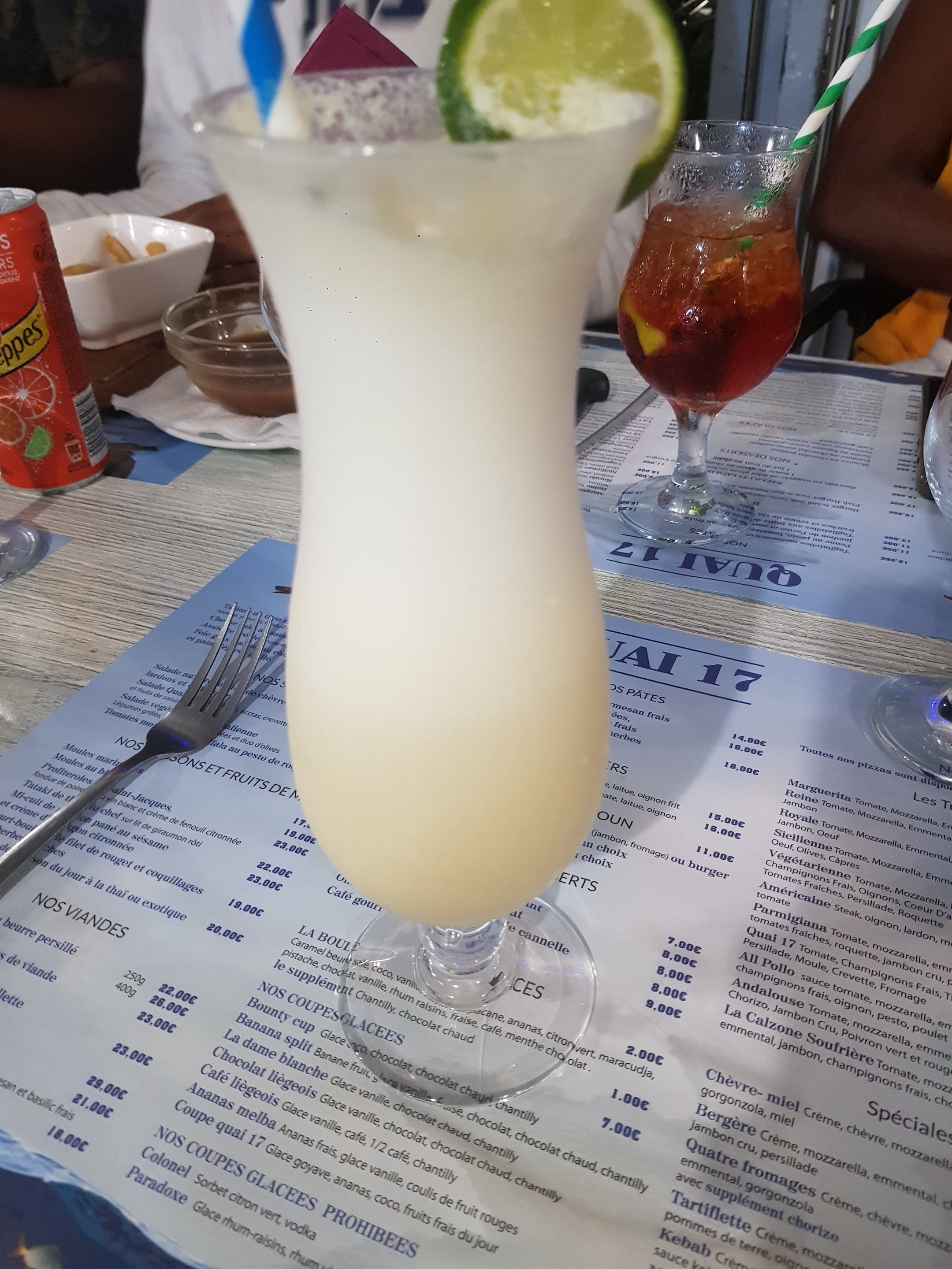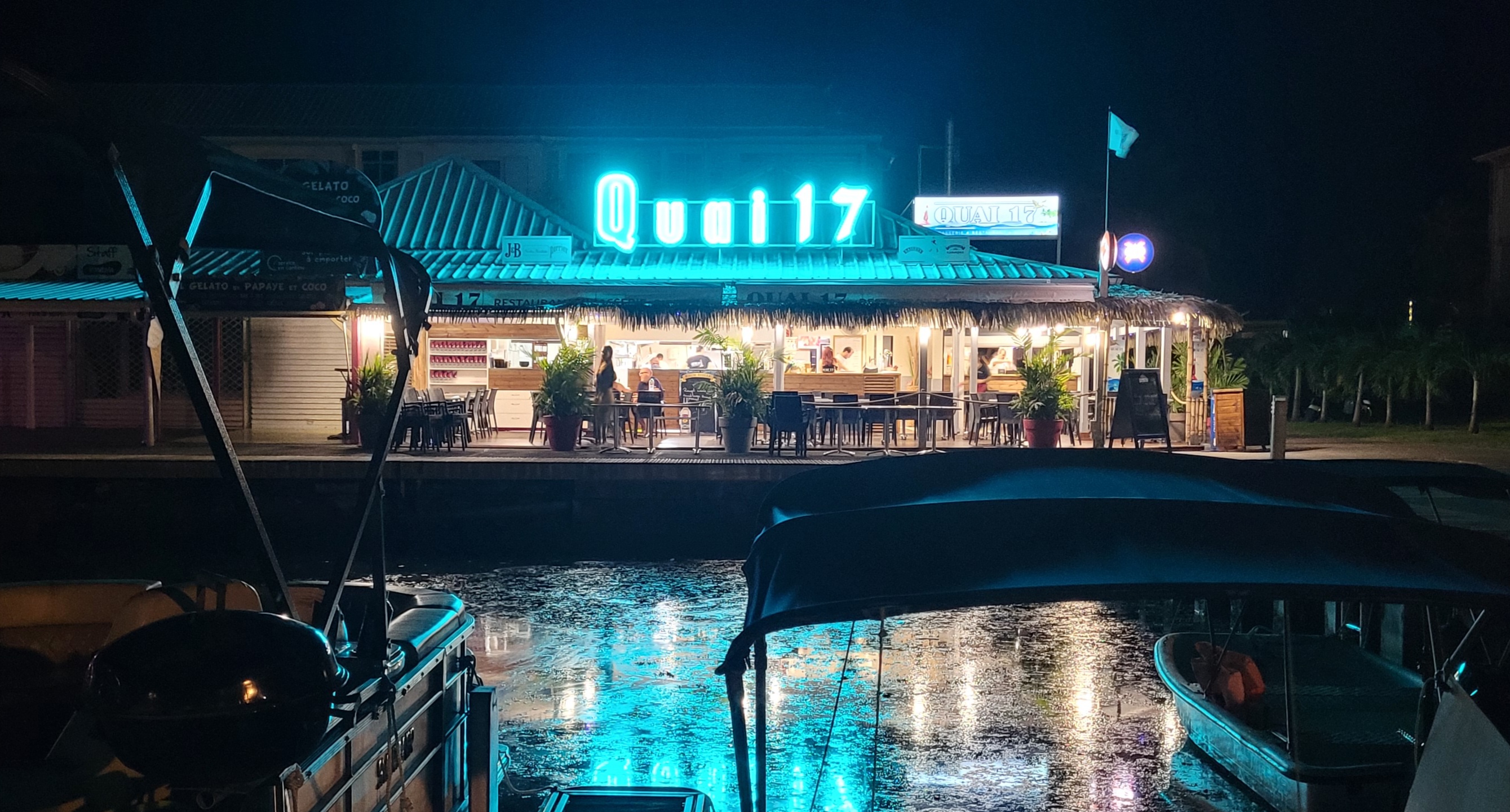 Nous nous baladions sur la marina à la recherche d’un restaurant. La carte du Quai 17 me plaisait énormément alors nous nous sommes installé. Un serveur vient nous voir pour nous informer qu’il s’agit d’une table réservée et que le service est complet. La gérante vient à son tour pour nous en informer, puis nous trouve une solution et LÀ la magie commence. Elle nous installe une table supplémentaire devant le restaurant, l’impression d’être privilégié le temps d’un soir. Les cocktails étaient super bons ! En entrée, nous avons pris des accras de Morue qui portent bien leur nom ! Ils étaient excellent, on sentait super bien la morue à la différence de tous les autres que nous avons goûté sur l’île. En plat, fish burger pour monsieur, pizza fruits de mer pour papa et moule roquefort pour moi. Tout était excellent ! D’ailleurs mention spéciale pour le burger, un petit croc dedans m’a suffit pour voir la haute qualité du burger: pain maison, poisson frais pané. En dessert, flan coco, café gourmand et mousse au chocolat. Tout le monde était très content. La mousse au chocolat était savoureuse et pas trop sucrée. La serveuse était vraiment agréable et souriante. Gros coup de cœur pour Véro, la gérante, qui est d’une grande sympathie et qui vient vous voir pour savoir si tout se passe bien et si les plats nous convienne. Vraiment un grand bravo ! C’est très rare que tout soit bon de l’entrée au dessert dans un resto et là en prime vous avez le service qui est génial. Allez y les yeux fermés !
