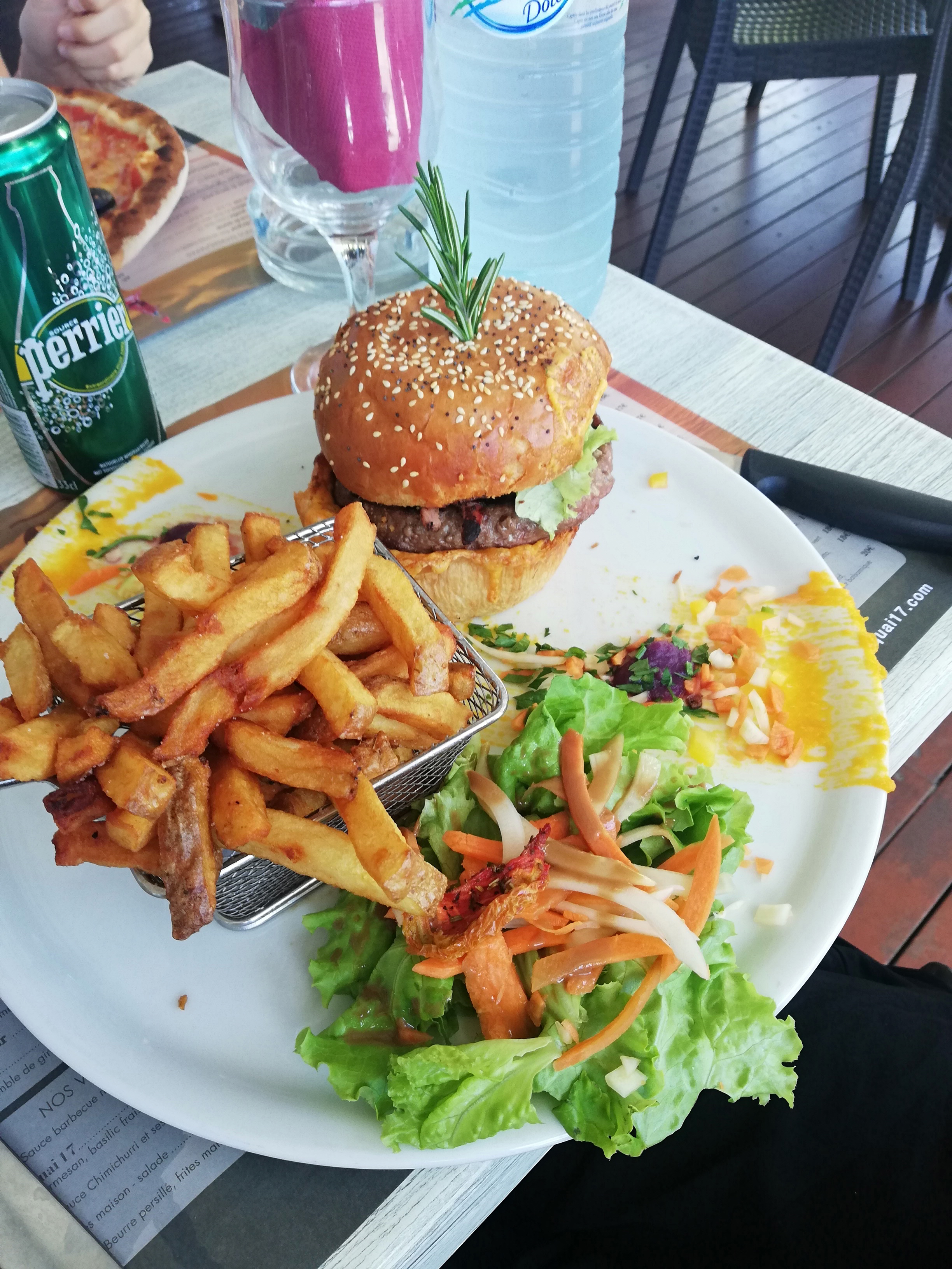 Brochette de bœuf demandé sans salade et un burger quai 17....Vraiment super. On recommande. Le personnel est sympathique. La mousse au chocolat est incroyable (manque la photo🤣)