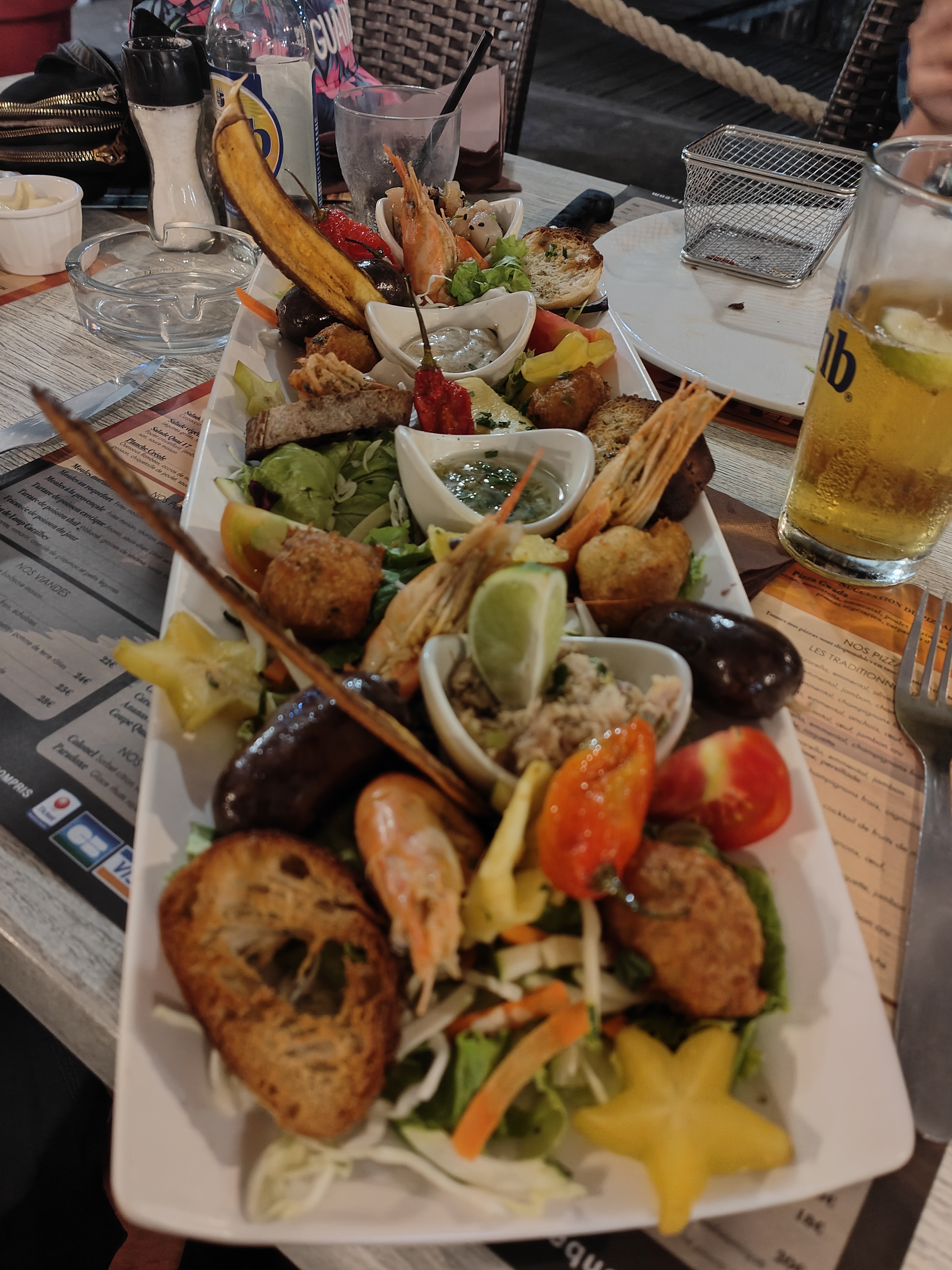 Bonjour .... sur la marina de st François .... c’est l’endroit où il ne faut pas y aller ... alors certes l’accueil est acceptable et bien sûr on sait , on devine , et on voit que c’est pas gastro.. de toute façon à la vitrine on s’en rends compte ... mais de là à être aussi mauvais .... j’en ai même pitié pour eux.... quoique pour eux nous ne sommes que des portes monnaies touristiques ... et pourtant sur l’île on trouve facilement et pas forcément cher de la qualité et du vrai menu créole .... ici photo d’une pseudo assiette créole 😤, les accras sont très moyens pour pas me planter je décide d’une assiette pâte carbonata... et bien là bingo cuisson très moyennes et le goût bof.... quant au bol de sauce créole sauce chien déjà servi , trouble de gras des autres on s’est dit que le fond était proches .... pas de dessert pas de café on avait déjà trop donné à ces gens là monsieur ..... laurent CHOLET