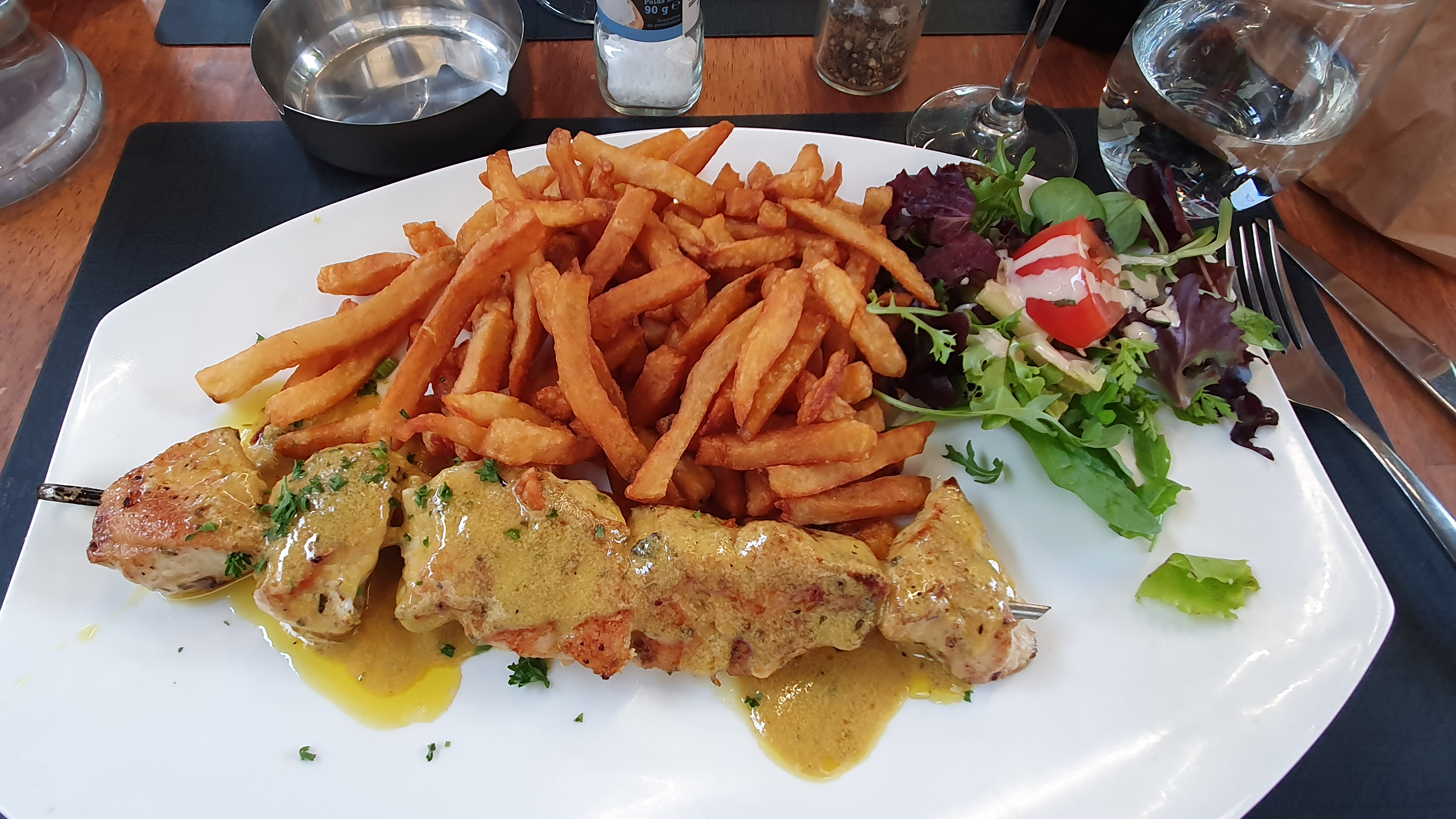 Nous sommes venues un samedi soir et avons été ravies de la qualité et présentation des plats (frites maison et brochette de poulet mariné excellent), personnel très souriant et attentionné, super rapport qualité prix On recommande