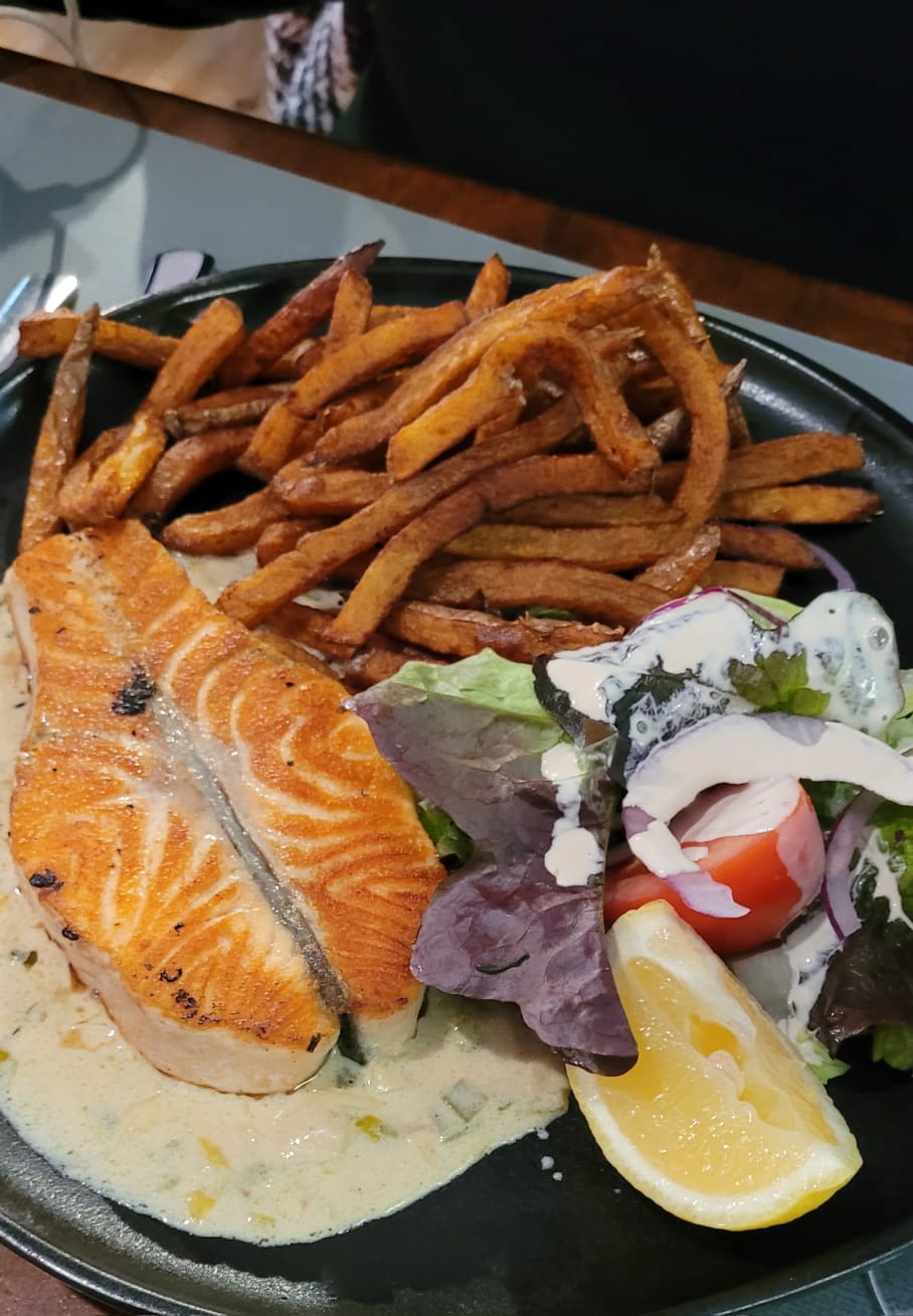 Un bon accueil, un serveur assez speed, Cocktail mojito très bon, le Virgin mojito aussi. L’entrée chèvre chaud est bien copieuse est bonne, j’ai pris des moules gratinées, je ne l’ai pas trouvé gratinée, le fromage était juste fondu c’était assez gras en bouche. Le pavé de saumon bien cuit avec une bonne sauce Le frire un peu trop cuite l’escalope de veau au parmesan était bonne ce n’est pas indiqué sur la carte mais il y a du bacon avec. Les desserts sont fait maison les profiteroles sont très bonnes