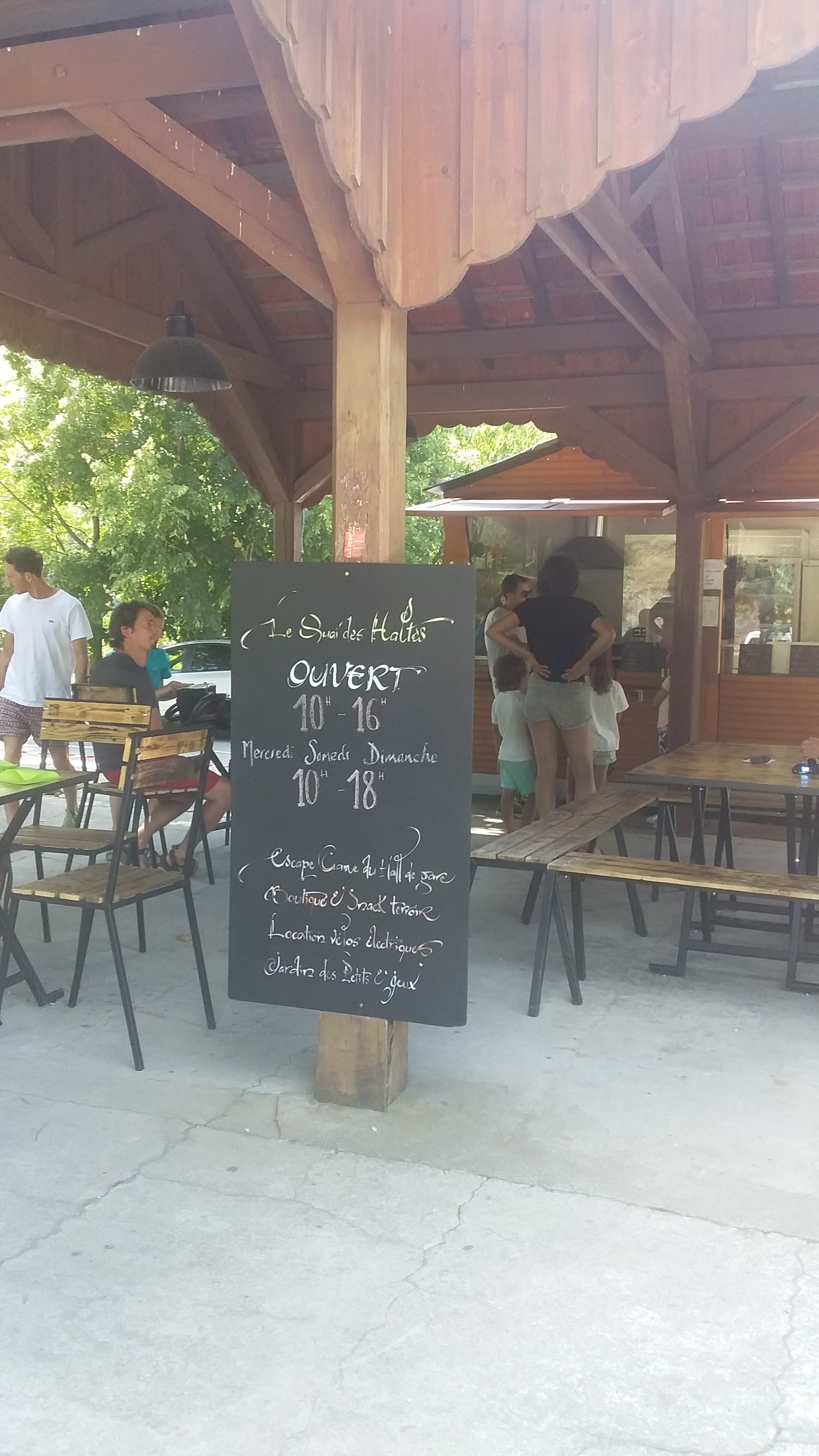 À ne pas manquer si vous parcourez la Dolce Via 🚴 Nous sommes restés quasiment 3h dans cet endroit inqualifiable : bar ? Restaurant ? Aire de jeu pour enfants (et grands) ? Bar à jeux de société ? Escape game ? Le quai des haltes c'est tout ça à la fois 😍 On s'est régalés autant par les activités proposées, que la planche à partager, mais aussi des bières, des glaces et de l'accueil des gérants. Ambiance à la cool, ici on prend le temps et ça c'est vachement bien 🧘♂️ Tout est fait maison ou par des producteurs locaux. Encore une belle découverte, merci pour l'accueil 👍