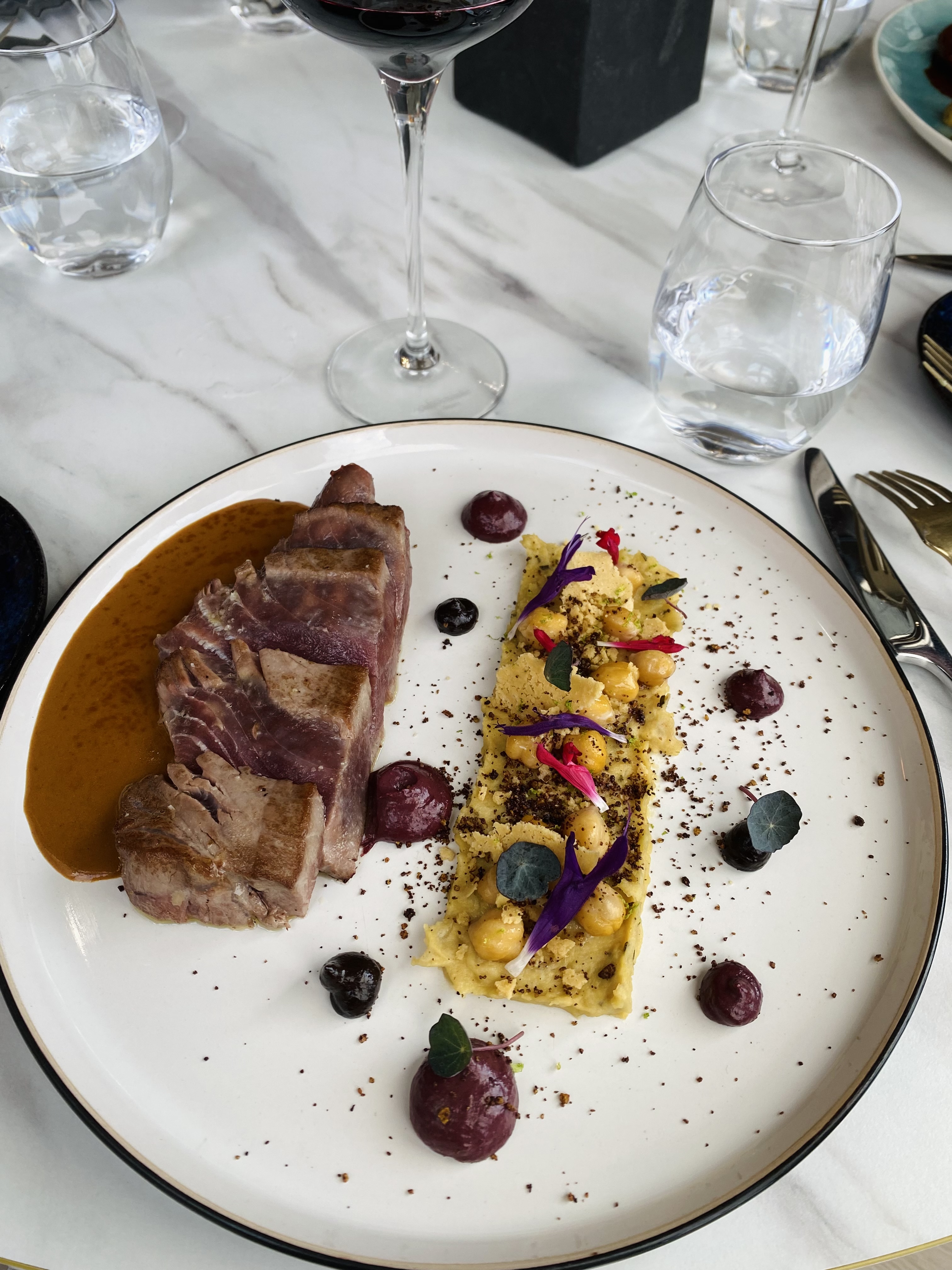 Parfait sur tous les points avec une prestation très soignée des assiettes. Deux observations : la disposition de la table impose au serveur de passer devant les convives et musique d’ambiance légèrement trop forte à notre arrivée.