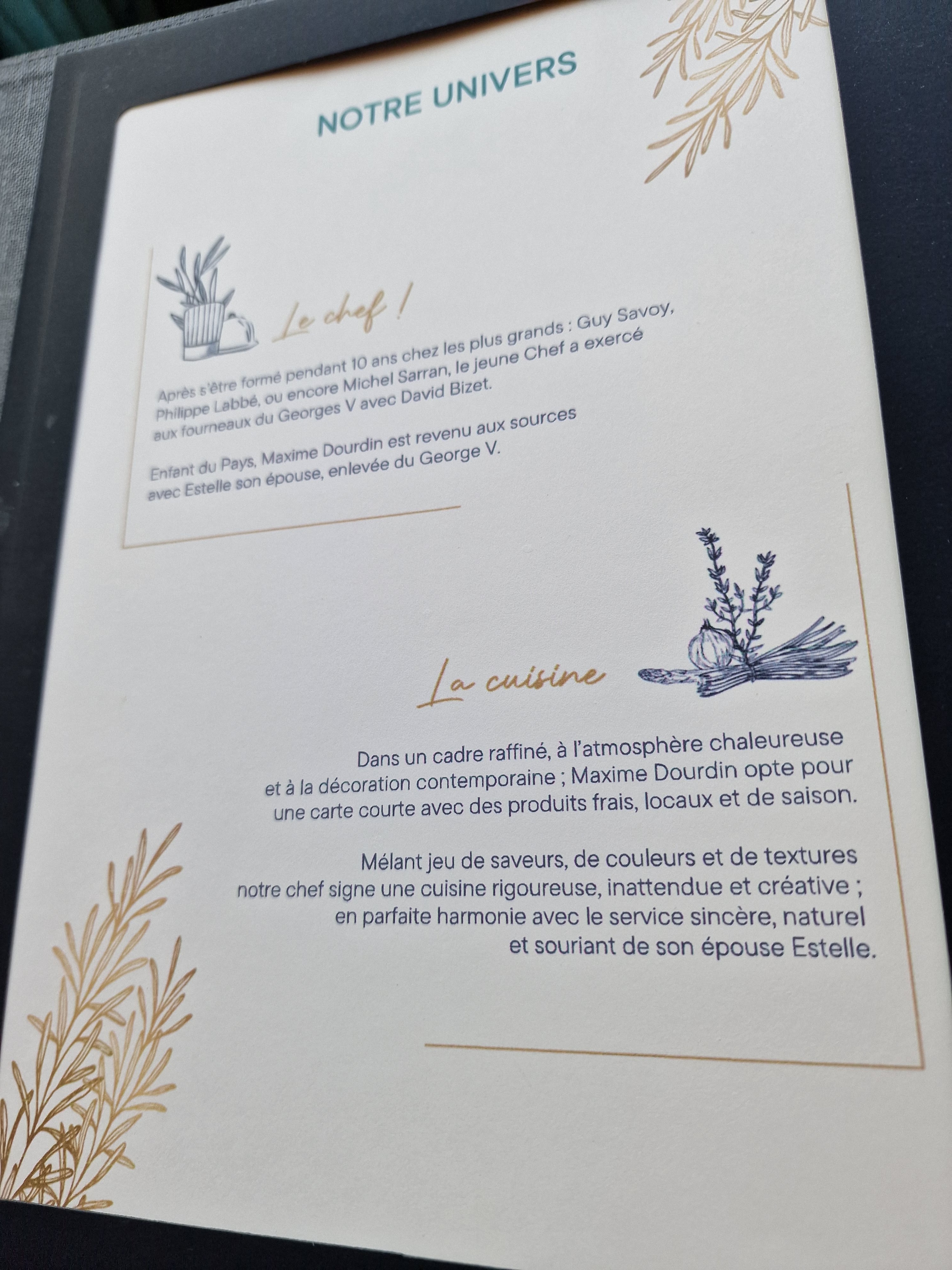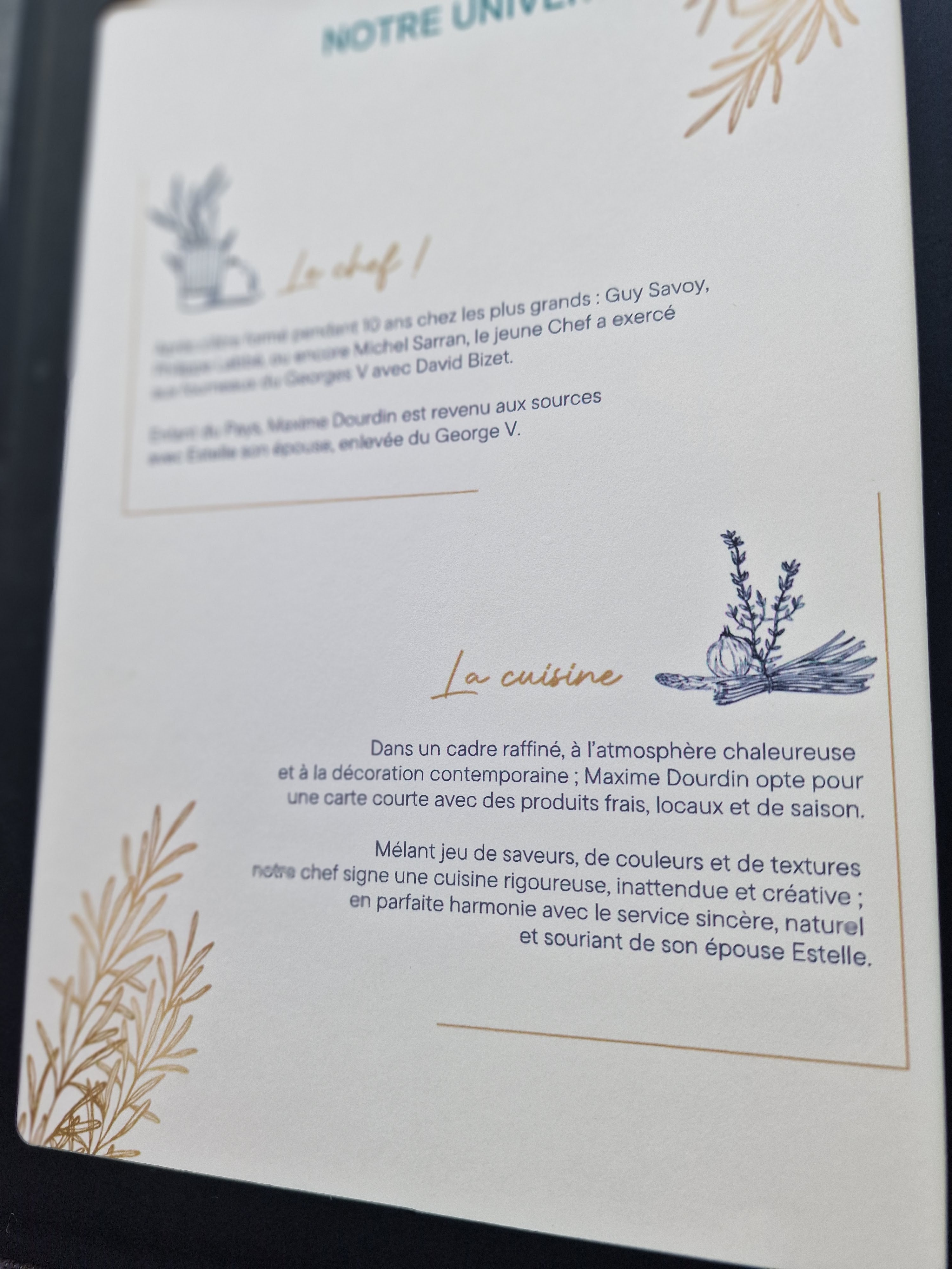 Nous garderons un excellent souvenir de notre anniversaire de mariage ! Accueil très chaleureux et agréable, sourire sincère et cuisine pleine de saveurs ! Le restaurant est bien nommé. N hésitez surtout pas si vous voulez déguster des produits de saison mariés à des saveurs herbacées et florales. Excellent choix. Merci au chef et à sa délicieuse épouse sans oublier le serveur très professionnel. Brigitte et Jacques