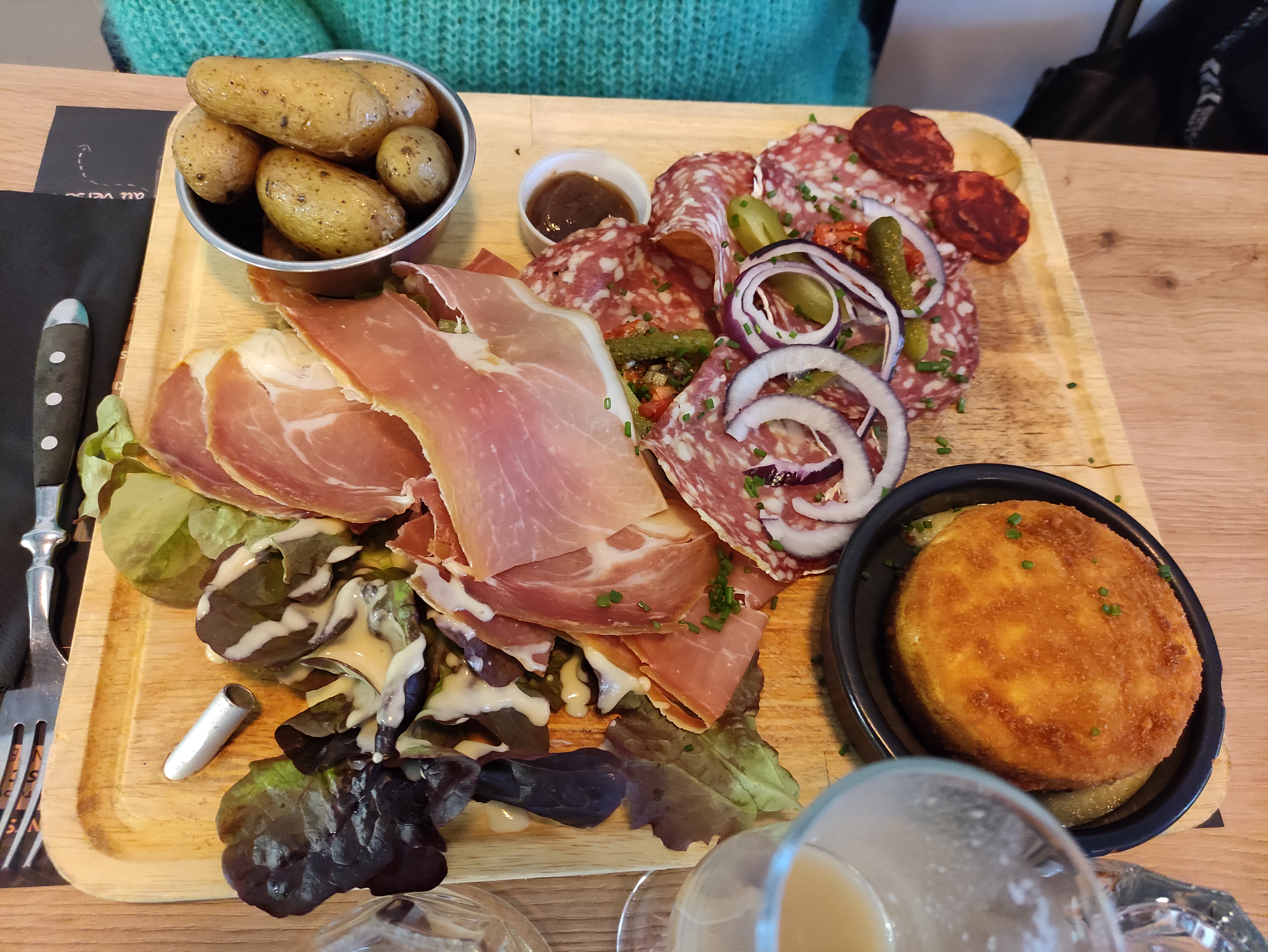 Bonjour, très bon accueil, équipe souriante et agréable. J'ai craqué pour le demi camembert rôti... Un plaisir des papilles ! Charcuterie au top. Presque un peu trop même me concernant mais j'ai terminé. Salade parfaite. Mon accompagnatrice avait pris le saumon. Cuisson parfaite et saumon nickel. Café gourmand parfait également. J'ai trouvé l'addition en rapport avec la qualité des plats et du service. C'est honnête. Autre point positif, c'était blindé, les tables pour deux sont grandes et nous n'avons pas été dérangés par le bruit, tables très espacées, mine de rien c'est assez rare. J'ai deux petites réflexions, le vin, un Chinon n'était pas frais, mais la serveuse a eu la délicatesse et gentillesse de nous mettre un seau à glace (merci). Cependant le vin n'est frais qu'à la fin. Je sais qu'il n'est pas évident de stocker du vin au frais quand on a autant de tables. Je trouve que les quantités sont un poil excessives. Comme dit ma grand mère mieux vaut plus que pas assez... C'est pas faux. Bref, nous avons passé un très bon moment. Merci à l' équipe !