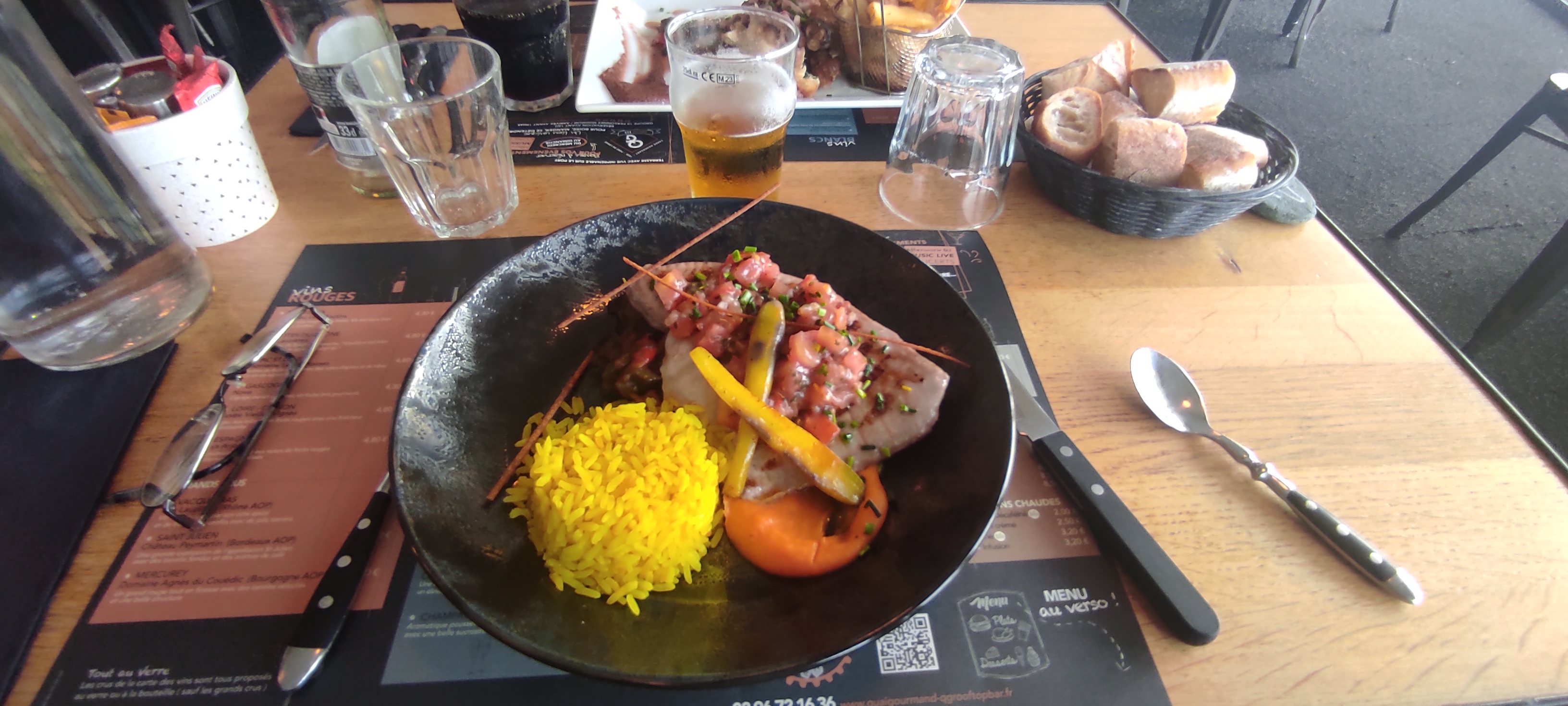 Tres bon,frais,bien cuisiné, généreusement servi avec quelques bons vins aux verres. Trés bon rapport qualité prix