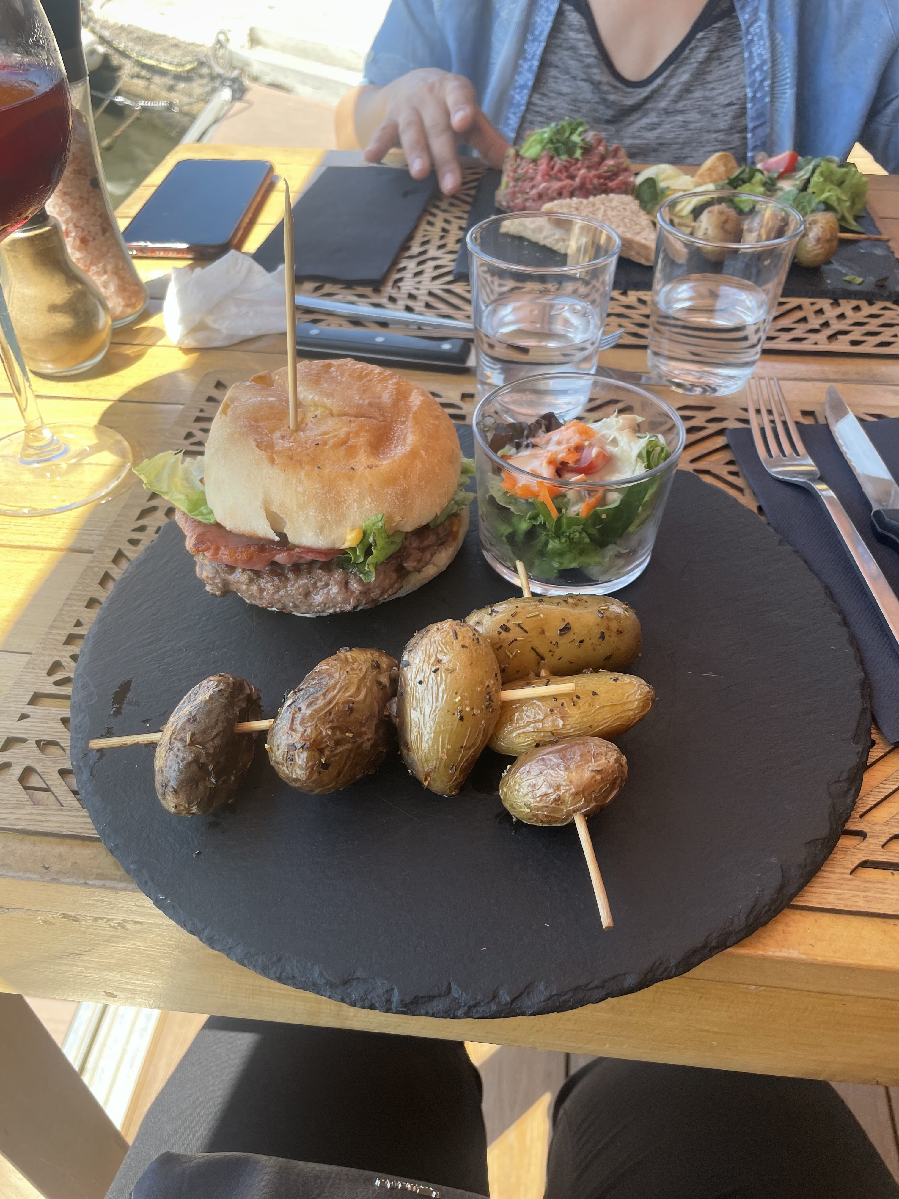 Je n'ai pas l'habitude de laisser un commentaire mais là c'est honteux.. Comment ce restaurant peut-il avoir un 4,5/ 5 ? J'ai commandé un simple burger qui est arrivé froid avec les frites également froides voir glacées ! je l'ai stipulé à la serveuse qui m'en a ramené un autre - de 5 min après en me disant que le burger à été refait entièrement ce dont je doute fort. La première fois le pain était moelleux puis revenu friable comme si il avait été passé au micro-ondes. Pour un burger a 17 euro, il n'est pas mieux que celui d'une chaîne américaine voir moins bon !! Pas de carafe d'eau proposée pour avoir fait beaucoup de restaurant du coin cet été, c'est le seule à ne pas en proposé. Ne parlons même pas du tartare de saumon commandé par ma compagne. Bref à part le cadre sympa et la serveuse aimable, endroit complètement surcoté.