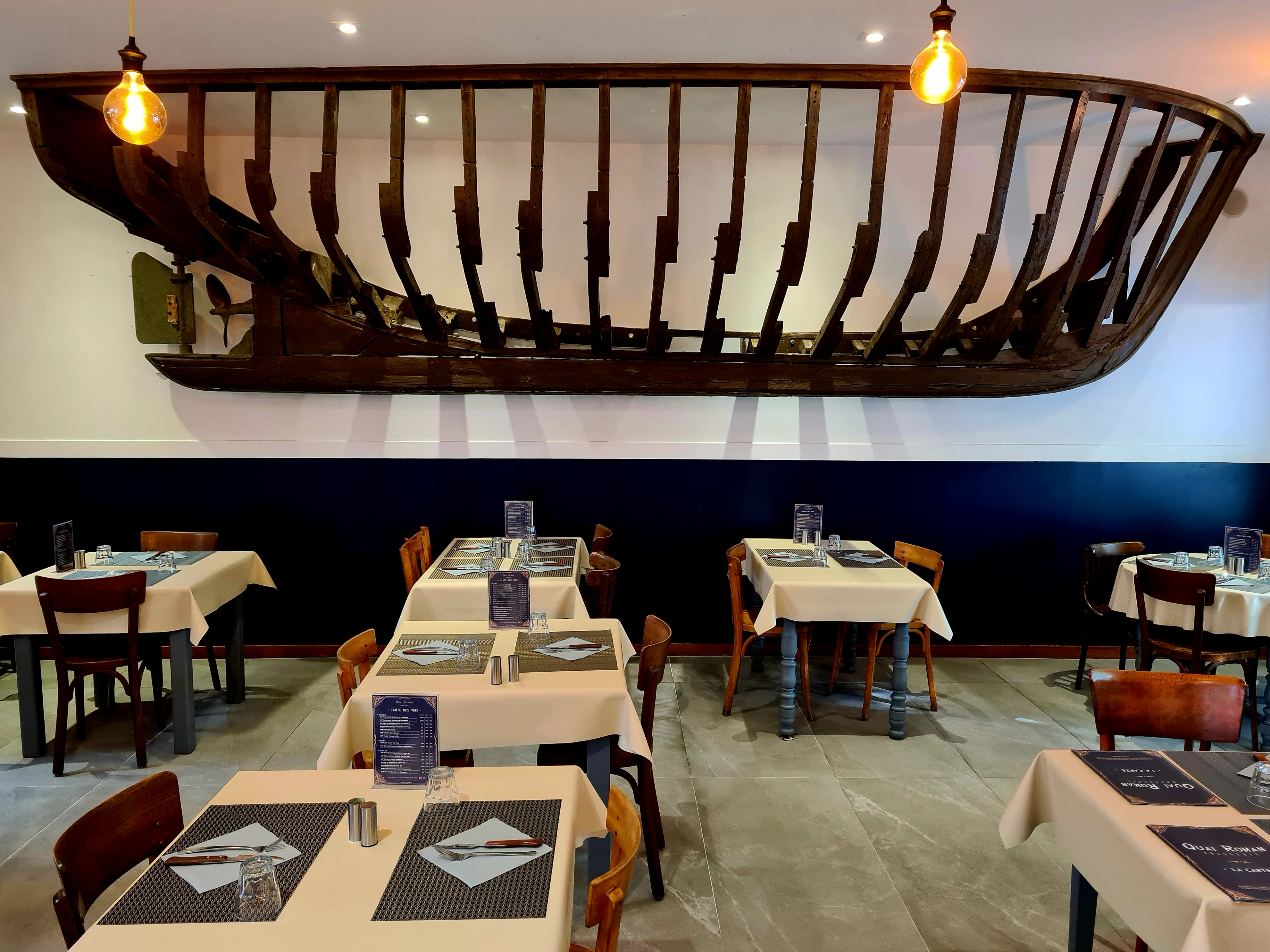 Cuisine goûteuse de bonne qualité. Carte des vins variée, tous disponibles au verre au pichet ou à la bouteille sans abuser sur les tarifs. Parton et serveuses sympathiques. À l'intérieur, vous pourrez admirer la structure d'une demi chaloupe, intégrée dans le mur.