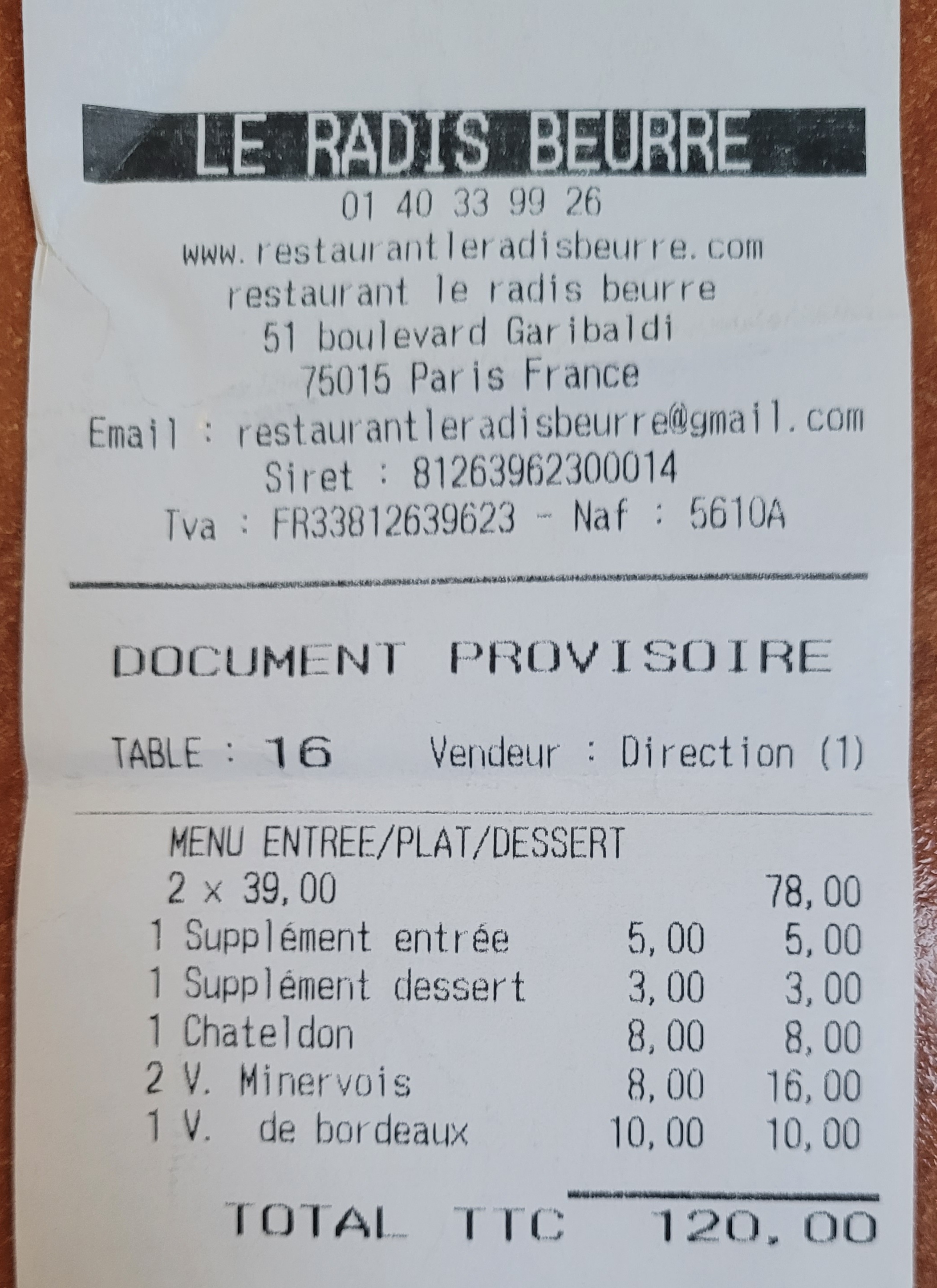 Excellent bistrot du XVe Paris ! L'un des meilleurs restaurants de la région. Le prix d'une formule trois plats (entrée, plat, dessert), pour avril 2019 = 36 €. Je recommande de visiter. Possède un Bib Gourmand de Gide Rouge Michelin.