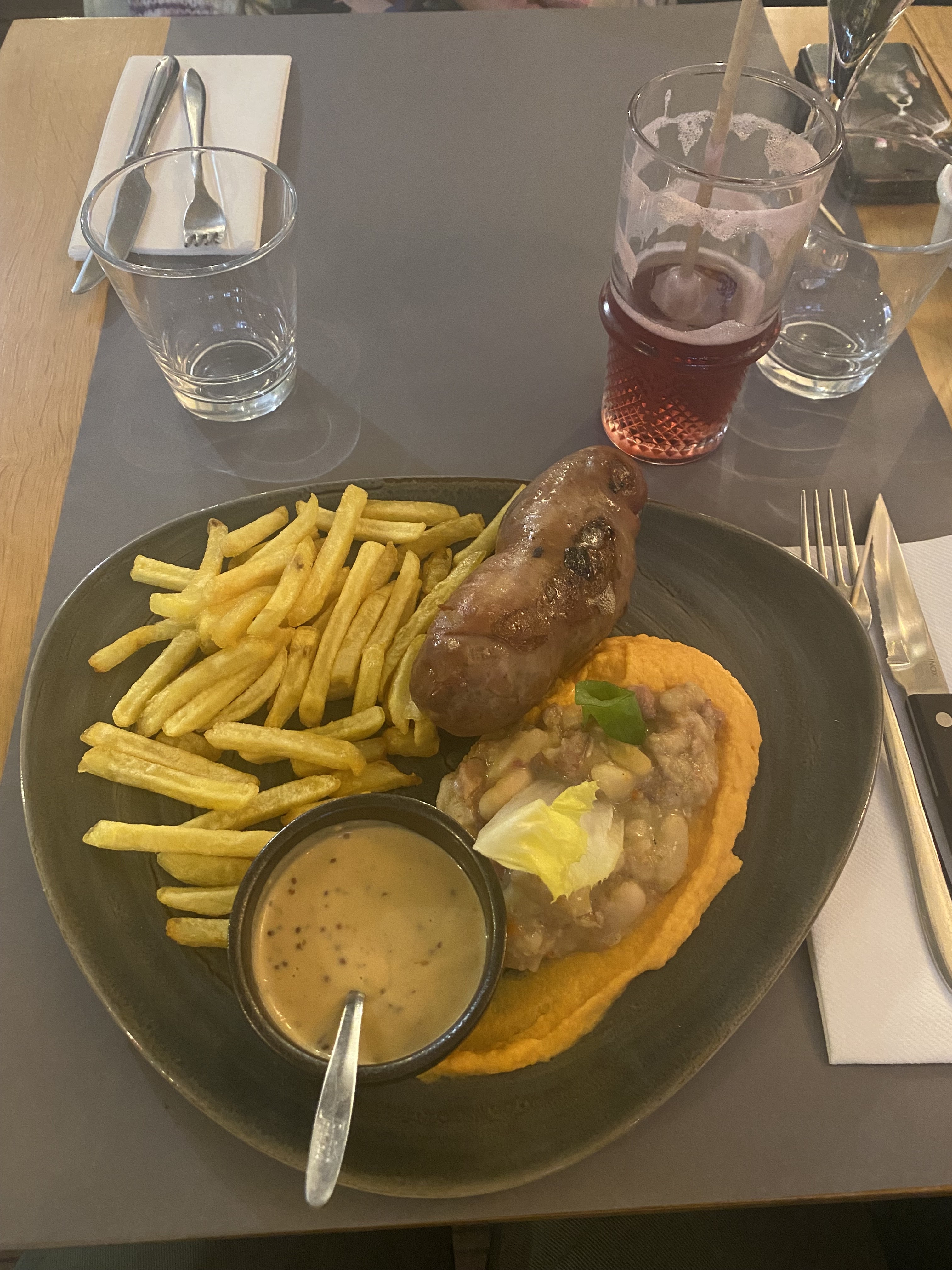 Lieu et service sympa, menu à 25€ dans lequel ma pièce de boucher c'est transformée en brochette dans laquelle la viande était très dure .... Et ce malgré la présence sur le menu et les tables du restaurant d'un label d'exception pour la viande.... Dommage 😞